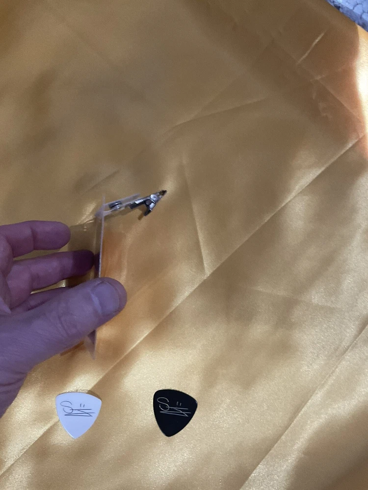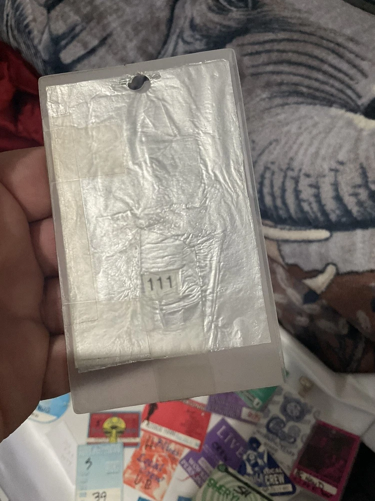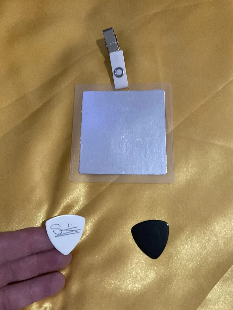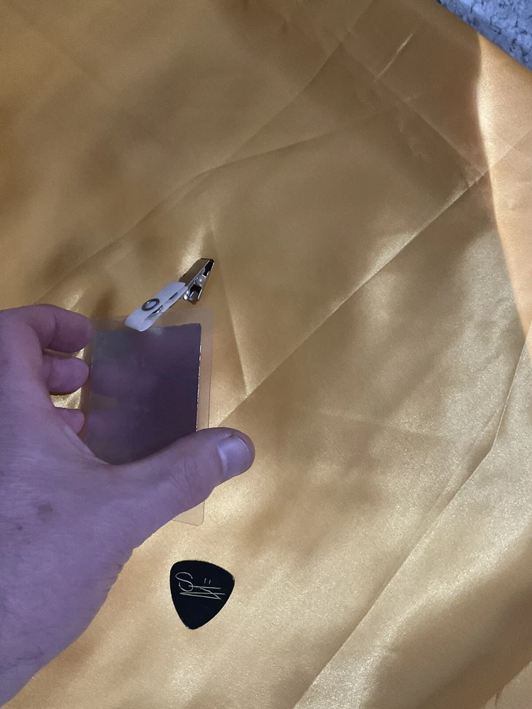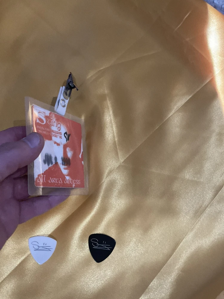 Black and White Sting Bass guitar picks from July 1996 Virginia Beach amphitheater local crew pass ,aluminum foil on back of pass was so employees could be easily seen when walking in the crowd ,actual pass is made of fabric, mass for pictures are for proof of employment and location and are not for sale in this listing.
