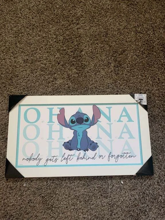 Bring the magic of Disney to your home with this Stitch themed wall art set. Featuring two pieces, one with 'Aloha' and Stitch on the beach, and another with 'Ohana' and the heartfelt message 'nobody gets left behind or forgotten.' Perfect for adding a touch of whimsy and warmth to any room.