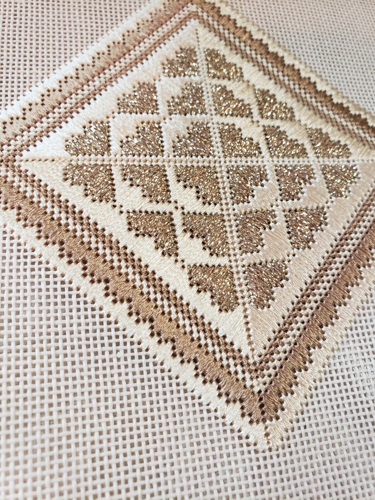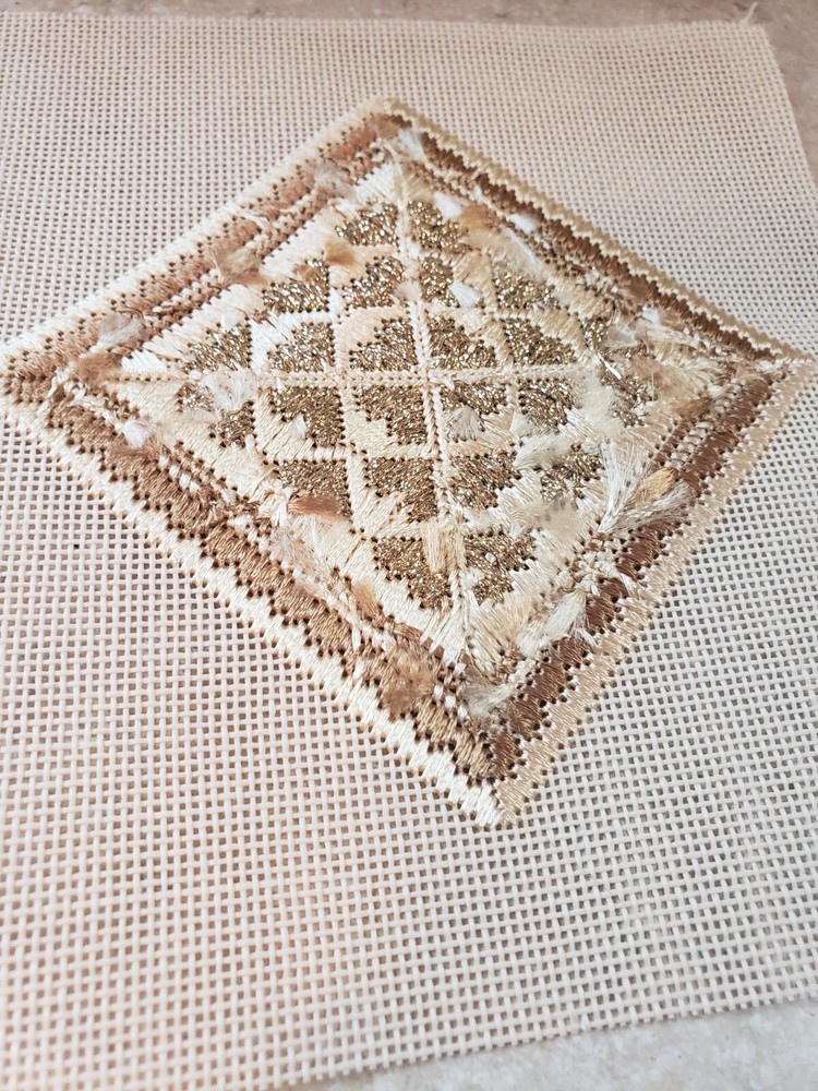 Canvas is fully stitched and ready to be finished into an ornament. Stitched area measures 3.75" x 3.75".