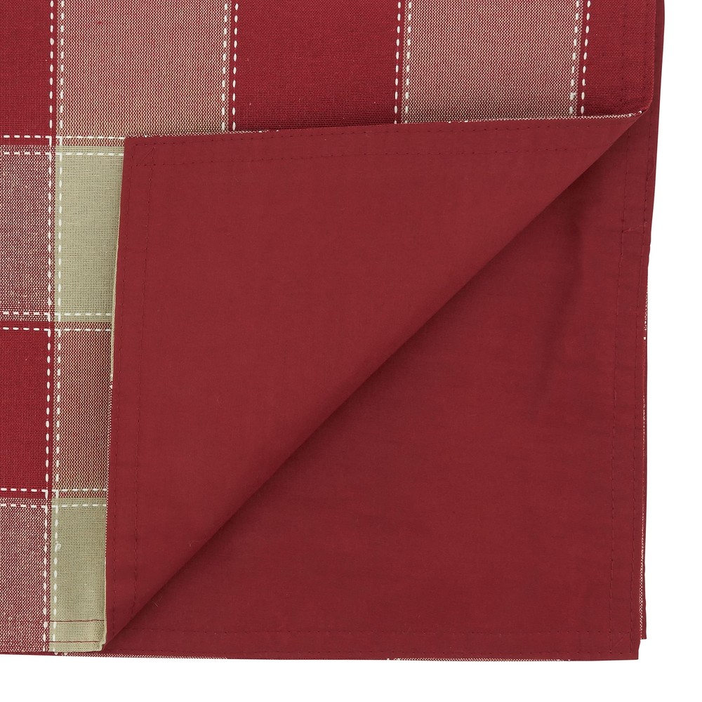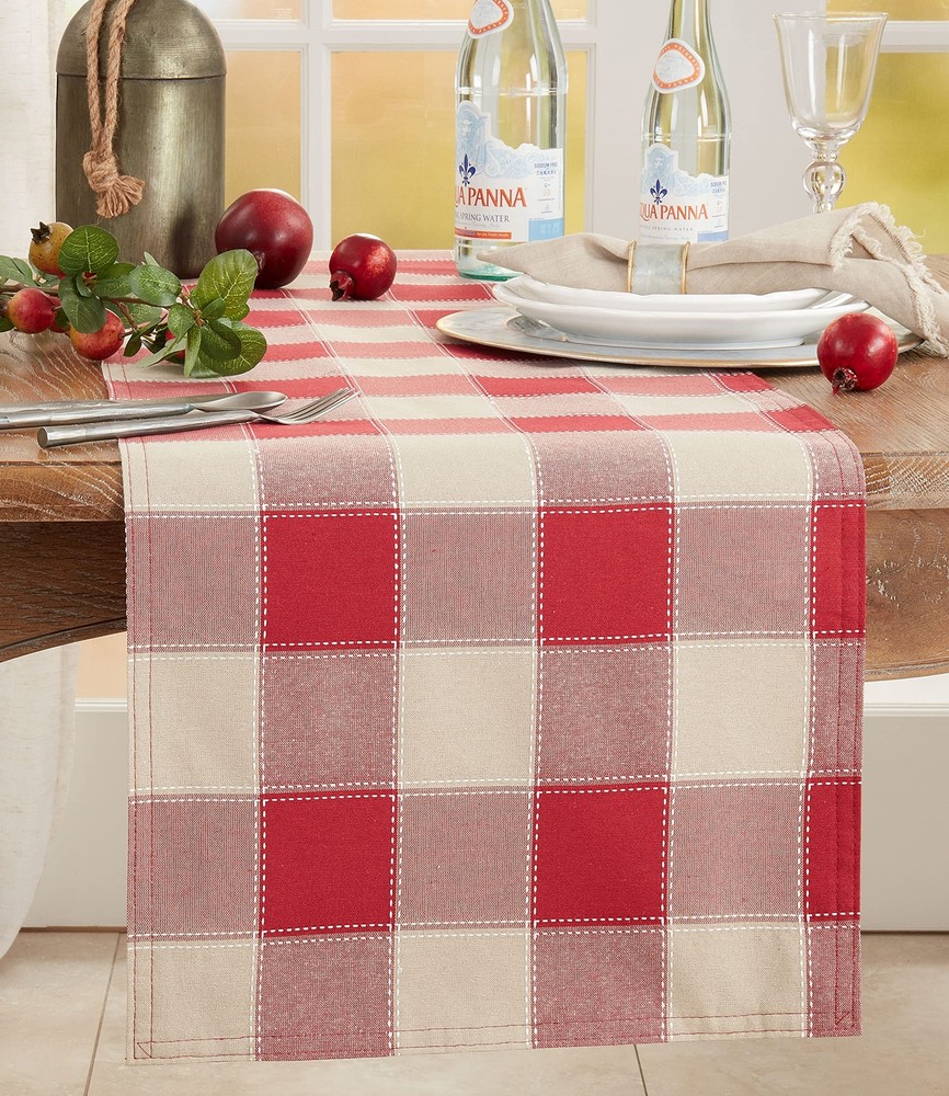 A wonderful combination of plaid design and double stitch accents, this unique Stitched Plaid Table Runner adds beautiful texture and dimension to your tabletop. It lends a natural look and feel, which makes it easy to pair and fit for any casual occasion. Highly durable, the runner will quickly become your go-to piece for table décor. Size: 16"x72" Design is not reversible Runner has a 100% polyester lining Cotton poly blend, loved for being low wrinkle and easy care. Material: 55% cotton - 45% polyester + Care: warm machine wash, do not bleach, hang dry, do not iron