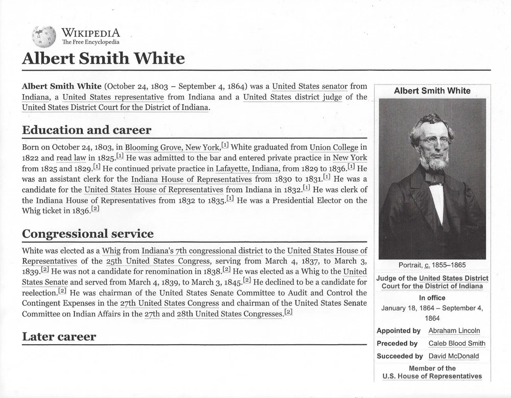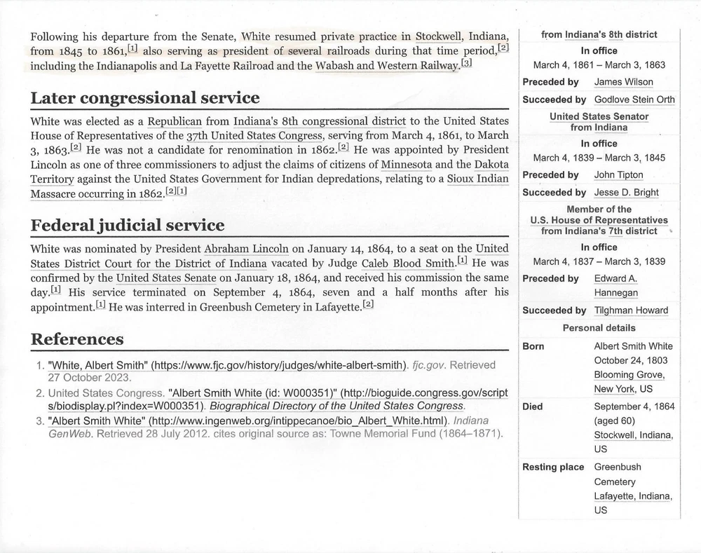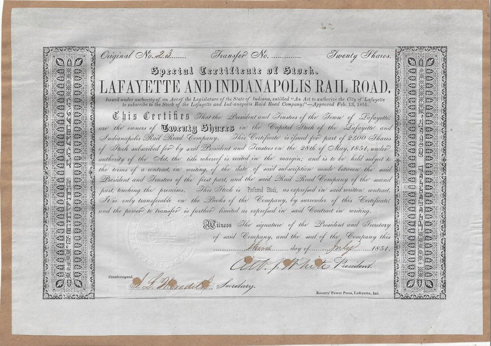 Lafayette & Indianapolis Railroad Company Ran between the two names cities Special Certificate of Stock Printed 20 Shares Capital Stock Certificate for 20 shares, #23 , Dated 1851 In Black on blue/gray paper President is Albert Smith White. Appointed by A. Lincoln to be a US District Court Judge in Indiana Biography included ** NOTEWORTHY ** Stock is glued to a piece of brown paper. Could beremoved PRINTER: Rossers' Power . Lafayette, Ind. Shown image copies are included with certificate Images: POSTAGE U.S. Sent First Class with tracking, starting @ $6.00 US Canada Sent First Class Canada with no tracking, starting @ $6.00 US NON U.S, case by case, starting @ $8.00 US, sent First Class. I do ship world wide. -- All the certificates and all other items I sell are sold as collectibles only; although they are authentic, they no longer hold financial value. I do have other items up for auction. I Do Combine