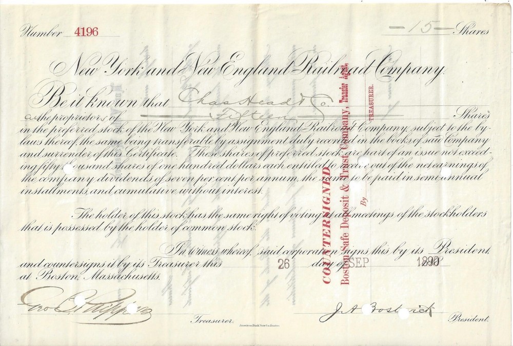 New York and New England Railroad Company Boston, Massachusetts PREFERRED Capital Stock Certificate for 15 shares, #4196 , Dated 1890 (188-) In BLACK ** NOTEWORTHY ** PRINTER: American Bank Note Co, Boston Information image copies are included with certificate Images: POSTAGE U.S. Sent First Class with tracking, starting @ $6.00 US Canada Sent First Class Canada with no tracking, starting @ $6.00 US NON U.S, case by case, starting @ $8.00 US, sent First Class. I do ship world wide. -- All the certificates and all other items I sell are sold as collectibles only; although they are authentic, they no longer hold financial value. I do have other items up for auction. I Do Combine