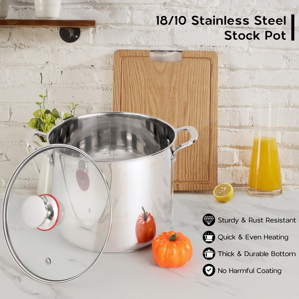Healthy Material: the pasta pot is made of food-grade 18/10 stainless steel, no toxic coating to worry about chipping, would not react with food for safe cooking, also rust and corrosion resistant for long life Fast Heating: the soup pot has a sturdy structure that is not easily deformed, as well as good heat conductivity, so it heats up evenly and prevents hot spots, allowing you to save energy while cooking faster Stock Pot with Lid: tempered glass lid is easy to monitor your food’ s progress without releasing heat or flavor, the small hole of lid for venting excess vapors keeps the air flowing and avoids spilling out Exquisite Craft: the steam pot has flat rim for easy pouring and won’t hurt your hands, double rivet handles for a firm grip, and the mirror polished surface makes it as smooth as new and helps less food stick Large Capacity: the 12-quart stock pot is the ideal size to prepare delicious meals for a crowd and is compatible with most stovetops, dishwasher and oven safe, and easy to measure with an internal scale