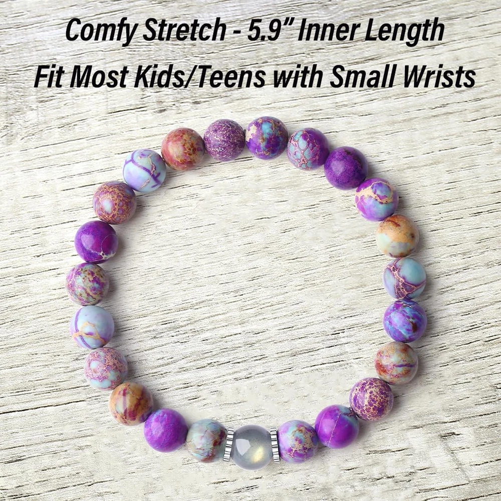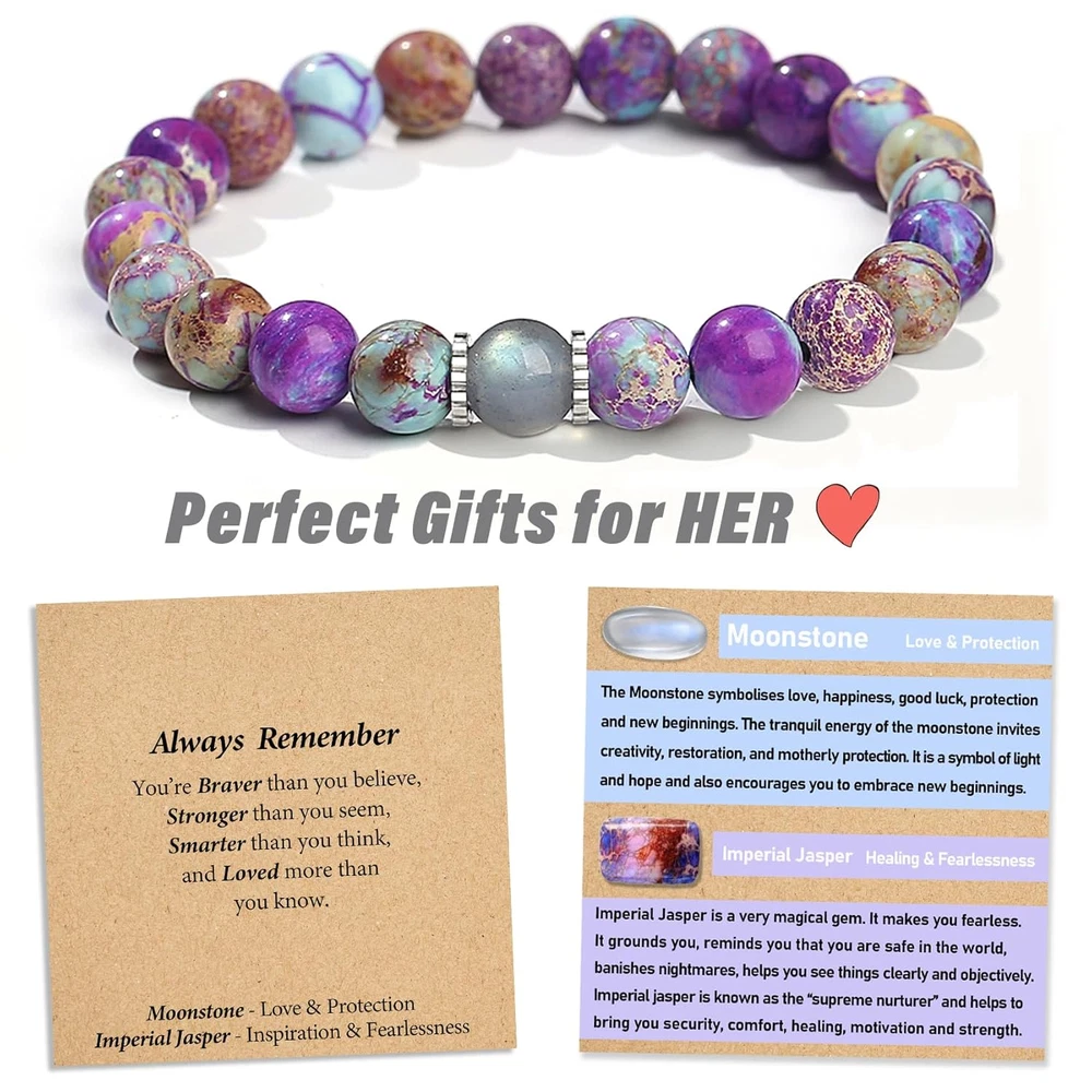 【Beaded Bracelets for Teen Girls】This handmade bracelet comes with a backing card which features the text 'Always remember you are braver than you believe...'. It is then presented in a nice gift box. Imperial Jasper makes her fearless and brings her security and strength. The moonstone is excellent to help purify stress or anxiety, bring her love and protection. This bracelet for teen girls works great as teen girl gifts, birthday gifts for girls, Valentines Day gifts for her. 【Unique Design & Solid Craftsmanship by Great Artisan】Every natural bead is high quality genuine gemstone and has been carefully selected manually one by one. Original design and coming with meaning card make sure your gift is unique and a big hit to her. Solid Craftsmanship make sure it's super comfortable for daily-wear and will not easily fall off/come apart. This meaningful and beautiful crystal bracelet can be worn and encourage her for a long time. 【Stretchable Design & Fits Most Girls】This beaded bracelet for girls is stretchable, 5.9 inches inner length, it fits well, nice and tight for most girls or adults with small wrists, so you don't have to deal with sizes. It's really convenient,elegant and very easy to put on and take off. 【Packaged with Care & Giftable】The charm bracelet has been packaged with care by environmentally friendly materials. This sweet bracelet is great as teen girl gifts ideas, Christmas stocking stuffers for teenage girls, Valentines day gifts for teen girls, birthday gifts,daughter gift from mom dad, best friend gifts, inspirational gifts for her, Easter gifts, confirmation gifts for teenage girl, first communion gifts for granddaughter niece daughter. 【Risk-free Warranty】 100% money back if not completely satisfied. We take great care to ensure that each and every piece of jewelry or gift leaves our workshop looking fabulous, and each order is sent out carefully wrapped and presented in a cute gift box ready to gift. “Always remember you are braver than you believe....” Imperial Jasper makes her fearless and brings her security and strength. The moonstone is excellent to help purify stress or anxiety, bring her love and protection. Stretchable Design & Fits Most Girls. Packaged with Care & Giftable. This bracelet for teen girls works great as teen girl gifts, birthday gifts for girls, Valentines Day gifts for her, best friend gifts for women, Christmas stocking stuffers.