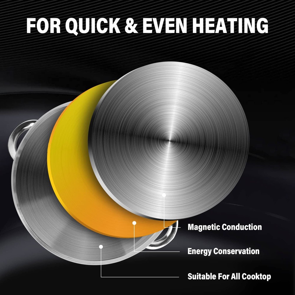 The Standard glass lid Stainless Steel Stockpot with made with polished stainless steel with An aluminum disc layered in the bottom. The aluminum disc layered bottom provides even/quick heat distribution and prevents hot spots. Deep stainless steel riveted handles offer durability and stay cool. Works on gas, electric, glass, ceramic, halogen, etc. Oven safe to 350F. Tempered glass lid with steam vent to view food while cooking ✅ 【Multifunctional】Stockpots with lid, versatile and sufficient for home daily use, for multipurpose function: simmering stocks & soups,canning, pasta, stewing sauces ect ✅ 【Beautiful and easy to an clean】Stock pots Reflective finish inside and out for appearance and easy cleaning; Flat base and lightweight for storage and sits evenly on cooktops ✅ 【Tempered Glass Cover】Tempered glass lid with steam vent to view food while cooking,this pot have a tri-ply bottom for even heating ✅ 【Healthy Steel】No Non-Stick Coating,General non-stick coating cookware releases toxic fumes when cooking; As it becomes worn, the risk of ingesting Teflon increases drastically. Our stainless steel cookware does not apply any coating, and is free of health hazard. ✅ 【Suitable for any stove】This pot have a tri-ply bottom for even heating,Compatible with all stovetop, including induction, gas, ceramic, electric, halogen etc. Dishwasher safe, oven safe