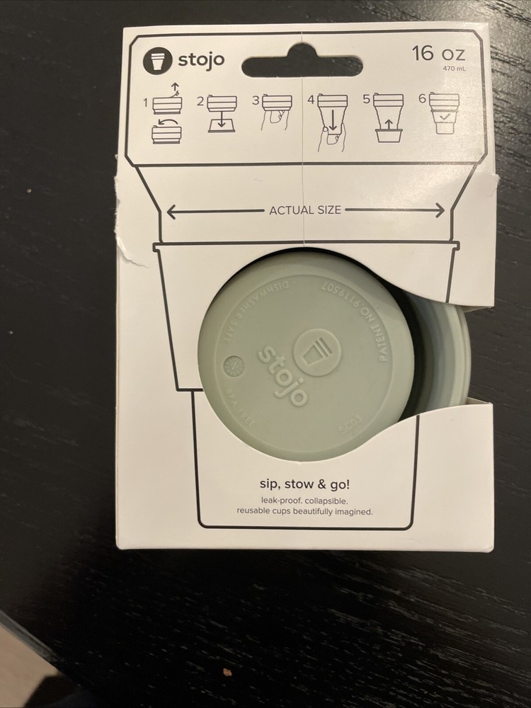 NEW Stojo Collapsible Travel Cup With Straw 16 oz Sage hello stojo Introducing the NEW Stojo Collapsible Travel Cup, perfect for all occasions. This 16 oz cup comes in a stylish gray color and features a silicone and BPA-Free Plastic construction. The cup includes a straw and lid, making it easy to drink on the go. Designed with convenience in mind, this cup is easy to clean and store. Its collapsible design makes it perfect for travel, camping, or even everyday use. The cup is made by Stojo, a brand known for their high-quality travel cups. Get your hands on this must-have travel accessory today!