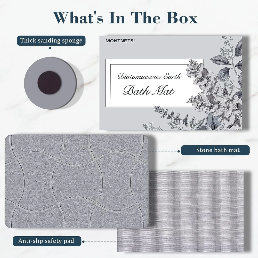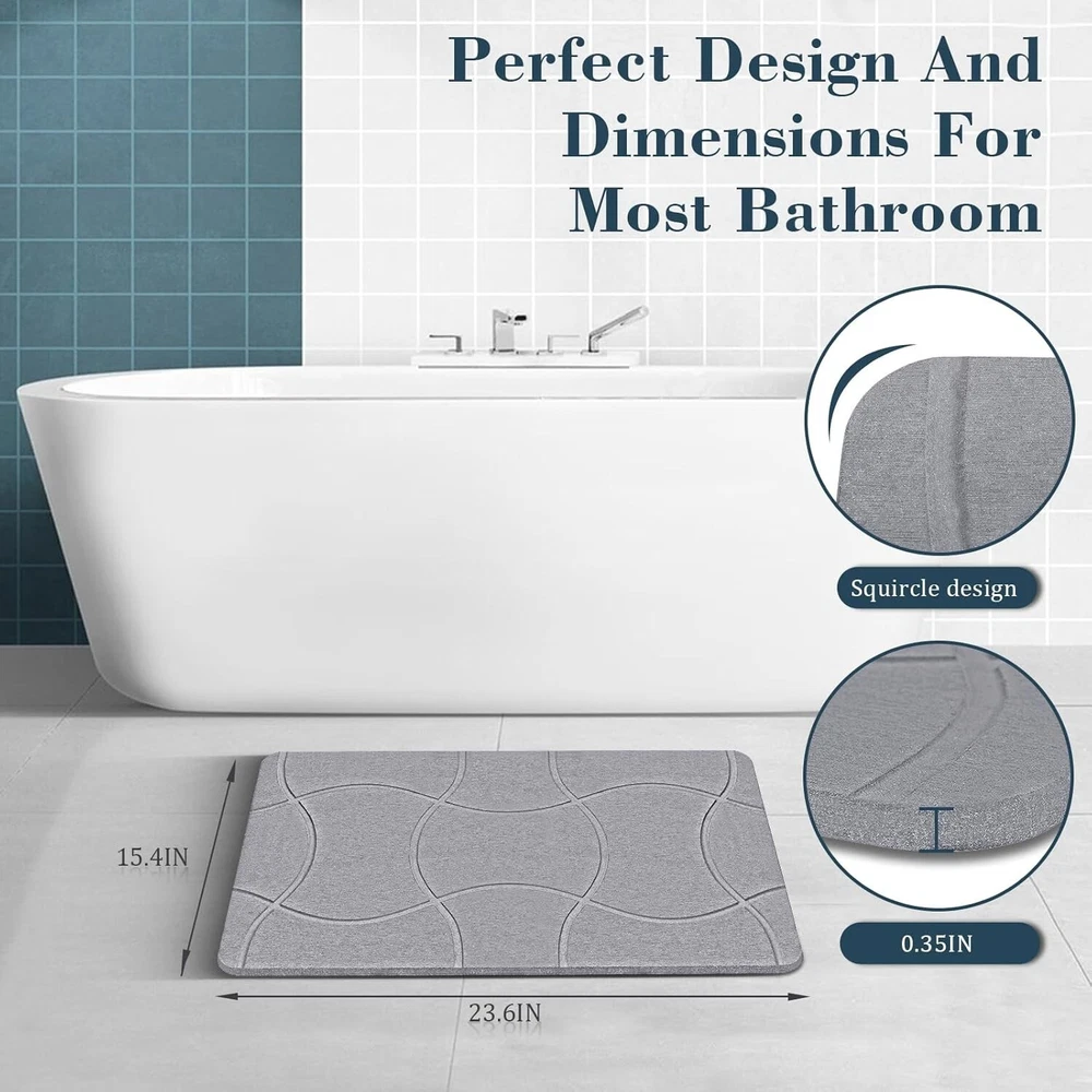 Speedy Dry Magic - Step out of the tub or shower and experience instant dryness beneath your feet with Speedy Dry Magic! Our bath mat, made from natural diatomaceous earth, boasts exceptional water-absorbing capabilities. Bid farewell to soggy bathroom floors and traditional bath mats. Embrace the comfort of a worry-free, dry experience like never before! Anti-Slip Assurance - To add a sense of security and stability to your bathroom, our stone bath mat is an ideal choice. Equipped with non-slip pads, our diatomite mats ensure a firm grip on the floor, preventing unexpected slips. Choose our durable and reliable diatomite stone bath mats with confidence, providing peace of mind for you and your family in daily life, ensuring a steady and secure footing in the bathroom. Built to Last - Our super absorbent stone bath mat is designed for hassle-free maintenance compared to traditional bathroom mats. When it gets a bit dirty, there's no need for extensive cleaning – just use the thick sanding sponge pad we include to easily wipe away surface dirt, restoring it to its best condition. Remember to keep the diatomaceous earth bath mat away from direct sunlight; a well-ventilated spot is all it needs. Clean & Green - Experience the comfort of our stone bathroom mat, crafted from a sustainable blend of natural diatomaceous earth and renewable paper. It's not just about comfort; it's a commitment to a green planet. Plus, with proper usage, its lifespan surpasses that of traditional fabric mats, making it a more economical choice. Timeless Minimalist Design - With its sleek and timeless linear design, our stone bathroom mat is not just a stylish choice but a versatile one too. Beyond its visual appeal, it seamlessly adapts to various uses - from a bathroom mat to a perfect spot for pet bowls, plants, dishes and more. With its exceptional water absorption, it ensures a dry and clean environment wherever it's placed, making it a functional and stylish addition to any space.