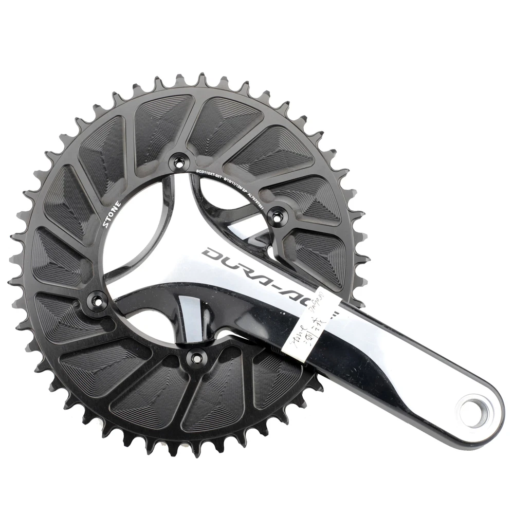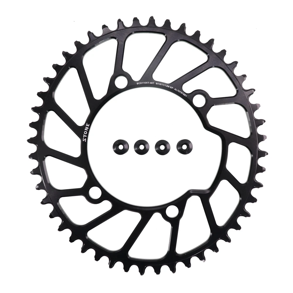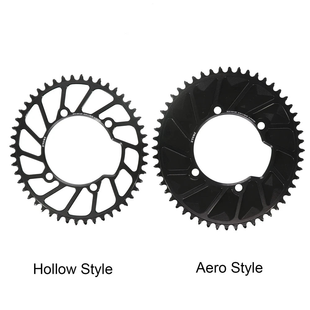 Stone Chainring 110BCD for Shimano 4700 5800 6800 9000 Oval 34 36 38 40 42 44 46 48 58T 60T Narrow Wide Road Bike 110bcd Material: High strength Aluminum 7075-T651. Material Hardness:HB150 CNC process precision:0.03mm Color: black anodized Style:Hollow(42t to 60t),Aero(36t to 60t) Size: 110 BCD, oval Thickness: 4MM Narrow wide tooth Notice:Only fit for 1x use,NOT for 2x use.No refund or return for wrong purchase. Notice:Only fit for 1x use,NOT for 2x use.No refund or return for wrong purchase. Notice:Only fit for 1x use,NOT for 2x use.No refund or return for wrong purchase. Chain Speed support: 9-10-11-12 speed(MTB chain) 9-11s( for Sram Road bike chain) 9-12s(for shimano Road bike chain) Default Not support AXS flattop chain. If want tooth shape for sram axs flattop chain, please send us a message to customize and pay extra surcharge. NOTICE: 12 speed chain connector is a must if you use shimano 12 speed chain , otherwise the 12 speed chain can not work with this chainring. Fit for shimano 5800 6800 4700 9000 Surface treatment: Anodize, high speed CNC Package Contents: 1 x chainring or 1 set bolts cover Advantages: 1 Material: High strength Aluminum 7075-T651. Offer best stiffness and endurance. 2 High precision CNC processing. Working accuracy 0.03mm. Ensure offers you the best riding component. Tooth Max diameter(mm) Weight(g)(Aero Style) 36 T , 162 mm , 67 g 38 T , 170 mm , 80 g 40 T , 178 mm , 86 g 42 T , 186 mm , 89 g 44 T , 194 mm , 102 g 46 T , 202 mm , 106 g 48 T , 210 mm , 115 g 50 T , 219 mm , 131 g 52 T , 226 mm , 136 g 54 T , 235 mm , 145 g 56 T , 242 mm , 150 g 58 T , 250 mm , 166 g 60 T , 259 mm , 175 g