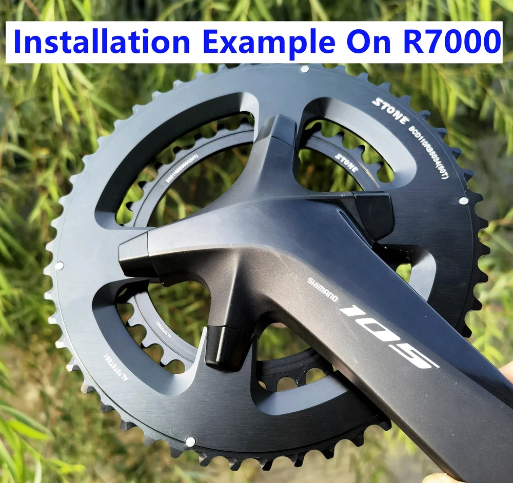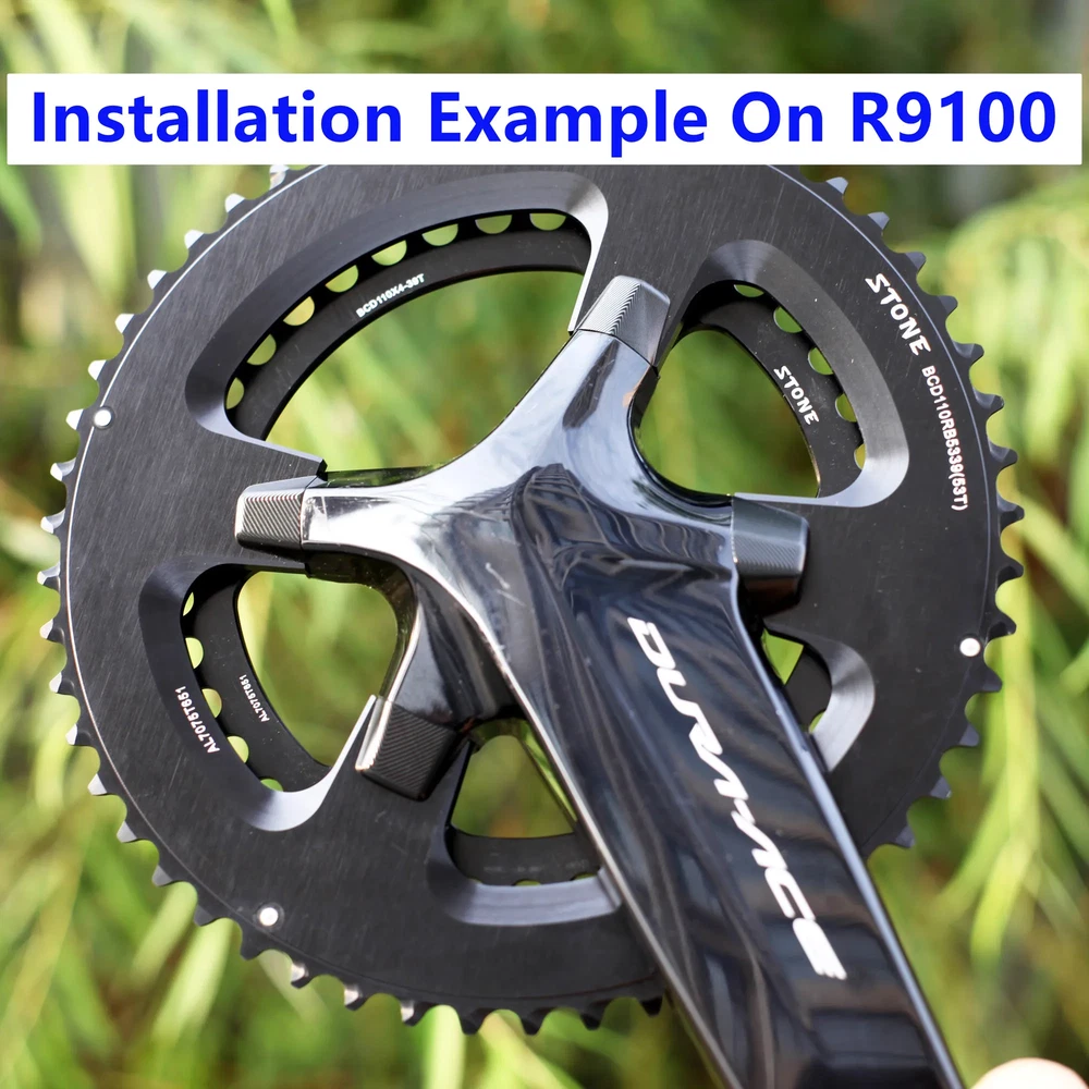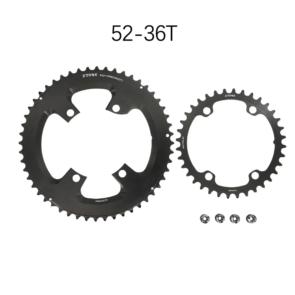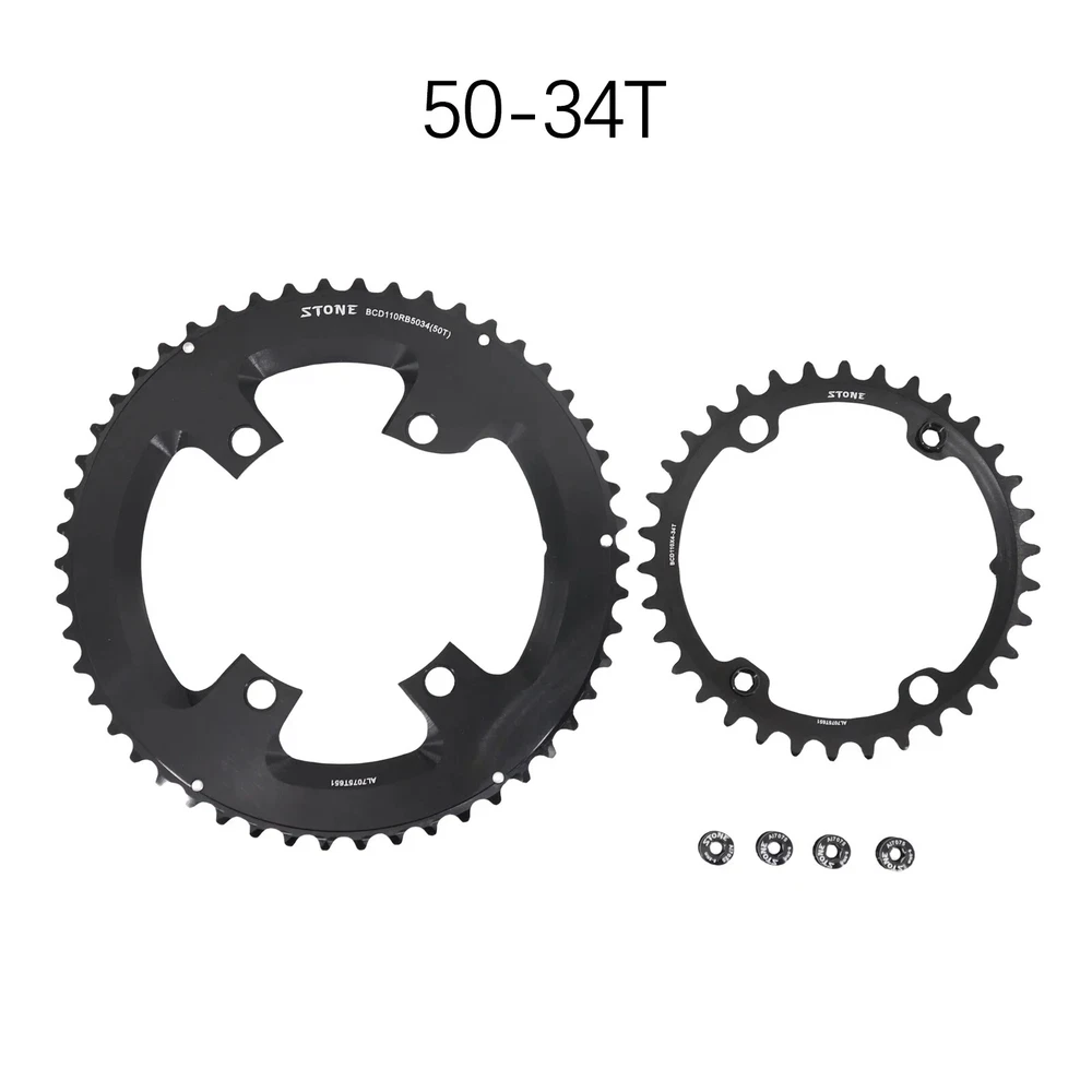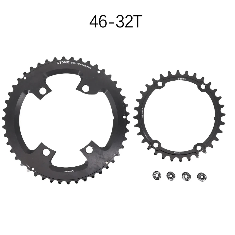 Color: black Size:110bcd Advantage: fast chain shifting Weight: 121g(46/32), 143g(48T/33T), 153g(50T/34T), 169g(52/36T), 185g(53/39T), 191g(54T/40T), Speed: 9-12s(Road bike), not support sram axs flattop 12s chain. Offset:0mm, but 46-32T is 2mm inner offset Notice:the decoration Bolts cap set only fit for stone 2X chainring use, not for other brand chainring. (46T/32T can not use decoration bolts cap, 46/32T can only use the ordinary bolts as the 32T chainring has buildin female bolts) Package content: 2pcs chainring and 4pcs oridnary bolts. Notice:the Bolts set only for stone 2X chainring use. not for other brand chainring(46t-32t can not use)