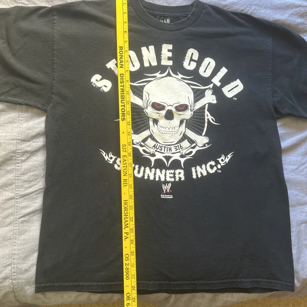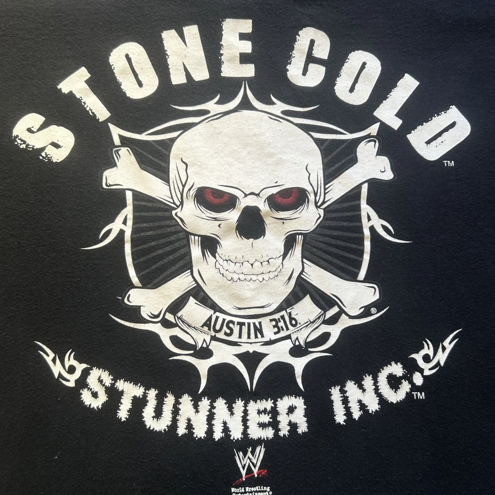 This Stone Cold Stunner T-shirt, featuring Steve Austin, is a must-have for any WWE fan. Made of high-quality cotton, this black shirt is available in XL size fits true to size. Measurements are also in the photos. The shirt is designed with the iconic Stone Cold Stunner logo. Shirt is dated 2010.