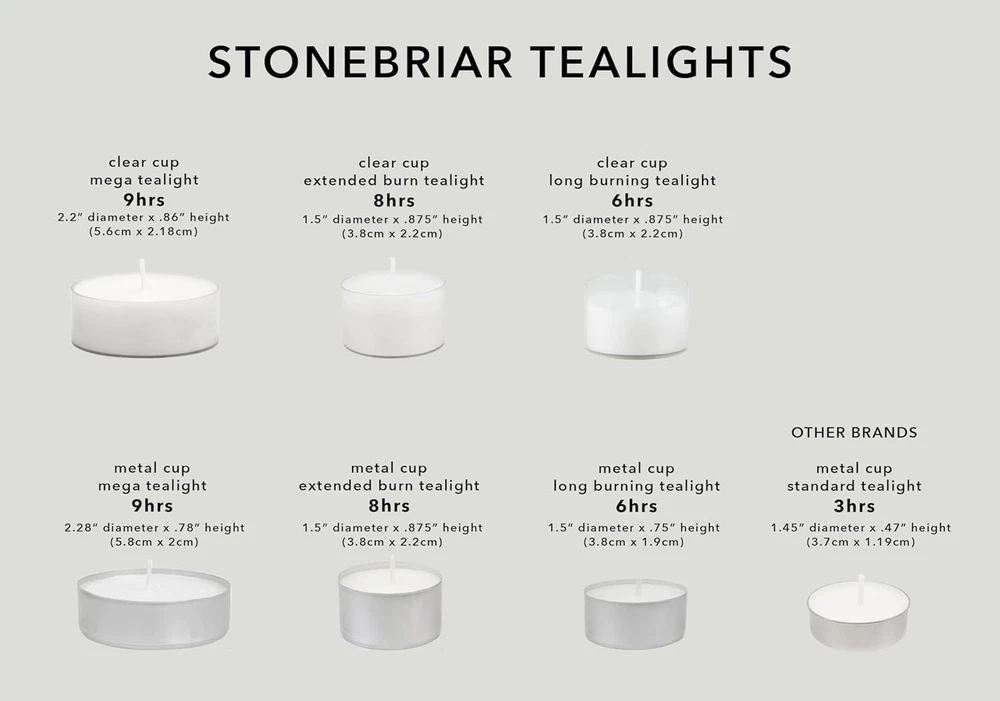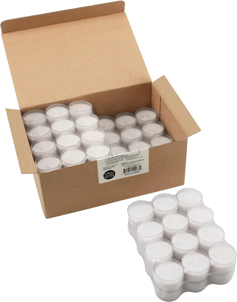 Burning Time: 6 - 7 Hours Model: DTLR-96-6 Style: Traditional Shape: Tealight Size: 96 Pack Room: Does not apply Number in Pack: Does not apply Color: White Personalize: Does not apply Country/Region of Manufacture: Does not apply Power Source: Does not apply MPN: DTLR966, DTLR-96-6 Item Length: Does not apply Scent: Unscented Item Width: Does not apply gtin13: 0689993811574 Battery Type: Does not apply Handmade: Does not apply Type: Bulk Candles UPC: 0689993811574 Item Weight: 4.46lbs. Features: Including Holder Theme: Holiday Item Height: Does not apply Material: Paraffin Wax Brand: Stonebriar