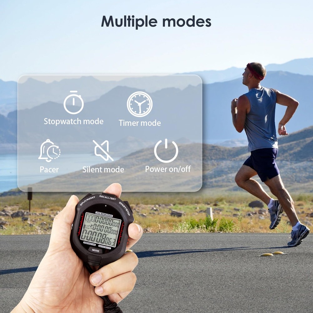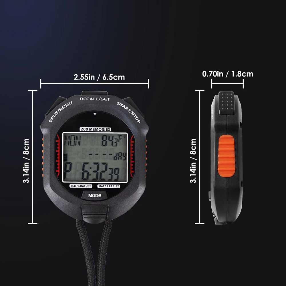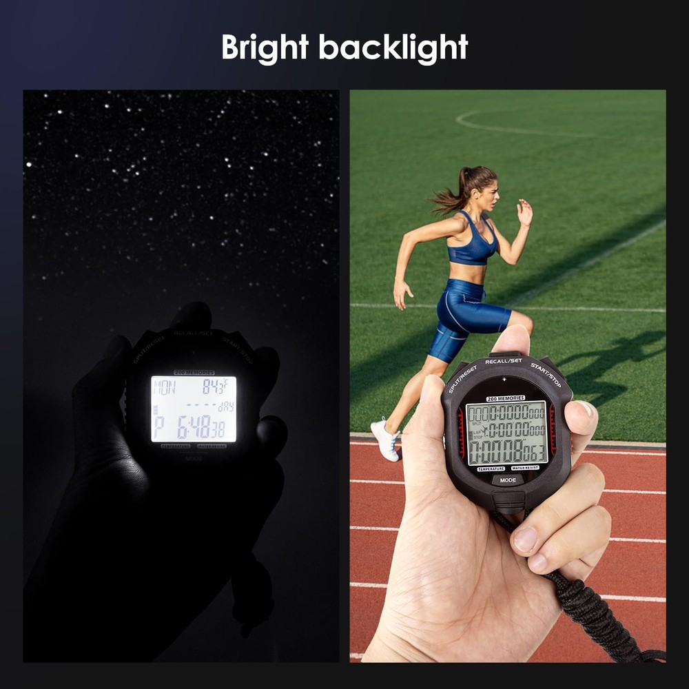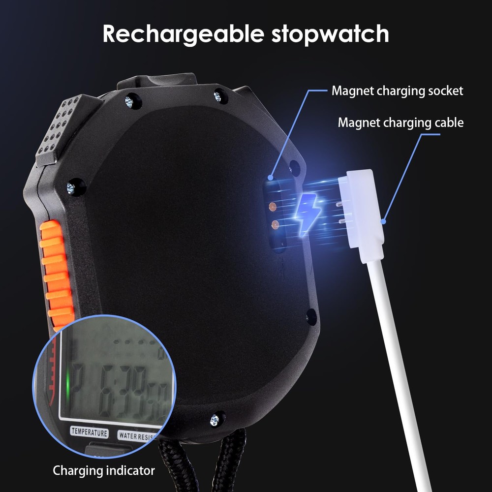 Stopwatch,Rechargeable Sports Stopwatch Timer with Backlight, 200 lap Multi-Function Digital Stopwatch with Large Display,1/1000 Second Sports Timer for Match, Coach, Referee, Training, Timing RECHARGEABLE STOPWATCH--Charge with a magnetic Charging cable, easy and stable; Don't need to replace battery and could reduce usage of batteries. 200 LAP STOPWATCH--200 laps memory could meet most requirements. STOPWATCH WITH BACKLIGHT--Due to the rechargeable design, the backlight on this stopwatch is brighter than traditional green backlight-could be used even in strong sunshine. MULTI-FUNTION TIMER--Time,timer, countdown day, Alarm, pacer,temperature. FLEXIBLE SETTING--Most functions could set on/off by user-Backlight, keytone, power on/off, alarm. Our promise: is our first priority. us freely if there is any problem(even it passed the return date), we promise to help you within 24 hours.