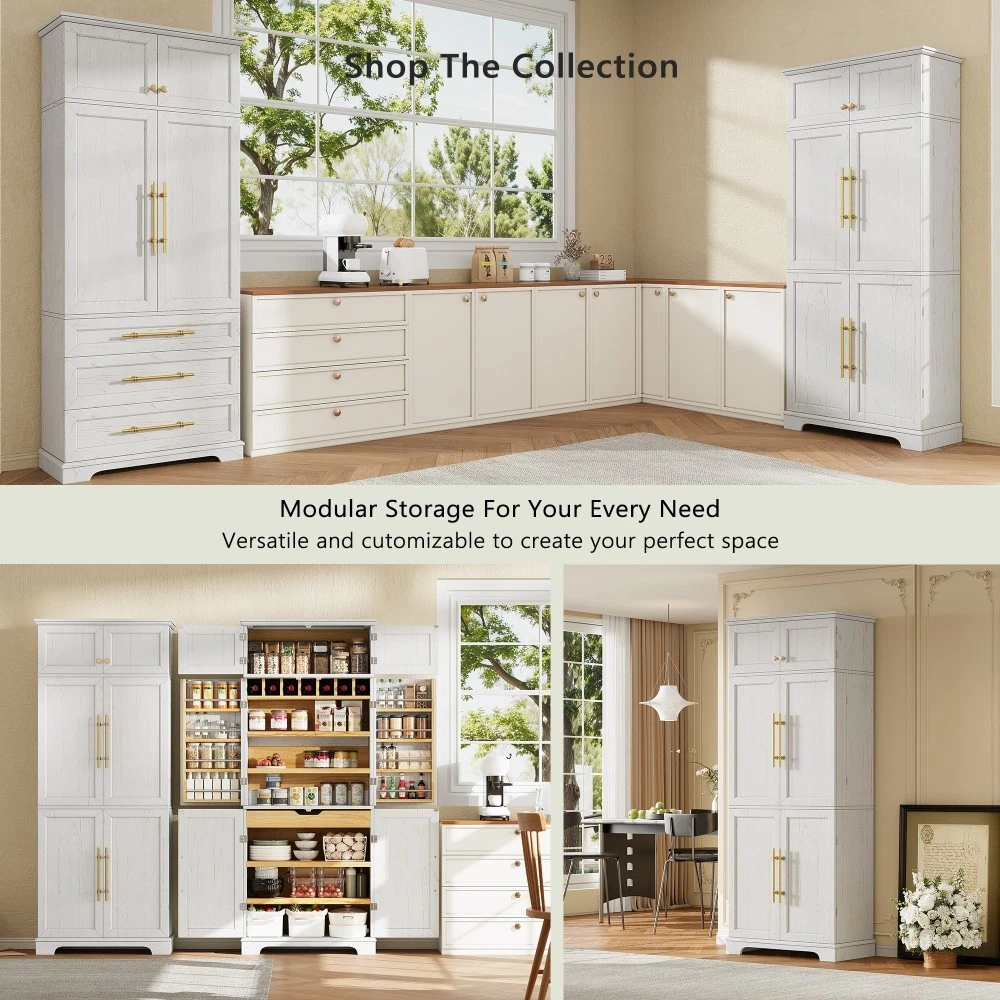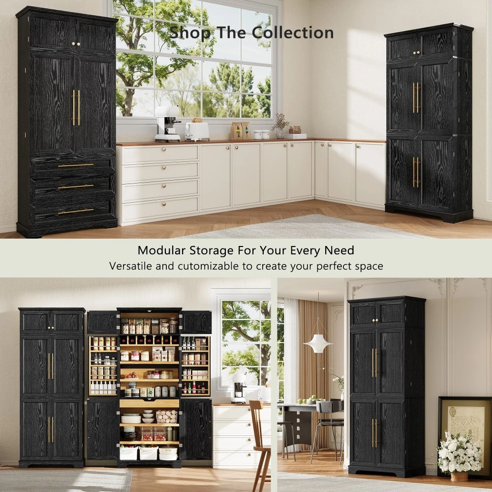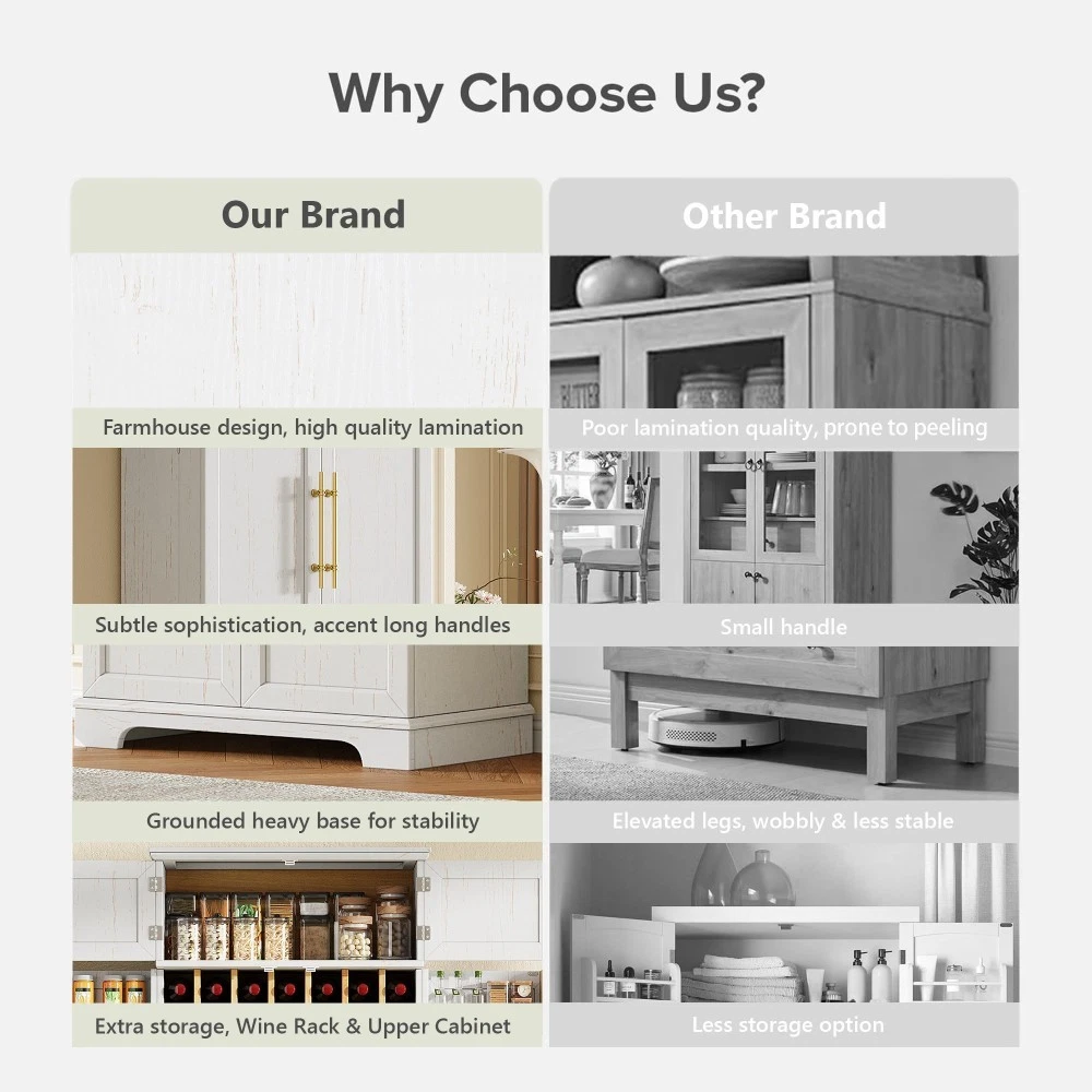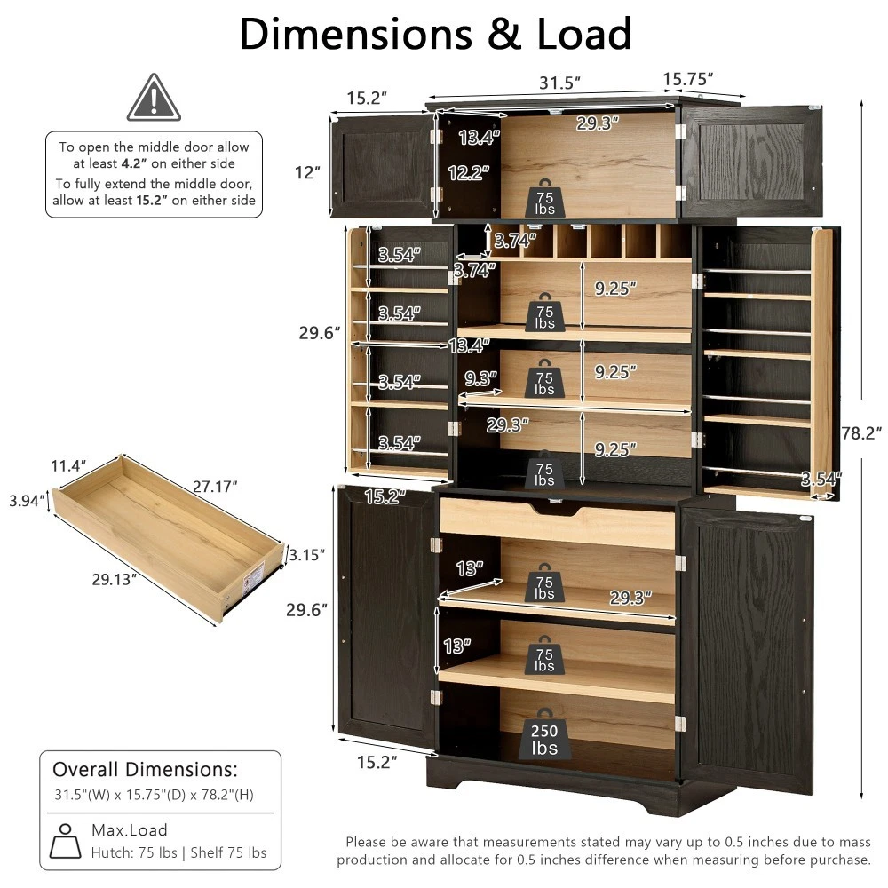 K&K 78.2" Tall Farmhouse Pantry Cabinet - 8 Door Shelves, Adjustable Shelves, Hidden Drawer & Wine Rack (Retro White/Ash Black) ๐ฅ Elevate Storage & Style with Timeless Farmhouse Charm ๐ฅ Introducing the K&K 78.2" Tall Farmhouse Pantry Cabinet โ where American traditional elegance meets all-in-one storage functionality. Available in two versatile finishes (Retro White & Ash Black), this freestanding cabinet features 6 doors, 8 door shelves, 4 adjustable shelves, a hidden drawer, and a built-in wine rack, making it perfect for organizing kitchen essentials, diningware, bathroom supplies, or living room decor. Crafted with premium MDF and accented with gold handles, itโs designed to add sophistication to any space while standing up to daily use. ๐จ Choose Your Perfect Finish Retro White The soft retro white finish pairs beautifully with natural wood grain undertones and gold handles, creating a warm, inviting ambiance. It seamlessly blends with farmhouse, cottage, or classic American decor, brightening up kitchens and dining rooms with its timeless appeal. Ash Black The rich ash black hue exudes modern sophistication, complemented by sleek gold accents and subtle wood textures. Itโs ideal for contemporary, industrial, or transitional spaces, adding depth and a touch of luxury to your storage area. ๐ Standout Features of This Pantry Cabinet Iconic Farmhouse Aesthetic : Designed with two-tone color contrast, chamfered edges, recessed panel frames, and elegant gold handles, this cabinet captures the essence of American traditional style. Clean lines and natural wood grain details add warmth, making it a focal point in any room while blending seamlessly with existing decor. 17 Compartments for Ultimate Organization : This all-in-one storage solution includes 7 shelves (4 adjustable), 8 door shelves (2 adjustable), 1 hidden drawer, and 7 wine racks โ totaling 17 compartments across 3 separate cabinets. Customize the layout to fit items of all sizes, from tall cereal boxes to wine bottles and dinner plates. Adjustable Storage Flexibility : Four main shelves and two door shelves are fully adjustable, allowing you to reposition them at various heights. Accommodate tall cookware, bulky appliances, or small spice jars with ease โ tailor the space to your unique needs. Rock-Solid Stability & Durability : Crafted from premium P2 engineered wood with scratch-resistant P2 grade laminate, this cabinet is built to last. The middle and bottom shelves support up to 250 lbs each, while other shelves hold 75 lbs, the hidden drawer holds 50 lbs, and each door shelf supports 35 lbs. A included wall anchor kit prevents tipping for added safety. Thoughtful User-Friendly Design : Features magnetic door catches for easy, quiet access and durable gold handles for a comfortable grip. The individual top cabinet separates from the lower storage area, enhancing usability. Beyond the kitchen, it works perfectly as a bathroom linen cabinet or living room display cupboard. Easy Assembly Process : No need for professional help! The cabinet comes with detailed step-by-step instructions, clearly labeled parts, and all necessary hardware. Assemble it with confidence โ we conduct thorough quality checks before delivery to ensure a smooth setup. ๐ Detailed Specifications (Both Finishes) Specification Details Overall Assembled Dimensions 31.50โ W ร 15.75โ D ร 78.20โ H Product Weight 138.34 lbs Packaging Dimensions 37.99โ L ร 19.69โ W ร 18.11โ H Packaging Weight 147.05 lbs Material Premium MDF (P2 Engineered Wood Core + P2 Laminate) Doors/Drawers 6 Doors, 1 Hidden Drawer Special Features 8 Door Shelves, 4 Adjustable Shelves, 7 Wine Racks, Gold Handles Origin China ๐ก๏ธ Shop with Complete Peace of Mind 1-Year Quality Warranty : We stand behind the craftsmanship of our K&K Pantry Cabinet. Enjoy a 1-year warranty covering any manufacturing defects, ensuring your investment is protected. 30-Day Free Return & Exchange : Not completely satisfied with your cabinet? Return or exchange it within 30 days of delivery โ no questions asked, and we cover the shipping costs. Important Notes : 1. Actual product color may vary slightly from images due to lighting or monitor settings. 2. Manual measurements may have a reasonable margin of error. This pantry cabinet isnโt just a storage solution โ itโs a statement piece that combines functionality with timeless style. Whether youโre organizing your kitchen, adding storage to your dining room, or decluttering your bathroom, it adapts to your needs while enhancing your spaceโs aesthetic. The blend of farmhouse charm and modern practicality makes it a must-have for any home. ๐ฆ Fast & Secure Shipping | ๐ ๏ธ Easy Assembly | ๐จ Two Elegant Finishes Add it to your cart today and transform your storage space with style!