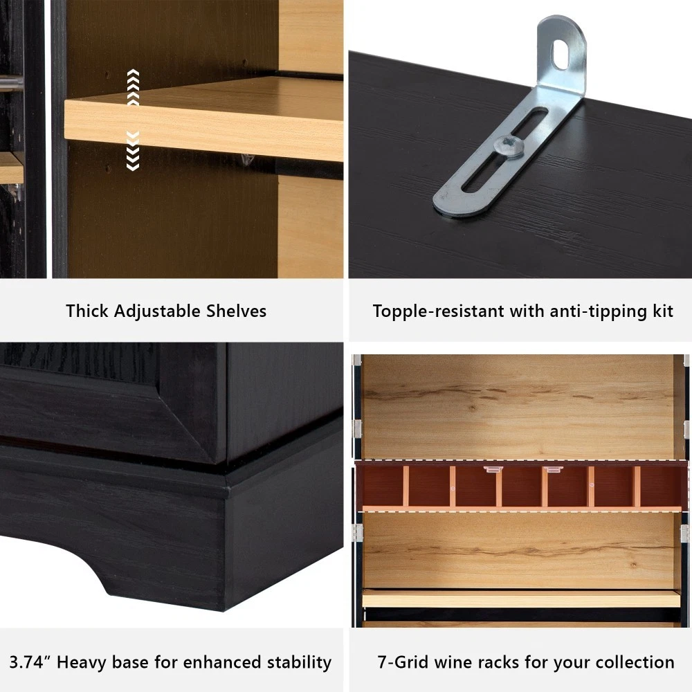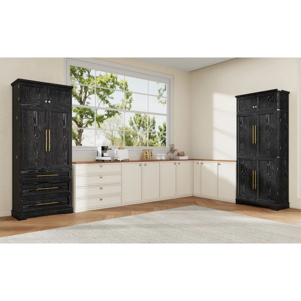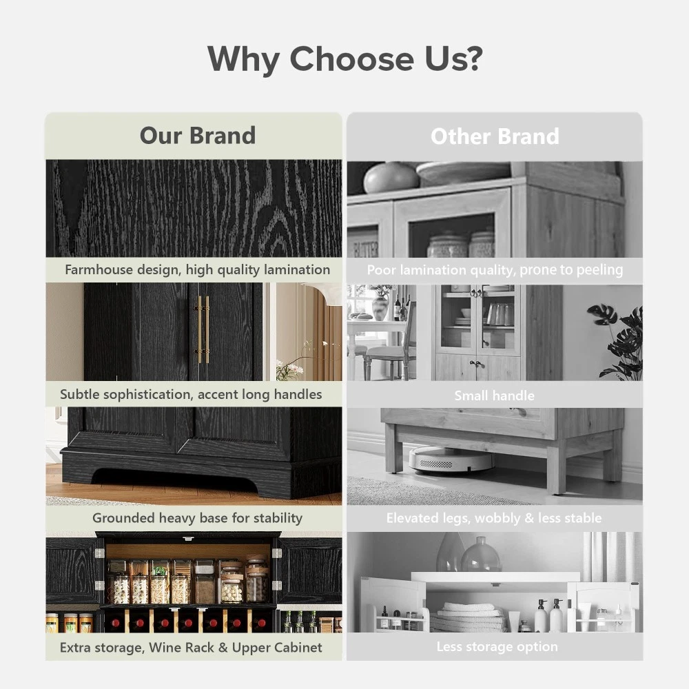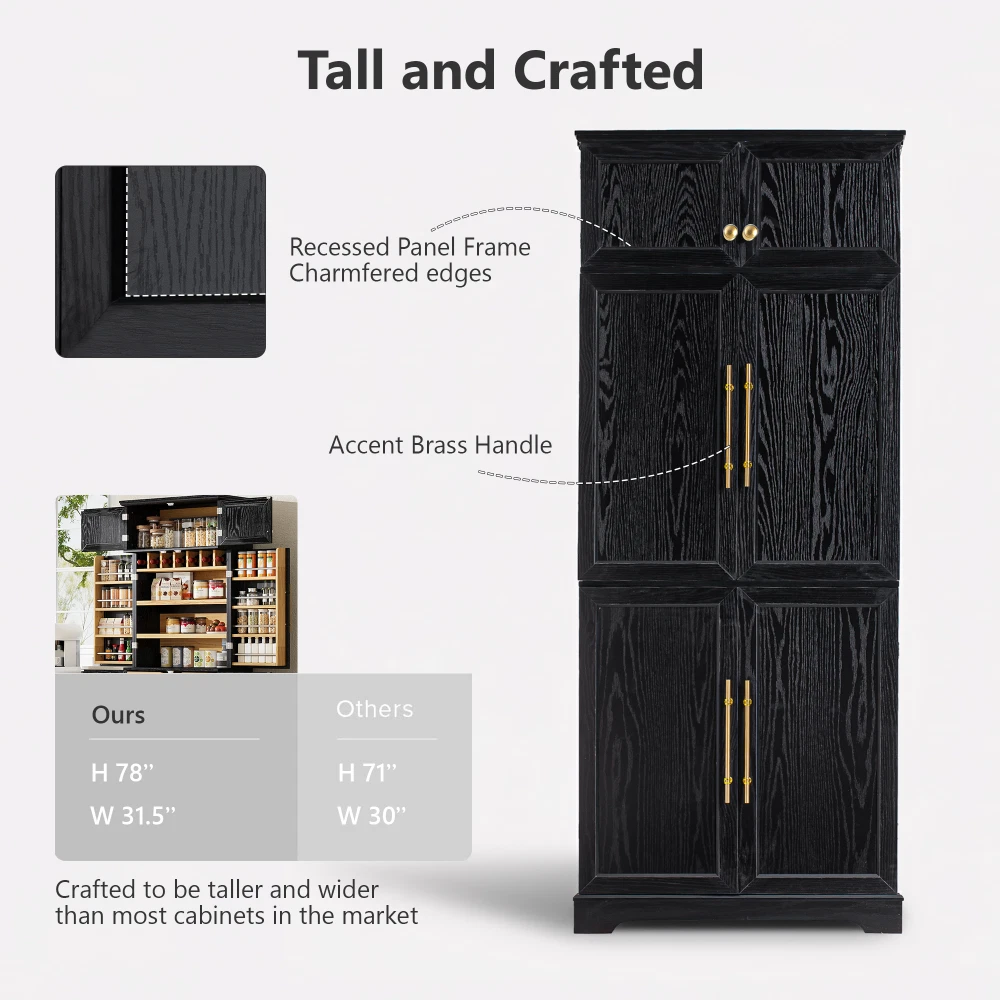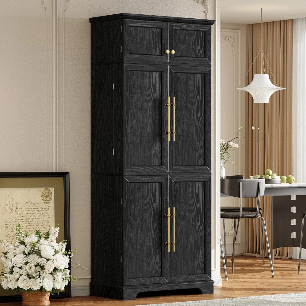 K&K 78.2" Tall Farmhouse Pantry Cabinet - 8 Door Shelves, Adjustable Shelves, Hidden Drawer & Wine Rack (Retro White/Ash Black) ๐ฅ Elevate Storage & Style with Timeless Farmhouse Charm ๐ฅ Introducing the K&K 78.2" Tall Farmhouse Pantry Cabinet โ where American traditional elegance meets all-in-one storage functionality. Available in two versatile finishes (Retro White & Ash Black), this freestanding cabinet features 6 doors, 8 door shelves, 4 adjustable shelves, a hidden drawer, and a built-in wine rack, making it perfect for organizing kitchen essentials, diningware, bathroom supplies, or living room decor. Crafted with premium MDF and accented with gold handles, itโs designed to add sophistication to any space while standing up to daily use. ๐จ Choose Your Perfect Finish Retro White The soft retro white finish pairs beautifully with natural wood grain undertones and gold handles, creating a warm, inviting ambiance. It seamlessly blends with farmhouse, cottage, or classic American decor, brightening up kitchens and dining rooms with its timeless appeal. Ash Black The rich ash black hue exudes modern sophistication, complemented by sleek gold accents and subtle wood textures. Itโs ideal for contemporary, industrial, or transitional spaces, adding depth and a touch of luxury to your storage area. ๐ Standout Features of This Pantry Cabinet Iconic Farmhouse Aesthetic : Designed with two-tone color contrast, chamfered edges, recessed panel frames, and elegant gold handles, this cabinet captures the essence of American traditional style. Clean lines and natural wood grain details add warmth, making it a focal point in any room while blending seamlessly with existing decor. 17 Compartments for Ultimate Organization : This all-in-one storage solution includes 7 shelves (4 adjustable), 8 door shelves (2 adjustable), 1 hidden drawer, and 7 wine racks โ totaling 17 compartments across 3 separate cabinets. Customize the layout to fit items of all sizes, from tall cereal boxes to wine bottles and dinner plates. Adjustable Storage Flexibility : Four main shelves and two door shelves are fully adjustable, allowing you to reposition them at various heights. Accommodate tall cookware, bulky appliances, or small spice jars with ease โ tailor the space to your unique needs. Rock-Solid Stability & Durability : Crafted from premium P2 engineered wood with scratch-resistant P2 grade laminate, this cabinet is built to last. The middle and bottom shelves support up to 250 lbs each, while other shelves hold 75 lbs, the hidden drawer holds 50 lbs, and each door shelf supports 35 lbs. A included wall anchor kit prevents tipping for added safety. Thoughtful User-Friendly Design : Features magnetic door catches for easy, quiet access and durable gold handles for a comfortable grip. The individual top cabinet separates from the lower storage area, enhancing usability. Beyond the kitchen, it works perfectly as a bathroom linen cabinet or living room display cupboard. Easy Assembly Process : No need for professional help! The cabinet comes with detailed step-by-step instructions, clearly labeled parts, and all necessary hardware. Assemble it with confidence โ we conduct thorough quality checks before delivery to ensure a smooth setup. ๐ Detailed Specifications (Both Finishes) Specification Details Overall Assembled Dimensions 31.50โ W ร 15.75โ D ร 78.20โ H Product Weight 138.34 lbs Packaging Dimensions 37.99โ L ร 19.69โ W ร 18.11โ H Packaging Weight 147.05 lbs Material Premium MDF (P2 Engineered Wood Core + P2 Laminate) Doors/Drawers 6 Doors, 1 Hidden Drawer Special Features 8 Door Shelves, 4 Adjustable Shelves, 7 Wine Racks, Gold Handles Origin China ๐ก๏ธ Shop with Complete Peace of Mind 1-Year Quality Warranty : We stand behind the craftsmanship of our K&K Pantry Cabinet. Enjoy a 1-year warranty covering any manufacturing defects, ensuring your investment is protected. 30-Day Free Return & Exchange : Not completely satisfied with your cabinet? Return or exchange it within 30 days of delivery โ no questions asked, and we cover the shipping costs. Important Notes : 1. Actual product color may vary slightly from images due to lighting or monitor settings. 2. Manual measurements may have a reasonable margin of error. This pantry cabinet isnโt just a storage solution โ itโs a statement piece that combines functionality with timeless style. Whether youโre organizing your kitchen, adding storage to your dining room, or decluttering your bathroom, it adapts to your needs while enhancing your spaceโs aesthetic. The blend of farmhouse charm and modern practicality makes it a must-have for any home. ๐ฆ Fast & Secure Shipping | ๐ ๏ธ Easy Assembly | ๐จ Two Elegant Finishes Add it to your cart today and transform your storage space with style!