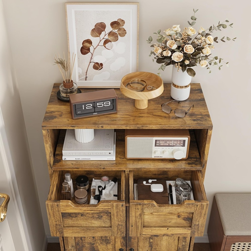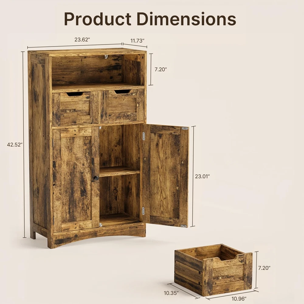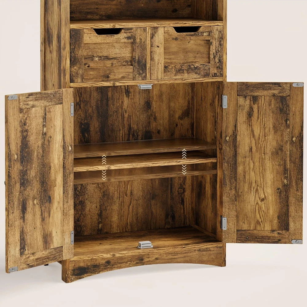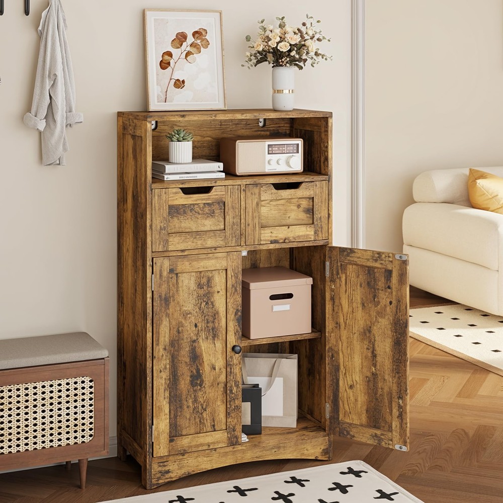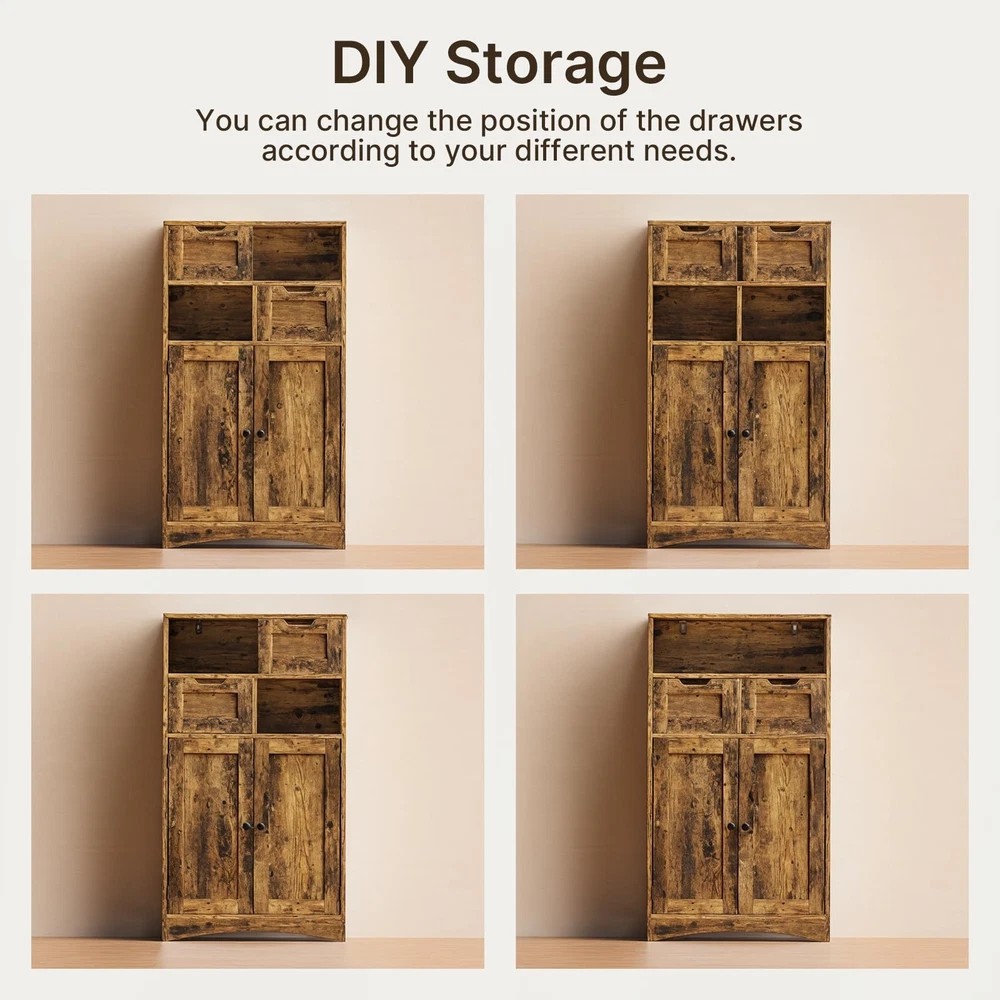 This modern bathroom storage cabinet with drawers and adjustable shelves, featuring a sleek finish, is perfect for bathrooms, kitchens, living rooms, and entryways. With an open top shelf ideal for displaying essentials and spacious drawers and double doors for ample storage, it also boasts adjustable internal shelves that allow you to customize the space to fit your needs—whether for towels, spices, or entryway items. Made from high-quality materials, this kitchen storage cabinet is durable and easy to clean, enhancing organization and aesthetics in any area of your home. Versatile Storage Cabinet: This multifunctional cabinet features open shelves and enclosed storage, offering ample space for organizing various items. Perfect for displaying books, decor, or kitchen essentials, it keeps your living room, kitchen, or bathroom tidy and stylish with ease Durable & Sturdy Construction: Crafted from high-quality engineered wood, this bathroom storage unit is designed for longevity. Its sturdy frame and reinforced doors ensure it can withstand heavy use in bustling households or bathrooms Adjustable Shelves &Drawes: The interior shelves of the storage cabinet can be adjusted to 3 different heights, allowing you to customize the space to fit items of various sizes. It can be easily removed to create even more storage space. Also, the drawers in this cabinet offer flexible, customizable combinations to fit your needs Endless Possibilities: This versatile storage cabinet isn't just for the bathroom, it can also serve as a free-standing organizer in your living room or kitchen. A stylish solution for any decor, it enhances organization and ambiance Quick Assembly & Easy Maintenance: This cabinet has clear instructions and all necessary hardware. Its scratch-resistant surface makes cleaning a breeze, ensuring it looks new for years. If you have any questions after delivery, our customer service team is here to help with any inquiries