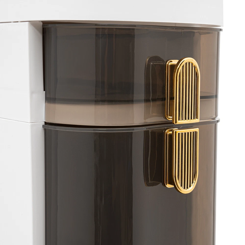 Description With a large capacity of 3-tier drawers and a top hidden space design, the slim and tall storage cabinet adds organization and storage to your small bathroom space, making your bathroom or kitchen more neat with clutter well organized. It is made of high-quality PP and PET and has four removable wheels, which is ideal for narrow dressing rooms or bathrooms with insufficient storage space. Details Rounded Corners and Edges: The corners are rounded and smooth to reduce collisions and improve safety. Comfortable U-shaped Pulls: They make drawer opening and closing even smoother. Raised Bottom Drawer: The raised bottom drawer (13.6inch) can accommodate more bulky household items such as laundry detergent and cleaning tools. Specifications Material: PP, PET Surface Treatment: Brightening Process Color: White, Clear Brown Style: Modern Shape: Rectangular Mount Type: Free Standing Number of Drawers: 3 Assembly Required: No Third-tier Drawer Height: 34.5cm/13.6in First and Second-tier Drawer Height: 29cm/11.4in Product Size: 41*18*78cm/ 16.1*7*30.7in Package Included 1* Storage Cabinet 4* Wheels Notes Please allow the slight color difference caused by the shooting light and 1-3cm error due to manual measurement, and make sure you do not mind before you order. Build to Last: The product is mainly made of PP and PET and after the surface brightening process, which is odorless, non-toxic, chemical resistant, fatigue resistant, and friction resistant. Large Storage Capacity: The storage cabinet measuring 16.1*7*30.7 inches has three-tier drawers and a hidden space at the top, so you can easily categorize toys, clothes, books, drinks, toiletries, tissues, towels, etc. Space-saving: Its compact design(footprint: 16.1*7 inches) allows the cabinet to provide maximum capacity in minimum space and effortlessly slide into seemingly useless tight spaces next to the toilet or closet. Whether you use it in your living room or bathroom, it delivers full use of space. Thoughtful Design: The hidden space at the top is designed with a large flap, so you can open and close it at a wide angle for hassle-free access. Also, the top is equipped with flat round holes on both sides, through them, you can draw and take toilet paper more conveniently. High Load-Bearing Capacity: The sturdy rectangular structure and high-quality materials allow it to withstand a heavy load without collapsing, you can use it with peace of mind. Semi-transparent Design: The drawer and top lid are designed semi-transparent, you can clearly glance at the items stored inside, easy to access and store your things. Easy to Move: Equipped with four removable wheels, you can easily move and secure the storage cabinet anywhere, making it ideal for the kitchen, bathroom, office, or any narrow space that needs to be efficiently organized. Beautiful Appearance: The product with a two-color sleek and stylish look adds a touch of elegance to your kitchen or bathroom décor and enhances the overall ambiance of your bathroom.