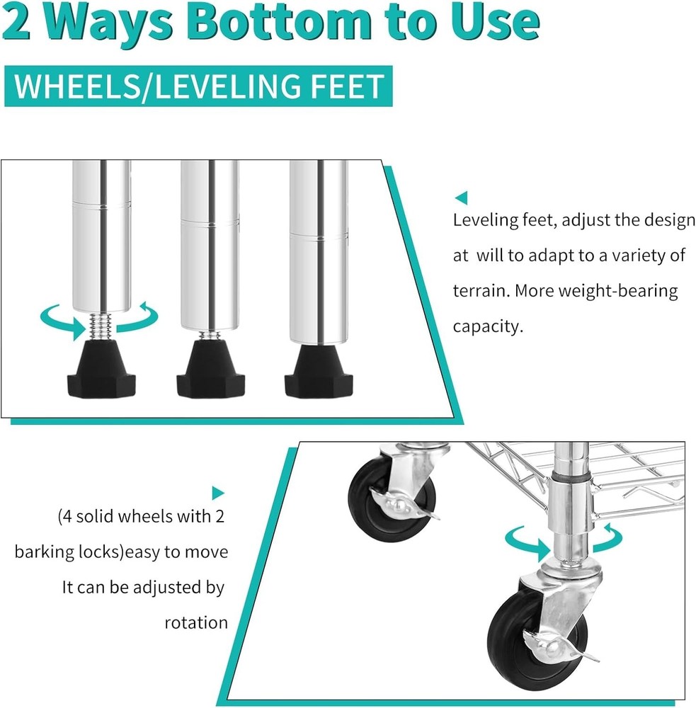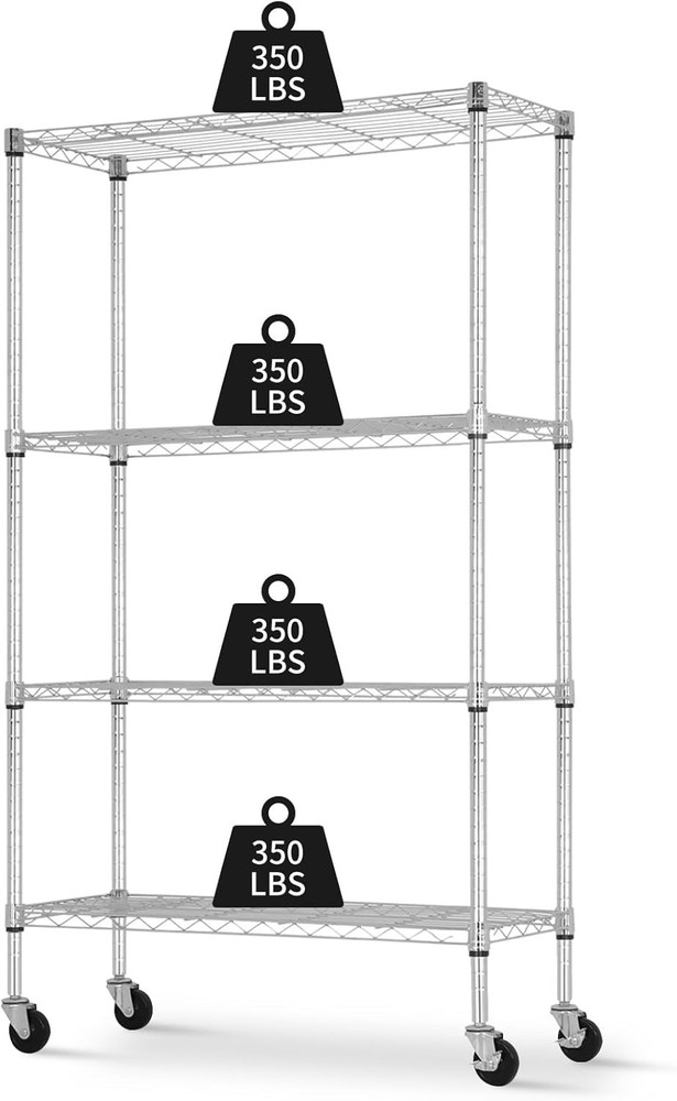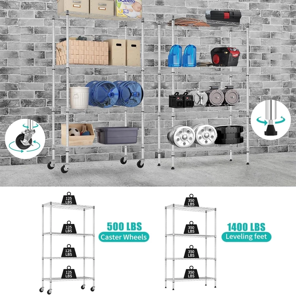 Storage Shelves with Wheels, Heavy Duty 4 Tier Garage Storage Rack, Adjustable Wire Shelving Unit, Metal Shelf Organizer for Pantry, Kitchen, Basement, 36" W x 14" D x 62" H, Chrome 【Heavy Duty Storage with Max Capacity】Constructed from high-strength steel, each shelf supports up to 350 lbs with leveling feet or 125 lbs with wheels, for a total load of 1400 lbs (stationary) or 500 lbs (mobile). Ideal for storing heavy tools, storage bins, and pantry supplies. 【Adjustable 4 Tier Wire Shelves】Each tier can be adjusted in 1-inch increments to fit large or small items. Create your ideal garage storage rack, pantry shelving, or laundry organization system. 【Mobile or Fixed – You Decide】Includes both 3” wheels (2 locking) and leveling feet. Easily convert between a rolling metal shelf and a stable unit for uneven floors in the basement or garage. 【Tool-Free 10 Min Assembly】No screws, no hassle. Snap-together design lets you assemble this storage rack in minutes. Clear instructions and safety caps included. 【Multi-Purpose Use Across Rooms】Ideal for garage storage shelves, kitchen pantry, bathroom, laundry, or office use. A versatile solution for anyone needing storage shelves heavy duty. ..