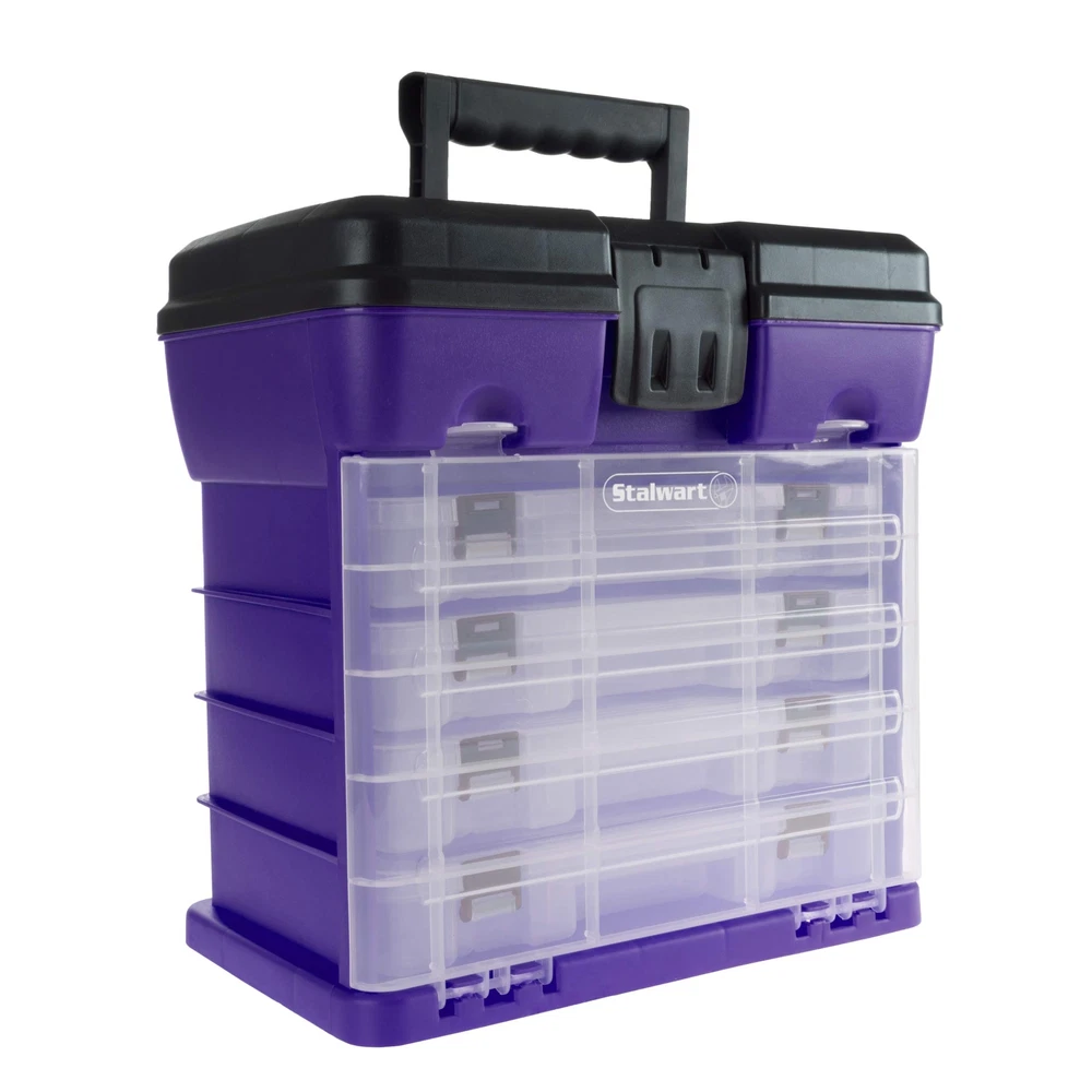 The Storage and Tool Box by is the spot storage solution you have been looking for! Equipped with 4 clear plastic storage boxes, as well as the large main storage section that's perfect for holding bigger items like tools, it has a spot for everything you need to keep organized. Each drawer is fully removable, constructed from durable polypropylene, and features a secure snap shut lid and 19 compartments. The drawers all slide in and out of the main unit for quick access and are locked in with a latched cover when not in use. The case also has a convenient handle for portability and easy travel. It's an excellent multi-purpose storage box that's perfect for everything from tools, hardware like nails, screws and bolts, to fishing tackle, beads, jewelry and crafting supplies! SATISFACTION GUARANTEED- is committed to providing the consumer with the absolute best price and value on all of our products, which we ensure by applying a rigorous quality control process. NOTE: This is an exclusive product of and ONLY Storage and Tool Boxes by are GUARANTEED to be genuine. IMPORTANT: Avoid buying counterfeit products and transacting with unauthorized sellers. Look for our logo on the packaging for every of our products.is a registered trademark protected by U.S. Trademark law and will be vigorously defended. 4 STORAGE BOXES- Equipped with 4 removable clear plastic storage boxes, as well as the large main storage section that’s perfect for holding bigger items like tools, this case has a spot for everything you need to keep organized. DURABLE- Constructed from durable, high-impact polypropylene, this case is a rugged and long-lasting option for all your storage needs. PORTABLE- With sturdy latches on all the compartments and a convenient carrying handle, this case is easily portable and travel friendly. There is also a plastic cover that latches over the front to keep the drawers contained and secure. MULTI-PURPOSE- This excellent multi-purpose storage case is perfect for everything from tools, hardware like nails, screws and bolts, to fishing tackle, beads, jewelry and crafting supplies! It’s the spot storage solution you have been looking for! PRODUCT DETAILS- Material: Polypropylene. Case Dimensions: (L) 12.25" x (W) 8.25" x (H) 12."; Tray Dimensions (4 Total): (L) 10.5" x (W) 6.25" x (H) 1.5"; Top Tray: (L) 12" x (W) 8" x (H) 3". Color: Purple, Black & Clear.
