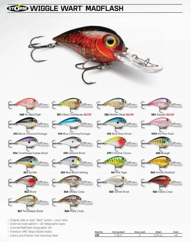 (LOT OF 4) STORM WIGGLE WART MADFLASH 3/8OZ VM599 CHROME CLOWN CR4237 (LOT OF 4) STORM WIGGLE WART MADFLASH 3/8OZ VM599 CHROME CLOWN CR4237 Attention to detail is what makes this Wiggle Wart® so deadly. The 3-D holographic eyes, external scale pattern with UV Bright and traditional color finishes makes this Wart look like a natural baitfish, not just another lure. Loud rattle and original side-to-side “wart" action with premium VMC® black nickel treble hooks. Features Original side-to-side Wart action Original Storm design, mold dimensions and rattle External scale pattern Holographic insert Holographic eyes Painted colors maximize flash UV Bright finish reflects more light energy, strengthening the lure's visibility Premium Black Nickel VMC® hooks Specs Length: 2" Weight: 3/8oz Depth: 7-18ft Hook: #6 PAYMENT TERMS VISA, MASTERCARD, AMEX, OR DISCOVER PAYPAL APPLE PAY GOOGLE PAY PAYMENTS MUST BE MADE IN FULL WITHIN 7 DAYS SHIPPING TERMS ALL PAID ORDERS SHIP WITHIN 1 BUSINESS DAY INSURANCE IS INCLUDED IN SHIPPING PRICE COMBINED ORDER POLICY ORDERS ARE COMBINED NIGHTLY AFTER END OF ALL AUCTIONS. DO NOT PAY FOR INDIVIDUAL ITEMS ENDING ON THE SAME DATE IF YOU WANT THE ORDER COMBINED. ALLOW US TIME TO SEND YOU A COMBINED INVOICE. ORDERS THAT ARE PAID FOR ON DIFFERENT DATES ARE NOT OUR RESPONSIBILITY TO COMBINE. ITEMS MUST BE PAID IN FULL WITHIN 7 DAYS FROM THE END OF 1ST AUCTION. COMBINED ORDER PRICING BAITS - EACH ADDITIONAL AUCTION $1.00 REELS - EACH ADDITIONAL AUCTION $1.00 RODS* - EACH ADDITIONAL AUCTION $1.00 *ALL RODS WILL ONLY COMBINE WITH RODS OPERATING HOURS BUSINESS HOURS ARE MONDAY - THURSDAY 9AM-5PM CENTRAL TIME & FRIDAY 9AM-3PM CENTRAL TIME, EXCLUDING HOLIDAYS EBAY MESSAGES ARE ANSWERED DURING NORMAL BUSINESS HOURS DUE TO THE OVERWHELMING AMOUNT OF ONLINE ORDERS WE ARE EXPERIENCING, LONGER THAN NORMAL RESPONSE TIME TO EMAILS MAY OCCUR. PLEASE BE PATIENT.