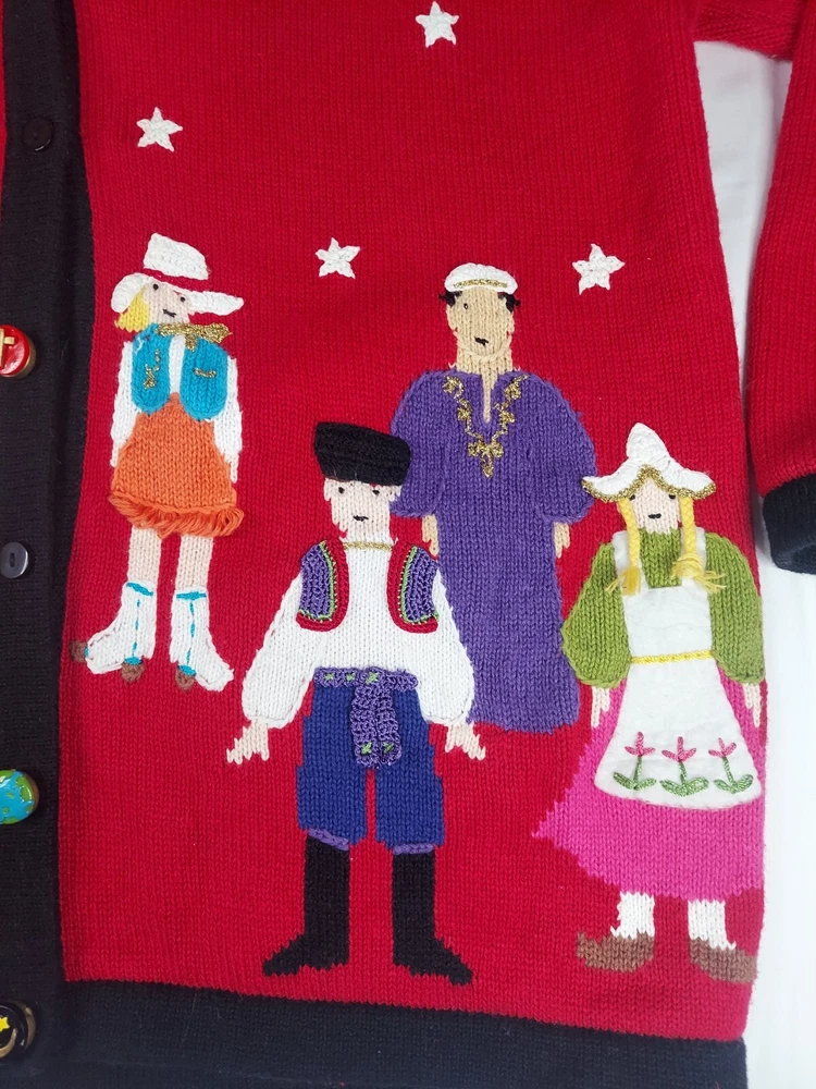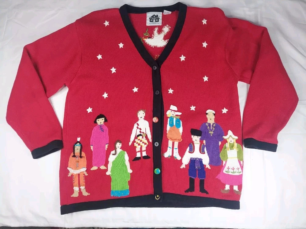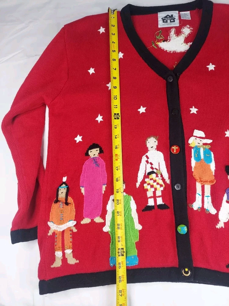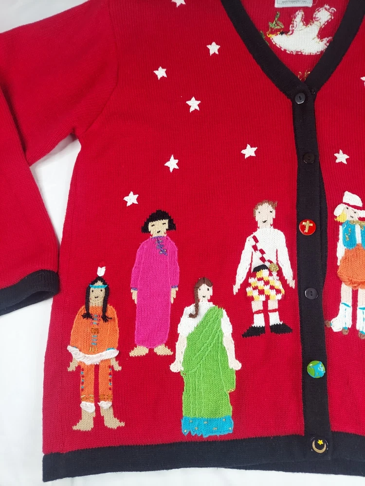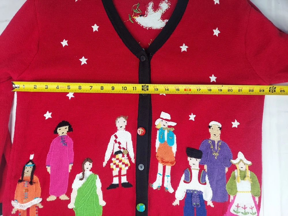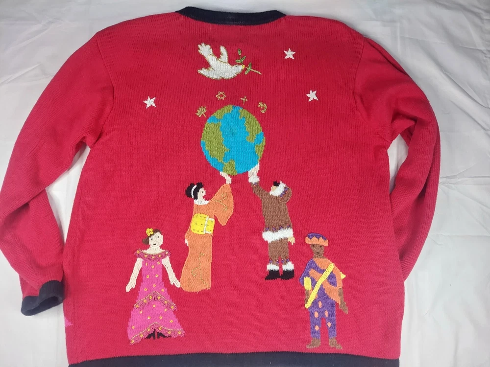 Storybook Knits Red Cardigan World Peace Earth People Sweater Women’s L Red cardigan style sweater with 8 people from around the world on front with stars and 4 people on the back with a Dove flying over Earth. Good used condition. Please see the pictures for measurements and condition. Smoke-free pet friendly