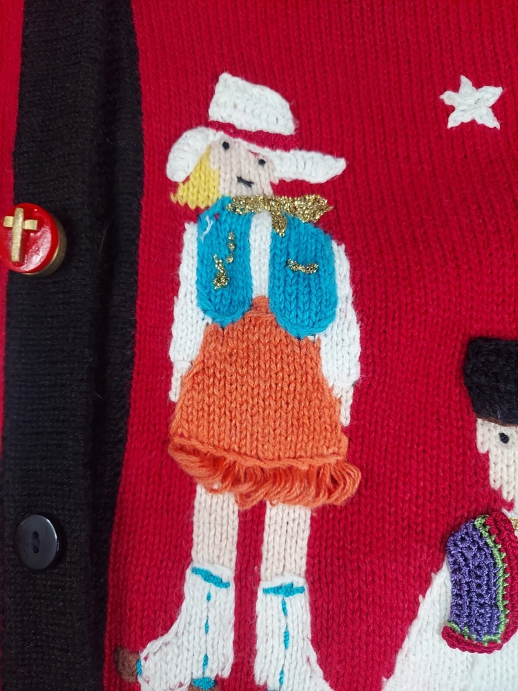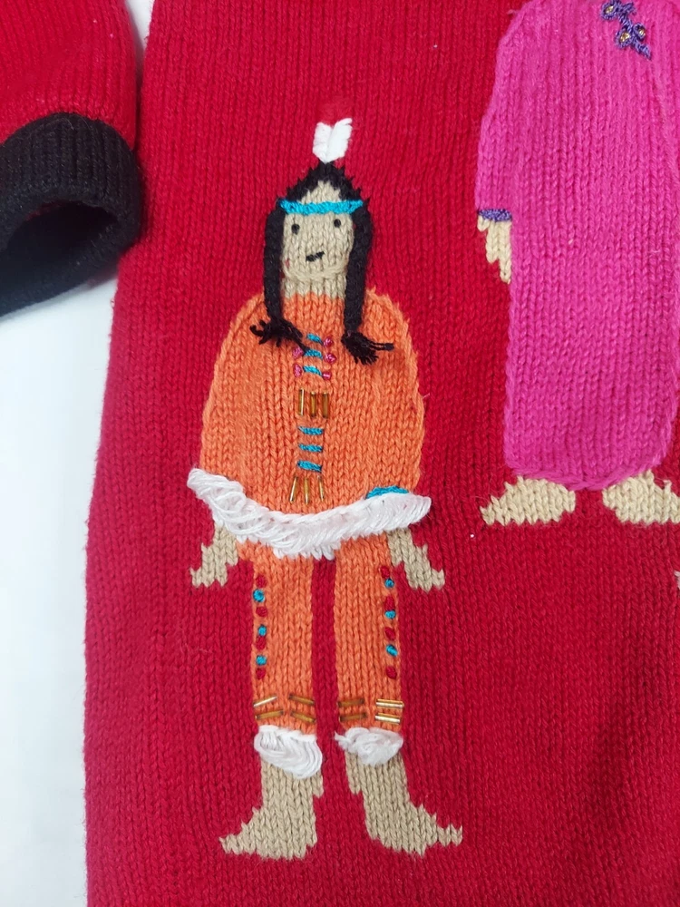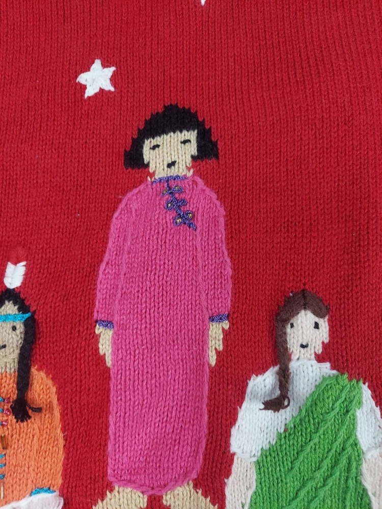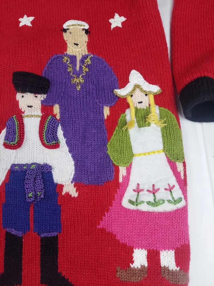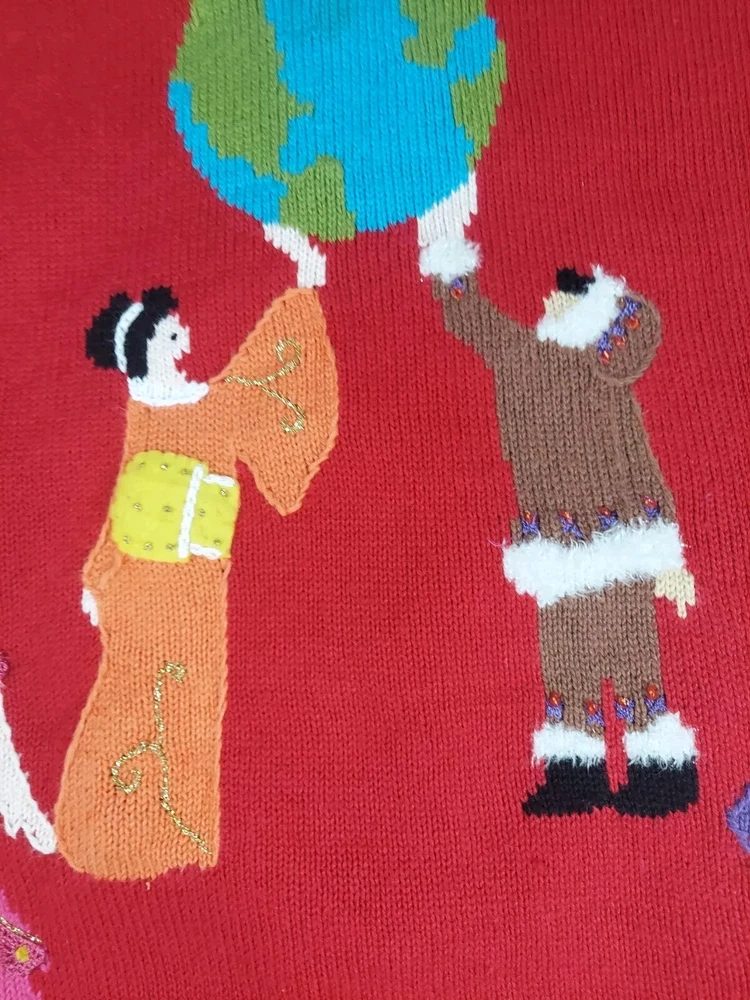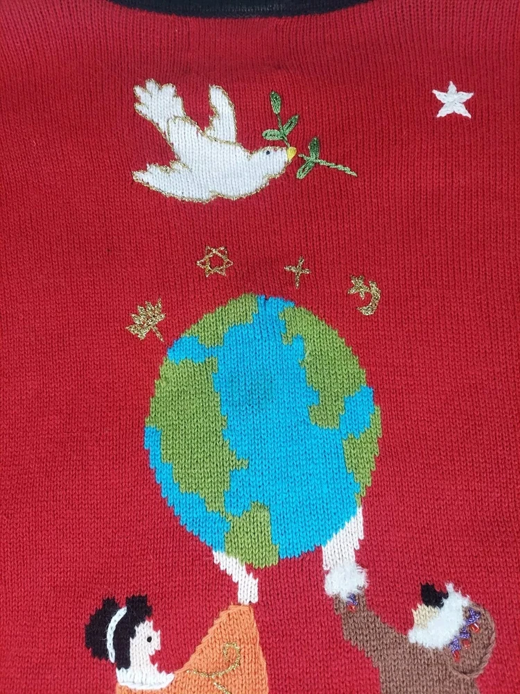 Storybook Knits Red Cardigan World Peace Earth People Sweater Women’s L Red cardigan style sweater with 8 people from around the world on front with stars and 4 people on the back with a Dove flying over Earth. Good used condition. Please see the pictures for measurements and condition. Smoke-free pet friendly