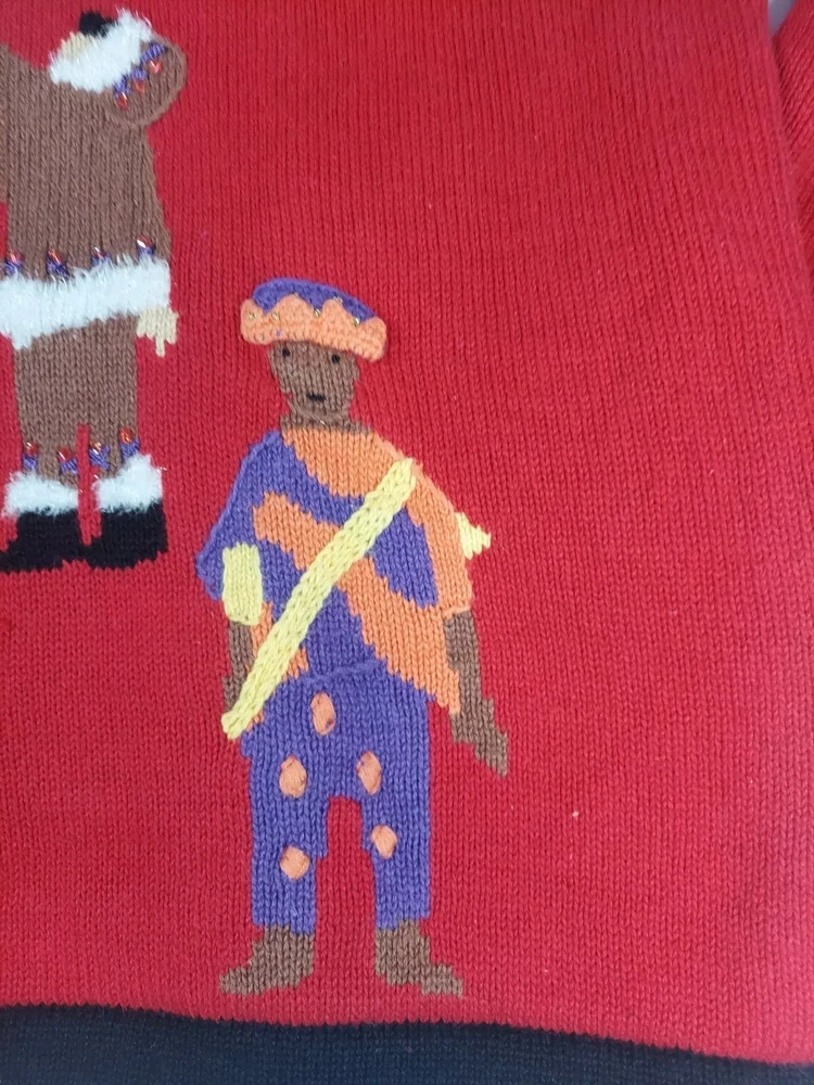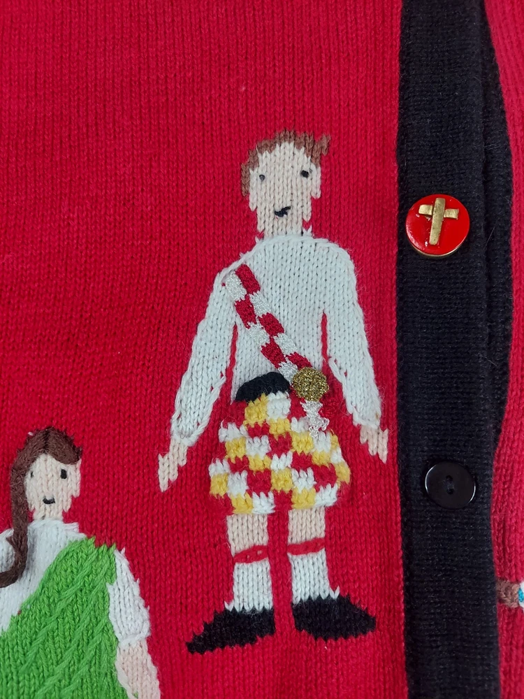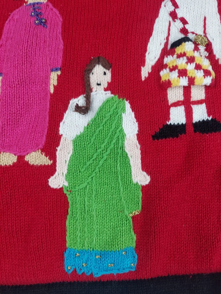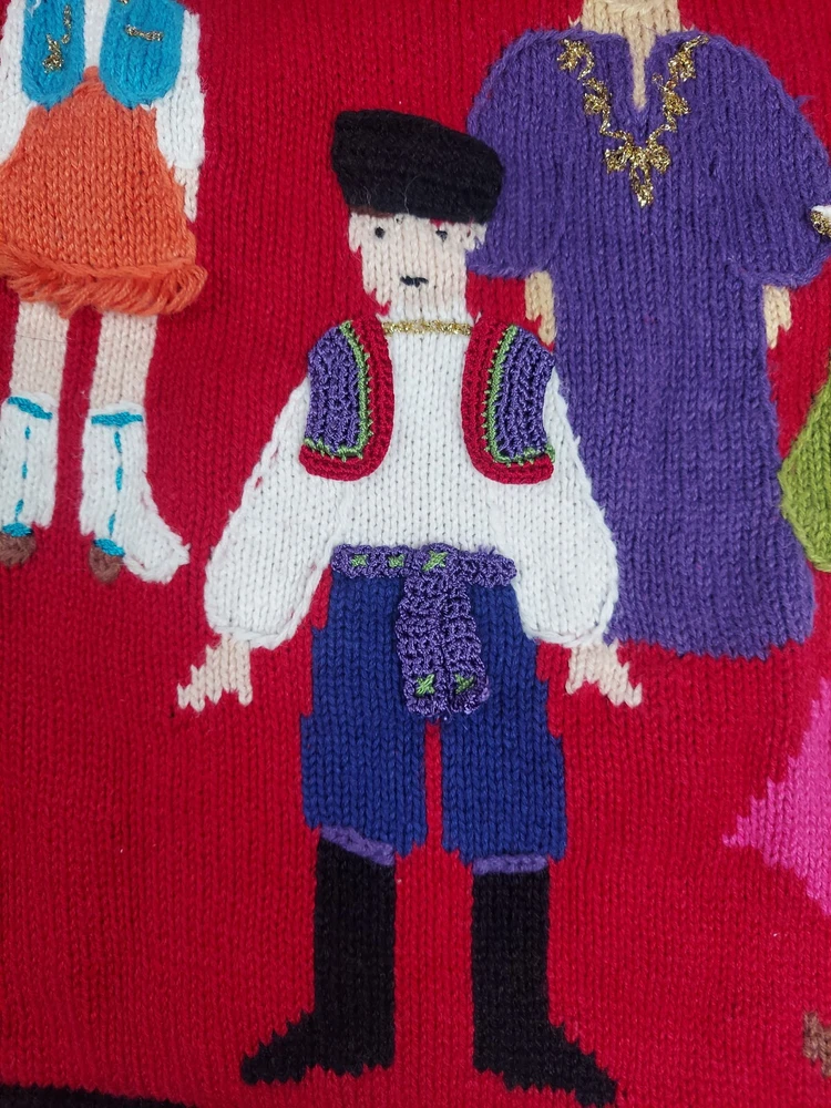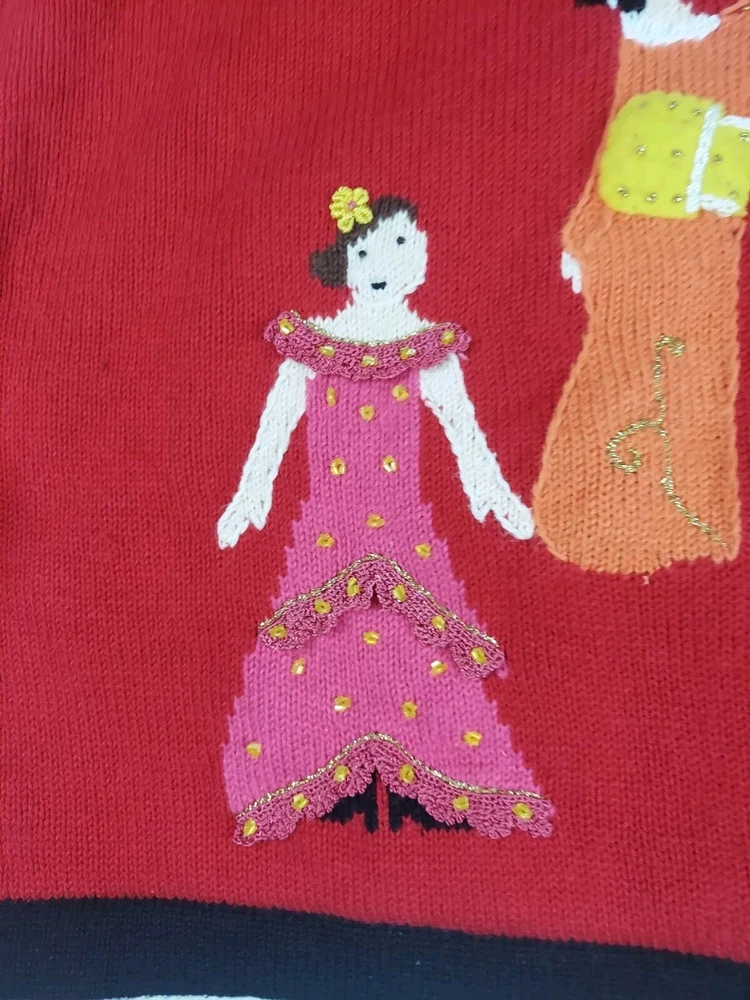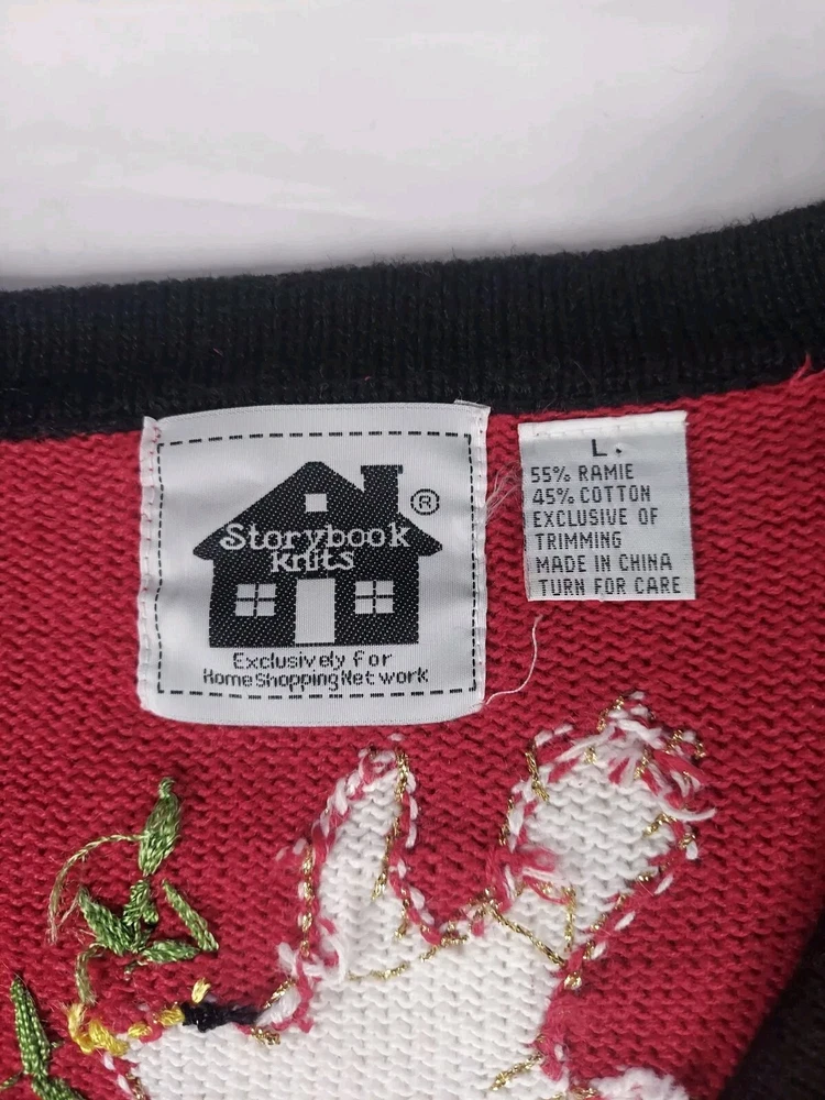 Storybook Knits Red Cardigan World Peace Earth People Sweater Women’s L Red cardigan style sweater with 8 people from around the world on front with stars and 4 people on the back with a Dove flying over Earth. Good used condition. Please see the pictures for measurements and condition. Smoke-free pet friendly