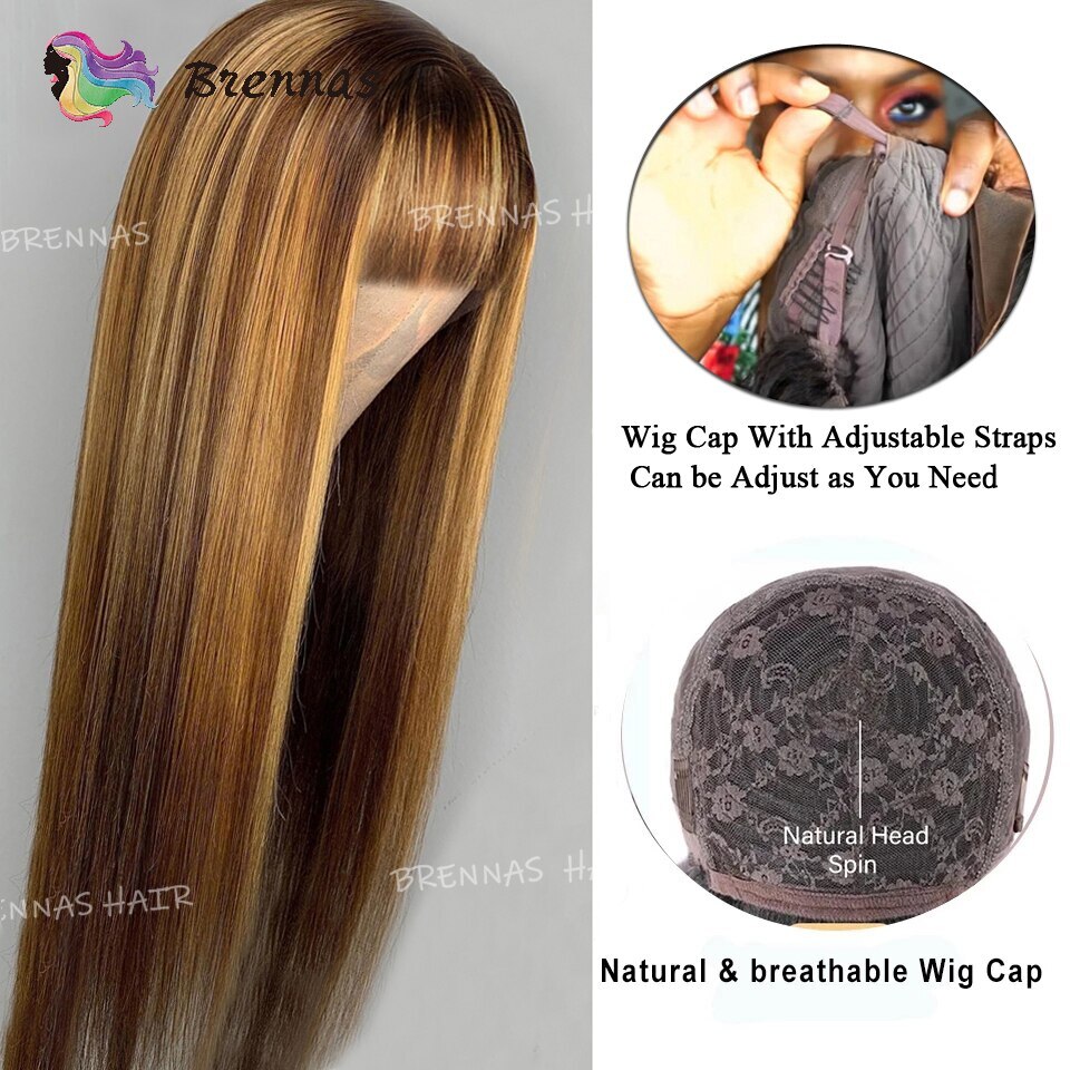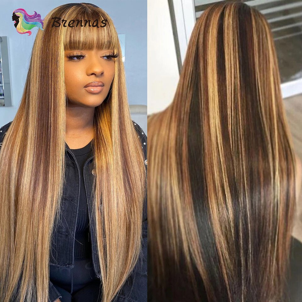Ombre Human Hair Wigs Highlight Straight Wig With Bangs Glueless Machine Made Wigs 100% Peruvian Human Remy Hair For Black Women Hair Color: Highlight honey blond color Hair Material: 100% Human Hair Hair Density: 150% 180% Density Available for Your Choice Capsize: Medium default Cap color: Medium Brown default Baby Hair and Bleached Knots : Yes Cheap Machine Made Wig Isee Hair Unice Hair Easy To Wear Human Hair Wigs Natural Hairline: Yes