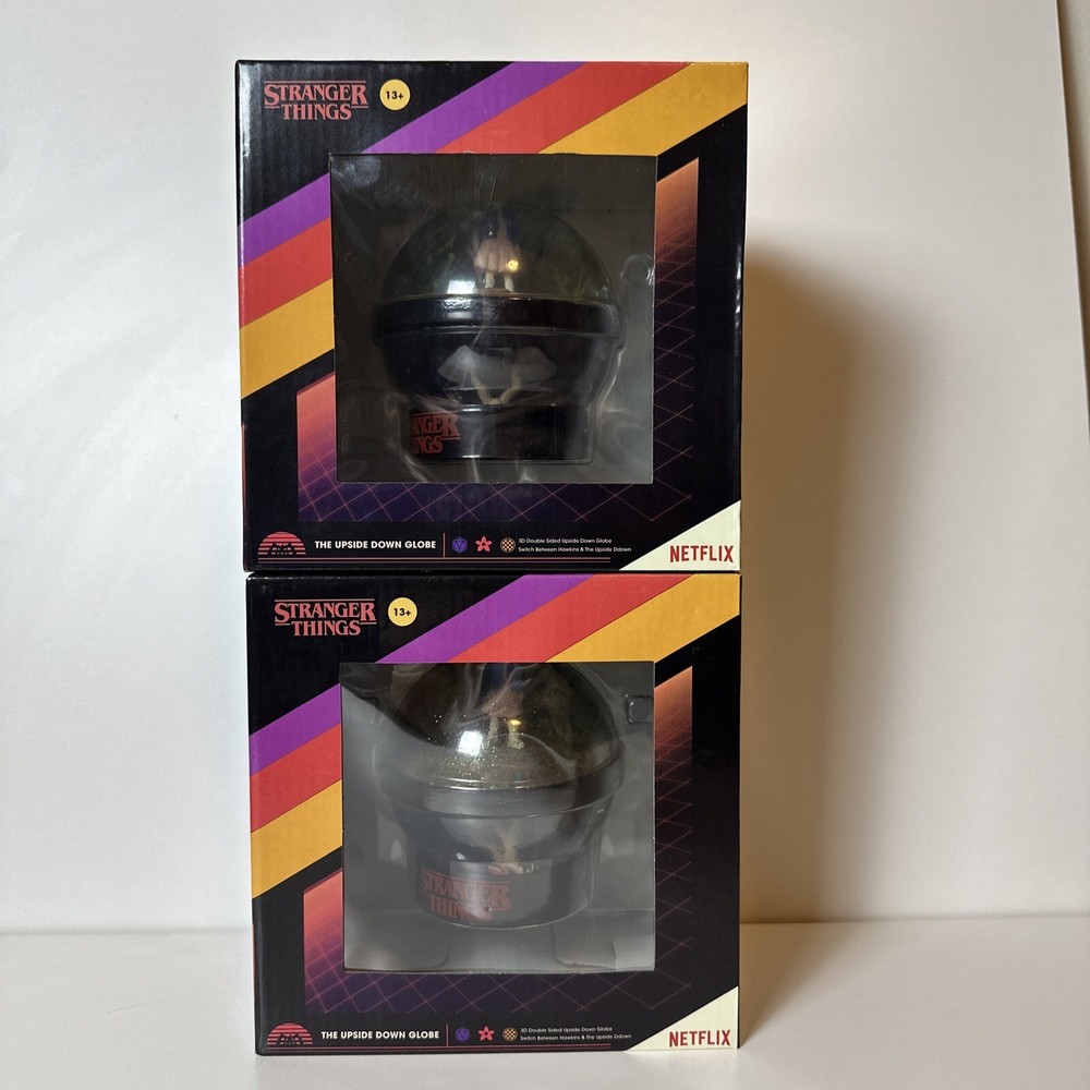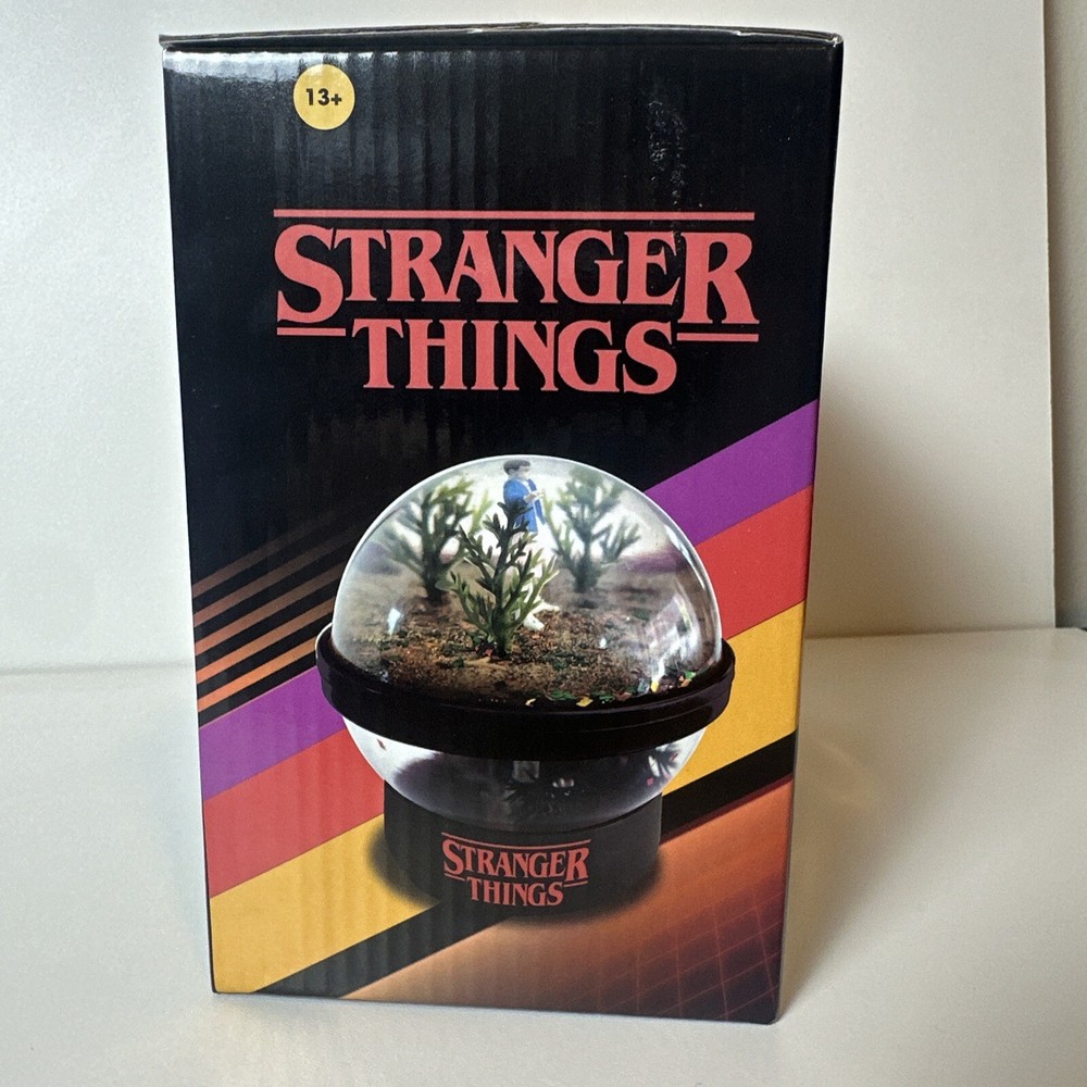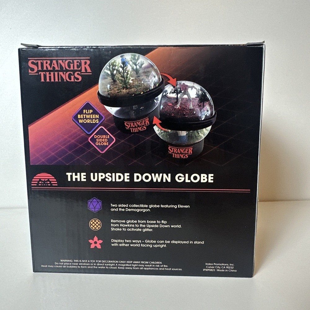 This double sided snow globe features characters from the hit TV series Stranger Things, including Eleven and the Demogorgon. The globe is round in shape and small in size, measuring 3.5" in height and 3.75" in width. It is a perfect addition to any collection, especially for fans of horror, fantasy, and science fiction. The snow globe is manufactured by Netflix and is an original piece. It has a multicolor abstract pattern and is filled with glitter. The globe comes with a base and can be flipped on either side, making it a great decorative item for all occasions. This snow globe is a must-have for anyone who loves TV, movies, and comics.