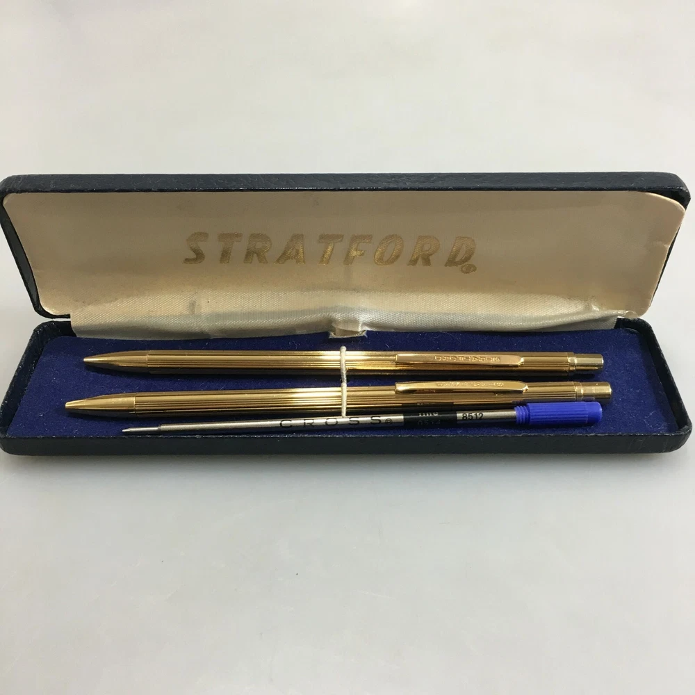 Stratford ballpoint pen and mechanical pencil set in case Includes blue Cross ink refill Made in USA Very good vintage condition! I am happy to answer any questions and provide additional photos. Check out my other items ! International buyers are responsible for any import tax or customs duties.
