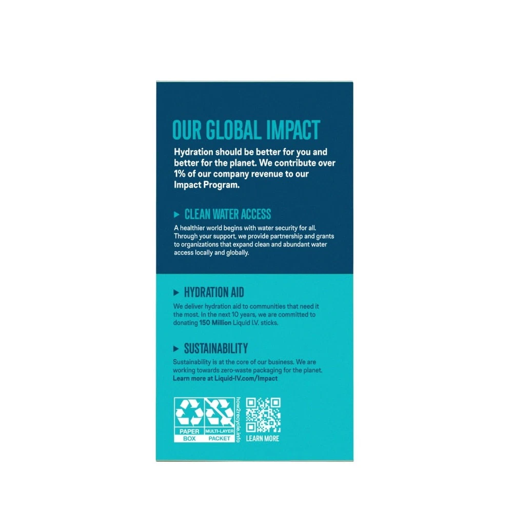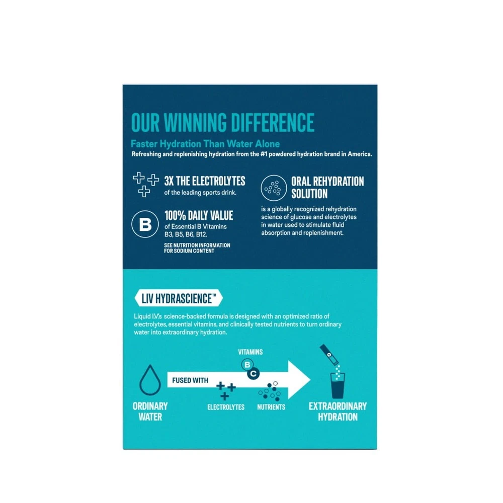 You may also like Protein Bars with 20g High Protein 1.9oz Bars Cookies & Cream 4 Count 13.36 USD 14.37 USD Free shipping 7% off 12 Count High Protein Nutrition Shake Milk Chocolate 8 fl oz 25.32 USD 27.23 USD Free shipping 7% off Chocolate Deluxe Protein Bars 21g Protein Gluten Free Low Sugar Snacks 4 Count 8.29 USD 8.91 USD Free shipping 7% off Sugar Free Kombucha Raspberry Lemonade Low Calorie Probiotic Beverage 12 Cans US 30.01 USD 32.27 USD Free shipping 7% off Chocolate Chip Dipped Chewy Granola Bars 1.1 oz Paper Box, 20 Count 8.23 USD 8.85 USD Free shipping 7% off Hydration Multiplier® is a great-tasting, non-GMO electrolyte drink mix powered by LIV HYDRASCIENCE™ to deliver hydration faster than water alone. Our formula is designed with an optimized ratio of electrolytes and clinically tested nutrients to turn ordinary water into extraordinary hydration. Scientifically formulated to quickly replenish electrolytes & fluids lost from sweat or exercise. Hydration Multiplier® has 3x the electrolytes of the leading sports drink, 8 vitamins and nutrients, and 100% of the daily value of 4 B vitamins: B3, B5, B6 and B12. Experience hydration for mental clarity, physical endurance, and overall wellbeing. At Liquid I.V.®, we believe a healthier world for all begins with equitable access to clean and abundant water. We partner with leading water, humanitarian, and community-based organizations to advance innovative solutions that help communities protect their water and their future. HYDRATION MIX: A great-tasting, non-GMO electrolyte drink mix that delivers hydration faster than water alone. GREAT TASTE: Enjoy the taste of freshly picked ripe strawberries topped with decadent notes of whipped cream. SCIENCE-BACKED FORMULA: Powered by LIV HYDRASCIENCE™, Liquid I.V.® is designed with an optimized ratio of electrolytes and clinically tested nutrients. EXTRAORDINARY HYDRATION: Hydration Multiplier® has 3x the electrolytes of the leading sports drink, and 8 vitamins and nutrients. It contains 100% of the daily value of 4 B vitamins: B3, B5, B6 and B12. Gluten-free, soy-free, and dairy-free. CONVENIENCE: Single-serving, travel-friendly packets are easy to enjoy on the go. Pour one easy-to-open packet into 16 oz of water, mix or shake, and hydrate. HYDRATION AID: Since 2015, we have donated over 55 million servings of Liquid I.V.® to those in need around the globe, and donate over 1% of our revenue to our Impact programs. NEW Wide Grip Kettlebell Exercise Fitness Weight Set 3PC 10lb 15lb 20lb 3 Pieces 34.66 USD 37.27 USD Free shipping 7% off 38 oz Airtight Glass Storage Jar W/ Lock Lid Coffee Beans Cereal Spices Jars 7.42 USD 7.98 USD Free shipping 7% off 1.5 Gallon 2 Peak HP Poly Wet/Dry Shop Vacuum Cleaner Portable Home Carpet Vac 37.32 USD 40.13 USD Free shipping 7% off Full Motion TV Wall Mount 10-50 Inch TVs W/ Tilt Swivel HDMI Cable UL Certified 22.68 USD 24.39 USD Free shipping 7% off Lawn Mower Blade Removal Tool Rigid Metal ConstructionEasy-Turn Clamp Handle 15.47 USD 16.63 USD Free shipping 7% off Penny Candy Glass Jar with Lid Cookie Jar 1 Gallon Food Storage Jar for Snacks 10.3 USD 11.08 USD Free shipping 7% off Kansas City BBQ Dry Rub Seasoning 14.5oz Gluten Free Flavors Beef Pork Chicken 9.64 USD 10.37 USD Free shipping 7% off Extra Strength Vitamin D3 Softgels 125 mcg 5000 IU Bone Immune Health 250 Count 9.81 USD 10.55 USD Free shipping 7% off Pole Saw Attachment Universal Automatic Lubrication for Cutting Limbs and Brush 56.09 USD 60.31 USD Free shipping 7% off 8" x 8" Glass Cake Pan Baking Dish Oven Safe Non Stick Bakeware Set Contains 7.71 USD 8.29 USD Free shipping 7% off Fiberglass Spinning Rod 6ft 2-Piece Medium-Light Fishing Pole Twist-Lock Handle 14.57 USD 15.67 USD Free shipping 7% off Heavy-Duty Wildlife Feeder Accessory Leg Adapter Kit for 350 Pound Feeder Metal 23.75 USD 25.54 USD Free shipping 7% off