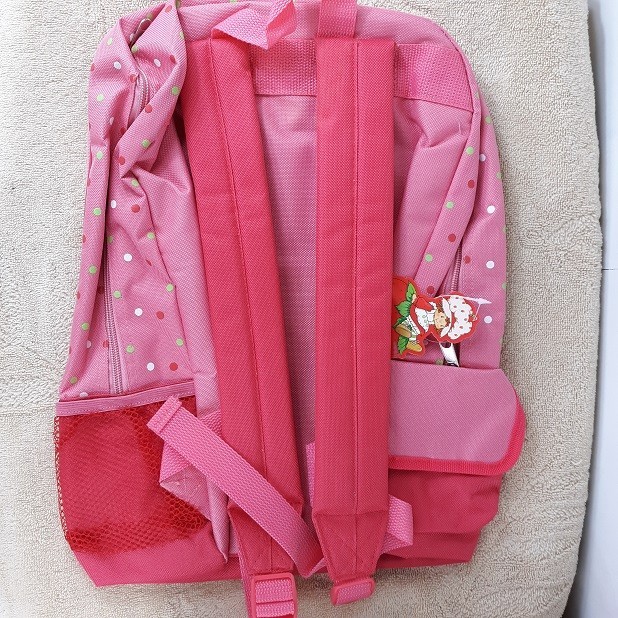 NEW WITH TAGS FULL SIZE STRAWBERRY SHORTCAKE BACKPACK. THIS PINK BACKPACK HAS A PICTURE OF STRAWBERRY SHORTCAKE AND HER PET KITTY ON IT. ONE LARGE ZIPPERED COMPARTMENT AND ONE MEDIUM ZIPPERED COMPARTMENT ON THE FRONT. MADE OF CANVAS WITH ONE MESH POCKET ON ONE SIDE AND A VEL--CRO POCKET ON THE OTHER SIDE. BACKPACK IS APPROXIMATELY 16" x 12" x 4" BUY IT NOW Check my auctions for more backpacks and lunchboxes. Shipping is $9.90 for ground advantage or $11.90 for priority for the USA. From a smoke free home. Ask questions before buying. Buyer is responsible for all taxes. International: Item may be purchased using eBay International Shipping.