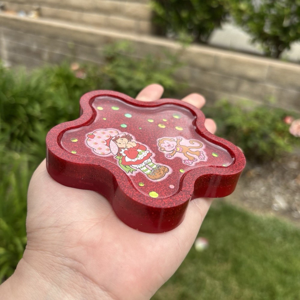 ‘Strawberry Disco’ Strawberry Shortcake Inspired Rhubarb Monkey and Reflective Dotted Red Sparkly Flower Shaped Resin Coaster Handmade by Shop EarthySmurf. *Please note, resin is an imperfect art. Craters, holes, sharp edges, bubbles and more may be present in your piece. Please examine all pictures*
