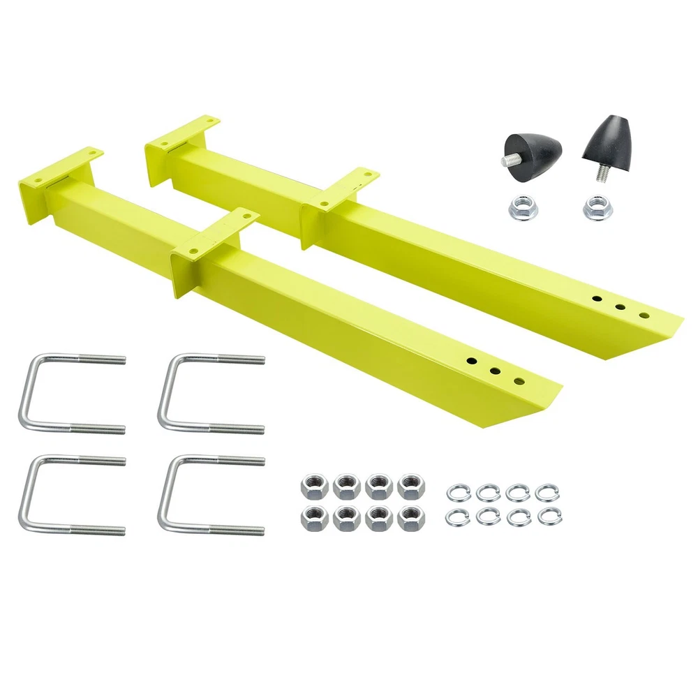 Universal Leaf Spring Traction Bars | Yellow Powder Coat Finish | 1 Pair Per Package | Rubber Snubbers | Includes Mounting Hardware DESIGNED TO ELIMINATE WHEEL HOP for added traction when horsepower levels are increased FITS MOST LEAF SPRING VEHICLES up to 3” wide (except some trucks) NOT RECOMMENDED FOR USE on vehicles with air shocks INCLUDES FOUR U-BOLTS AND TWO SNUBBERS to complete installation YELLOW POWDER COAT FINISH for great looks and long life
