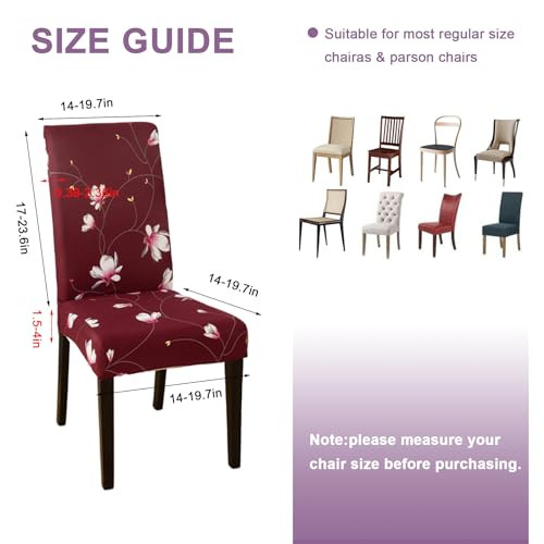 Return Policy Fast Delivery Trusted seller Dining Room Chair Covers Slipcovers Set of 6, Stretch Kitchen Chair Covers Washable Spandex Parsons Chair Slipcover, Removable Dining Seat Protector for Home or Party Product Description 【Premium Stretch Material】 dining room chair covers are made of high quality polyester and spandex fabric featuring two-way high stretchy and and luxurious, feel smooth and comfortable, wrinkle resistant and durable, designed with the anti-slip elastic band will secure dining chair slipcovers more fixed, an easy way to change your home decor. 【Suitable for Most Chairs】Stretch universal chair covers fit for normal and high back parson chairs. Chair-back height 17-23.6 inch and chair-back width 14-19.7 inch. Chair seat width and length 14-19.7 inch and thickness 1.5-4 inch. Kindly measure your chairs before ordering. 【Perfect Furniture Protector】Our spandex parsons chair slipcover can protect your chair from the dent, stains, accidental food& liquid spills, wear, tear, scratches and hair. Let your pets make themselves at home without sacrificing your spotless furniture! Keep your furniture brand new. Decorate your furniture with our chair covers for dining chairs to add a sense of beauty and vitality to your furniture. 【Suitable For You Decor】FUAGUI dining chair covers with various colors, and you can freely choose your favorite color to decorate your living room and bedroom. A variety of printed dining chair covers are suitable for various decoration styles. Decorative chair slip cover can be used for dining room, kitchen, hotel, restaurant, wedding banquet, meeting, celebration, dinner, ceremony, etc. 【Easy Care & Install】Our kitchen chair covers are machine washable, individually washed in cold water on a mild cycle, using a mild laundry detergent, not bleached or ironed. dining chair seat covers are easy to install and can be installed by one person in minutes. Shipping Returns Payment Shipping Shipping is FREE to all addresses other than APO/PO boxes in the lower 48 states. All our stock ships from US-based warehouses. Shipped via USPS or UPS (depending on location and package weight) Unless stated otherwise, all orders will ship within 24-72 hours of your payment being processed. Check our feedback to see the great reviews of FAST shipping we offer. Returns Seller does not accept returns Payment We currently accept payment via eBay managed payments only. Once payment is cleared, we will dispatch your shipment within 1-3 business days. Please refer to the "Shipping" tab for more information regarding shipping speed to your destination.