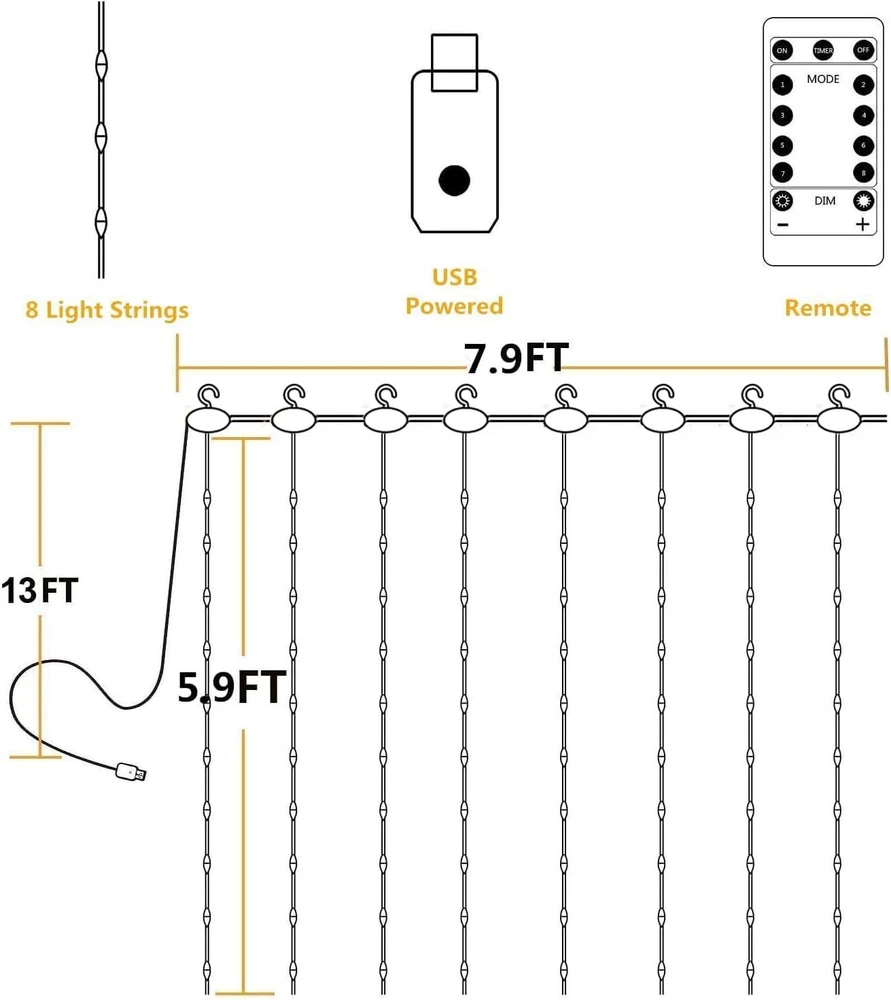 , the brand Professional only sells different styles of fairy lights on Amazon With 8 light settings,the White icicle lights are designed for home decorations,deal for Christmas Tree,Holiday Parties,Weddings,Background Wall Décor. Specifications Power:5W LED Quantity: 144pcs Input Voltage:5V DC Size:7.9 x 5.9 Ft Material:Plastic+Copper Cable Color: Transparent white Working Temperature:-25-40 C Quantities of strands of each Curtain: 8pcs Quantities of LEDs of each strand: 18pcs High Brightness 144 LED lights brighten up the happiness atmosphere inside or outside; 10 strands lights in total,widespread lighting source. Package Include 1x 144 LED curtain lights 1x Remote 1x Manual Our servicey:Waterfall Lights on Amazon are 18-month , 60 days money back or replacements for quality problem. 8 MODES WHITE CURTAIN LIGHTS --- Combination, in waves, sequential, slogs, chasing/flash, slow fade, twinkle/flash, and steady on. Great present icicle lights for dorm. NOTE: ONLY STRING LIGHTS,NO INCLUDE CURTAIN. CONTROLLER & TIMER FUNCTION --- Pressing the controller's Timer button, the white Christmas lights will keep 6 hours on and 18 hours off automatically once TIMER activated. USB OPERATED --- Very convenient for you to plug the USB port in any USB charger, power bank,etc.Note:USB Charger Not Included! Great Decoration For Indoor&Outdoor ---IP64 WATERPROOF,The Twinkle Lights are flawless for indoor/outdoor patio decorations. such as Outdoor Christmas tree, Valentine's Day, wedding decorations, Hallo ween decor, Holiday, Shows, Commercial Building, Shopping Center,etc. SAFE TO TOUCH --- CE and RoHS listed for safe operation. Passive cooling system prevents accidental burns and injuries, you will have no worry of using this Twinkle Lights for wedding/Christmas/Halloween decorations/party.