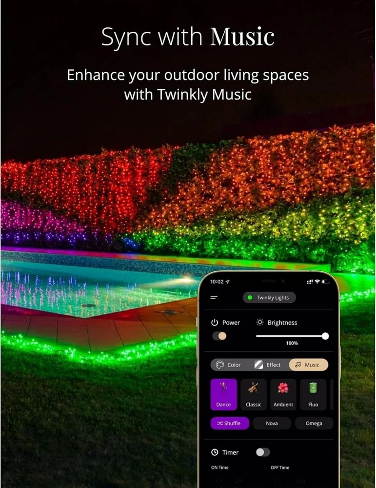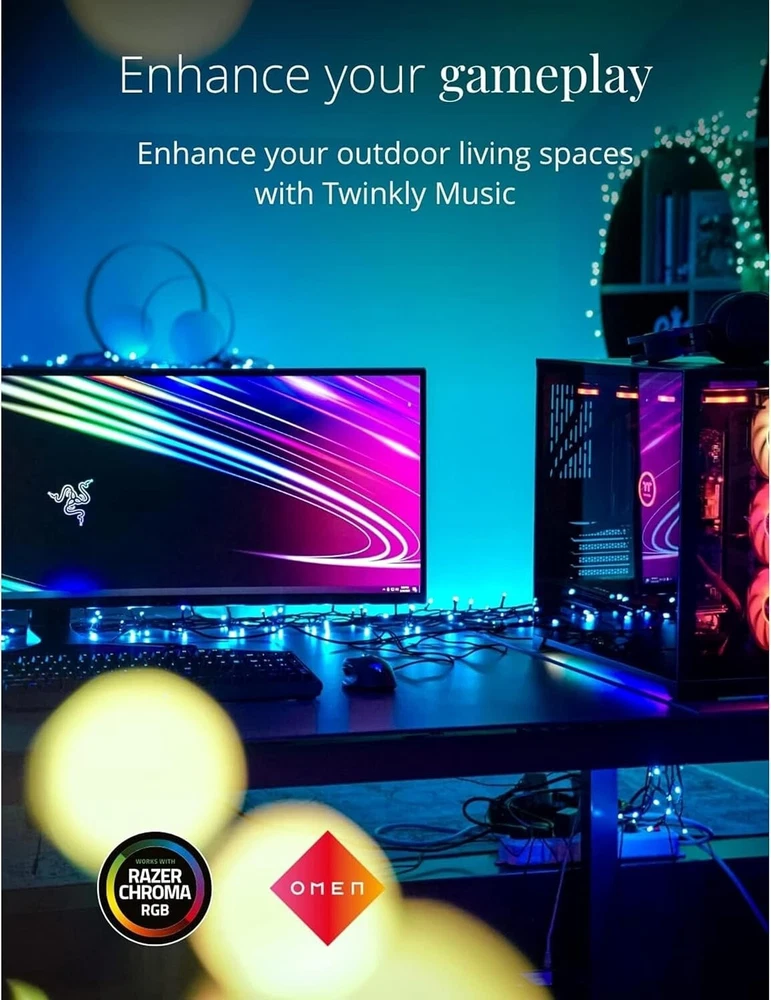 Strings 400 LED RGB+ White, LED Light String, in- and Outdoor Smart Multicolor LED Lights, Compatible with HomeKit, Alexa, and Google Home, Gaming, IP44, App Control, Green Wire, 105ft IN- AND OUTDOOR LIGHT STRING: 105 feet LED light string for ambient garden, patio, yard, or balcony lighting or as a Christmas decoration; 16 M+ colors and a choice of various warm or cool white shades CUSTOMIZED EFFECTS: enjoy a variety of customizable presets or create your own light show by choosing from over 16 million colors with the App; additionally, this version allows you to choose between warm and cool white light WATERPROOF: this LED light string is weather-resistant with IP44 certification, so they can be used as outdoor Christmas lights; create optimal lighting for memorable celebrations, like weddings, parties, barbecues, birthdays, or Christmas GAMING-READY: this outdoor LED light string is for all content creators, gamers, and streamers; it is fully integrable and compatible with the Homey app, Razer Chroma RGB, and OMEN Light Studio to ensure you an optimal gaming experience SMART: turn the LED lights on and off, dim them, or apply a timer in seconds using the app; it is also fully compatible with the voice assistants Alexa, Google Assistant, and Apple HomeKit to allow you to integrate with your smart home
