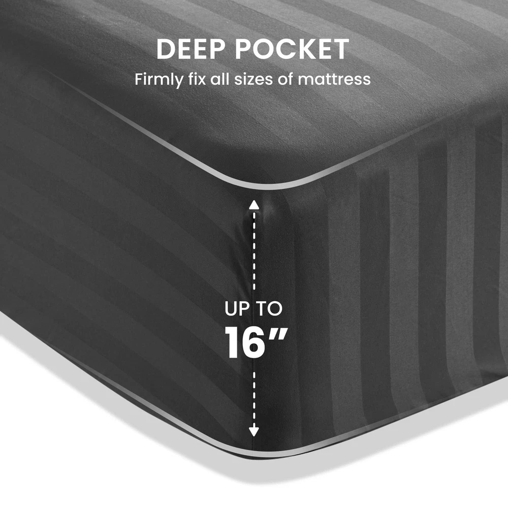 120g Damask Stripe Bed Sheet Sets Soft Wrinkle Free Fade Resistant easy LUXURY - We use yarns with advanced satin weaving craftsmanship, washing process to create this bed sheets. The satin width is more than 1 inch, presents different matte finish and lustrous colors under the light, adding extra elegance and luxury to your bedroom. Classic colors in White, Navy Blue, Grey and Stone Blue offer you timeless elegant looks and easy to match with your traditional and contemporary home decor TEMPERATUE REGULATION - Fabric treated with NANOTEX Coolest Comfort Technology. The advanced moisture-wicking fabric dries 100% faster than cotton, actually balances your body temperature, pulling moisture away from your skin out to the fabric's surface, moisture can more easily evaporate and gives superior comfort against your skin without extra heat and sweat. Leave you feeling refreshed and rejuvenated. It will keep you cool in the summer and warm in the winter ULTRA SOFT & COZY - The 120gsm over-thick, and ultra-soft double brushed microfiber fabric is thicker, softer and more durable than most market's 90gsm and 110gsm products. The excellent softness makes it very comfortable. Quality craftmanship keeps it more stable and durable. The sheets will provide you with the utmost soft and cozy sleeping experience DEEP POCKET & PRECISION FIT - Deep pocket fits mattresses up to 16 inches deep, perfect for oversized mattresses. All around covered by elastic to ensure the sheets stay on bed and not slip off or move around. Shrink and wrinkle resistant. Machine wash cold, do not use bleach, tumble dry low SIZE INCLUDE - Twin size includes 3 pieces - 1 Flat Sheet 66x 96 inch, 1 Fitted Sheet 39x75 inch, 1 Pillow Case 20x30 inch. Full size includes 4 pieces - 1 Flat Sheet 81x 96 inch, 1 Fitted Sheet 54x75 inch, 2 Pillow Case 20x30 inch. Queen size includes 4 pieces - 1 Flat Sheet 102x 90 inch, 1 Fitted Sheet 80x60 inch, 2 Pillow Case 20x30 inch. King size includes 4 pieces - 1 Flat Sheet 102x 105 inch, 1 Fitted Sheet 80x78 inch, 2 Pillow Case 20x40 inch