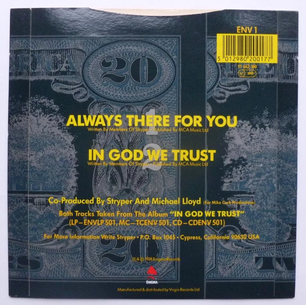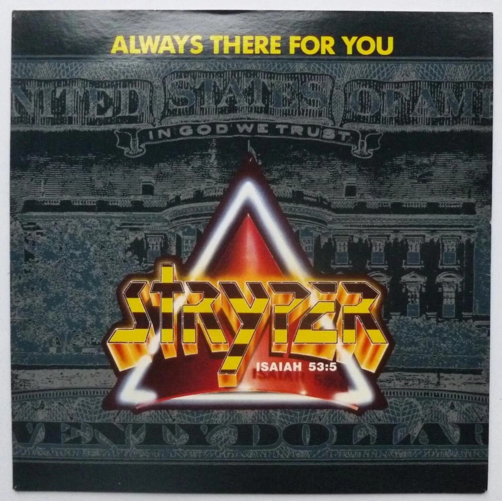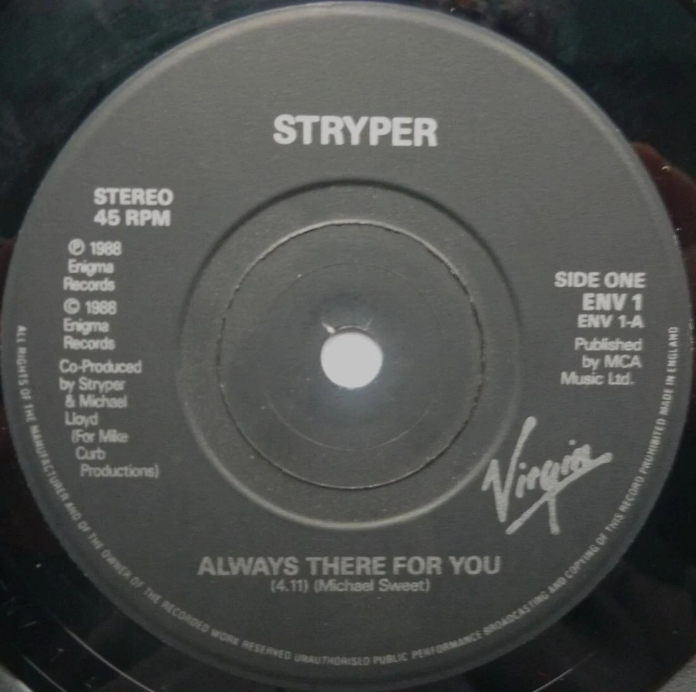 Artist: Stryper Title: Always There For You Format: 7" Label & Cat No: Enigma ENV1 Grading: EX/EX Year: 1988 Additional info: picture sleeve, Always There For You/In God We Trust *********************************************************************************** • thespacebar.records have been selling vinyl online for over 20 years. • We don't use stock photos. What you see is what you get. If we have multiple copies we'll send the best one. • If there are any issues when we come to pack up your record we will message to let you know and wait for you to confirm or cancel prior to shipping. • Much of our stock is in near-perfect condition. • Many items are unplayed but are graded conservatively as EX. • We're in the process of adding more photos to our listings. It's a big job. In the meantime if you'd like to see more images of any item, please send a message and we'll fast-track it. • We grade the vinyl 1st and the sleeve (if applicable) 2nd. • If there is only one grading and it seems very cheap, please check the item description carefully as we sell some records without sleeves and some sleeves without records. We always check with buyers before posting these items. • Singles that don't have a picture sleeve are supplied in an original company sleeve where possible. Otherwise they are sent in a plain white sleeve. • Records are supplied with a 400g polythene sleeve for protection. • To prevent seam splits, records are removed from their original sleeves for posting. • Everything is pressed in the UK unless otherwise stated in the item description. • More information/track listings/photographs available on request. Enjoy browsing our shop - Jeff & Catherine