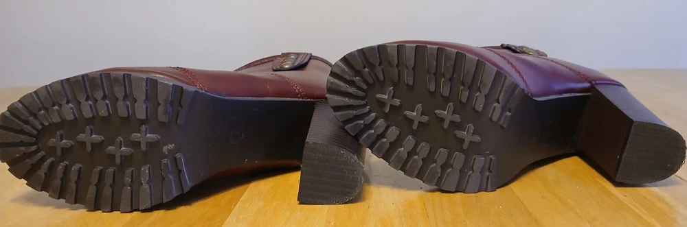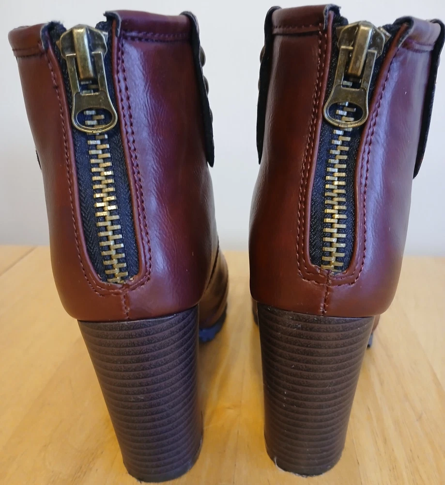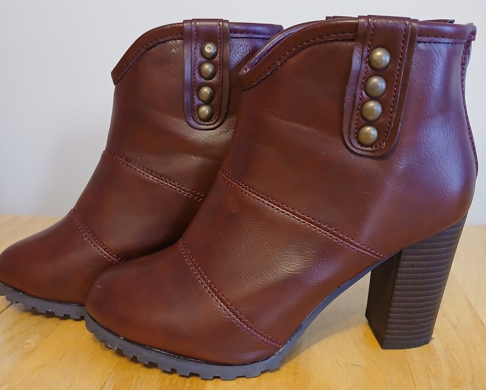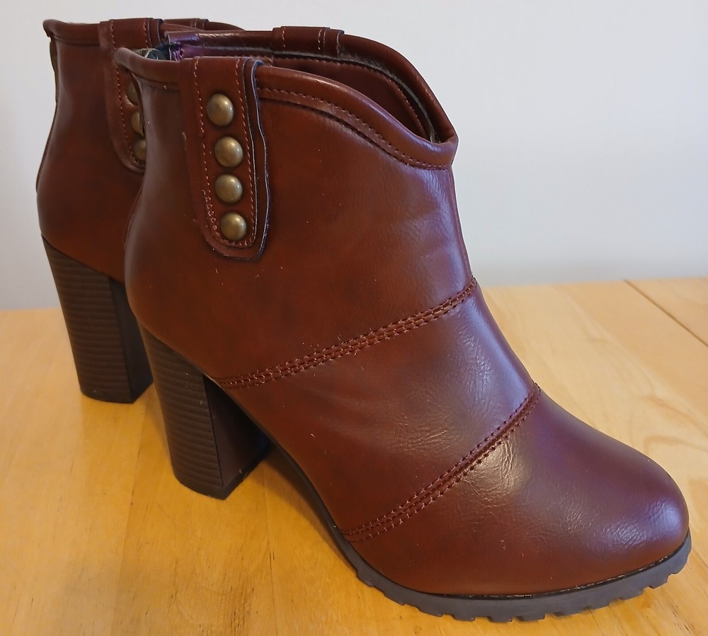 Great pair of booties from my personal collection. Bought them for a fun party, but only wore them once. The heel was a little too high for me to wear frequently, but it worked well for that night! They are easy to get on, as they have a zipper in the back. They are stylish and fun! The color is beautiful. Wine/Mahogany. There are a couple very small fabric imperfections, barely noticeable. Anxious for them to find a good home! :)