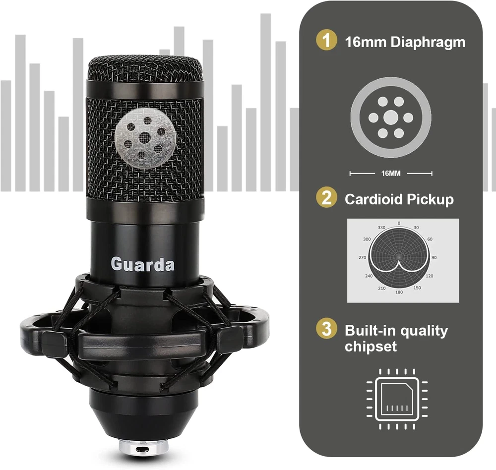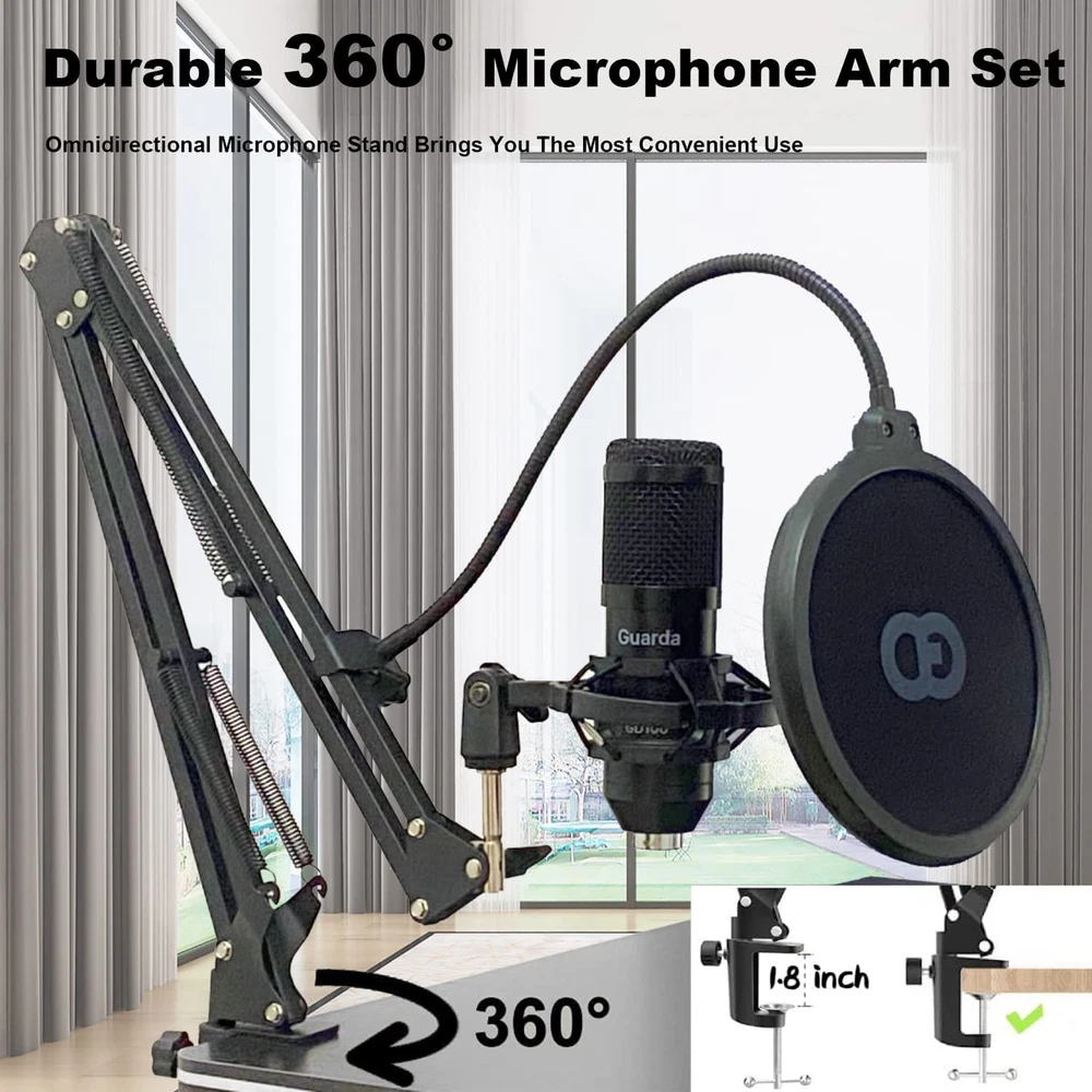 【PROFESSIONAL SOUND CHIPSET】 This condenser microphone is designed with a professional sound chipset so that microphones maintain high resolution sampling rates. Smooth, flat frequency response is excellent for singing, speech and Voice over, performance perfectly reproduced sound, high quality microphone ensures your exquisite voice again on the Internet. 【PLUG AND PLAY】The microphone has a 7.1 USB interface adapter for easy connection to your PC, MAC and Linux operating system, NO ADDITIONAL driver software required, no external sound card required. This makes you sound perfect on a podcast, live stream, video call, or most other recordings. 【ELECTRET CONDENSER TRANSDUCER & MAGNET RING】With 16mm electret capacitive transducer, USB microphone can give you a strong bass response. This professional condenser microphone picks crystal clear audio. The magnet ring on the USB microphone data line has a strong anti-interference function, so that you have a better feeling., so that you have a better feeling. 【STABLE MULTI-ANGLE MIC STAND DESIGN】A POP filter and foam windscreen, condenser microphone records your crystal clear sound, and shock absorber stand keeps microphone stable with damping function. Especially suitable for video voiceover; Podcasts. YouTube video. Skype meetings and so on. 【COMPATIBLE WITH ALL OS】Suitable for all laptops, PC and mobile phones. But if you want to connect to a phone, you'll need an OTG adapter (not included). Strong output, no distortion, low power consumption. Packing list: Capacitive microphone + adjustable arm + metal shock absorber + Pop filter + foam microphone windscreen + meter mounting clip + USB cable. Product Description Guarda Audio Technology Co., Ltd. was founded in 1992 , is a high-tech enterprise integrating technology, industry and trade. The company mainly designs, develops, produces, professional power amplifiers, microphones, professional audio mixers and professional equalizers and other electro-acoustic equipment series products. Today, Guarda Audio Technology Co., Ltd. has been tempered into a well-known professional audio manufacturer with unique management experience, advanced production equipment, strong design examples, strong marketing and service capabilities, leading the continuous improvement of professional audio technology in the Far East. Introduction GD100, professional condenser microphone which adopts the exacting complete electronic circuit control and gold-plate diaphragm capsule the microphone with a good cardioids polar pickup pattern, high output, low self-noise, and the accurate reproduction of even the most subtle sound, suitable especially for studios recording studios, broadcasting stations, stage performances and computer. Absolutely fulfill the requirement of high quality for broadcasting and recording. Feature Plug ‘n play - USB recording microphone plug and play, compatible with PC and Mac and live use of sound cards and other devices, no need to download special drivers or tools, can be used anytime, anywhere. This is a great microphone for streamers, online teachers, musicians and people who work from home. Stability - The boom arm can be easily installed on any desktop up to 1.8 "(46mm) thick, and its 360° rotation and 180° vertical and horizontal movement help you get the most comfortable position. Low noise - This capacitive microphone provides a quiet, noiseless output while maintaining maximum signal gain. Cardioid Polar Pattern - Cardioid is the most widely used pattern in professional microphones. It provides reliable performance in both stage and studio. As you move around to the sides and bottom of the microphone, the cardioid pattern becomes less sensitive and will pickup less sound. Specifications: Polar pattern: uni-directional Frequency response: 20Hz-20kHz Sensitivity: -38dB±2dB (0dB=1V/Pa at 1kHz) Output impedance:150Ω±30%(at 1kHz) Load impedance: ≥1000 Ω Equivalent noise level: 16dBA Maximum sound pressure level:130dB(at 1kHz≤1%T.H.D) Signal noise ratio: 78db Electrical current: 3mA