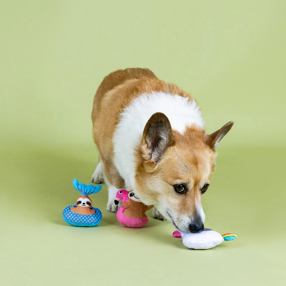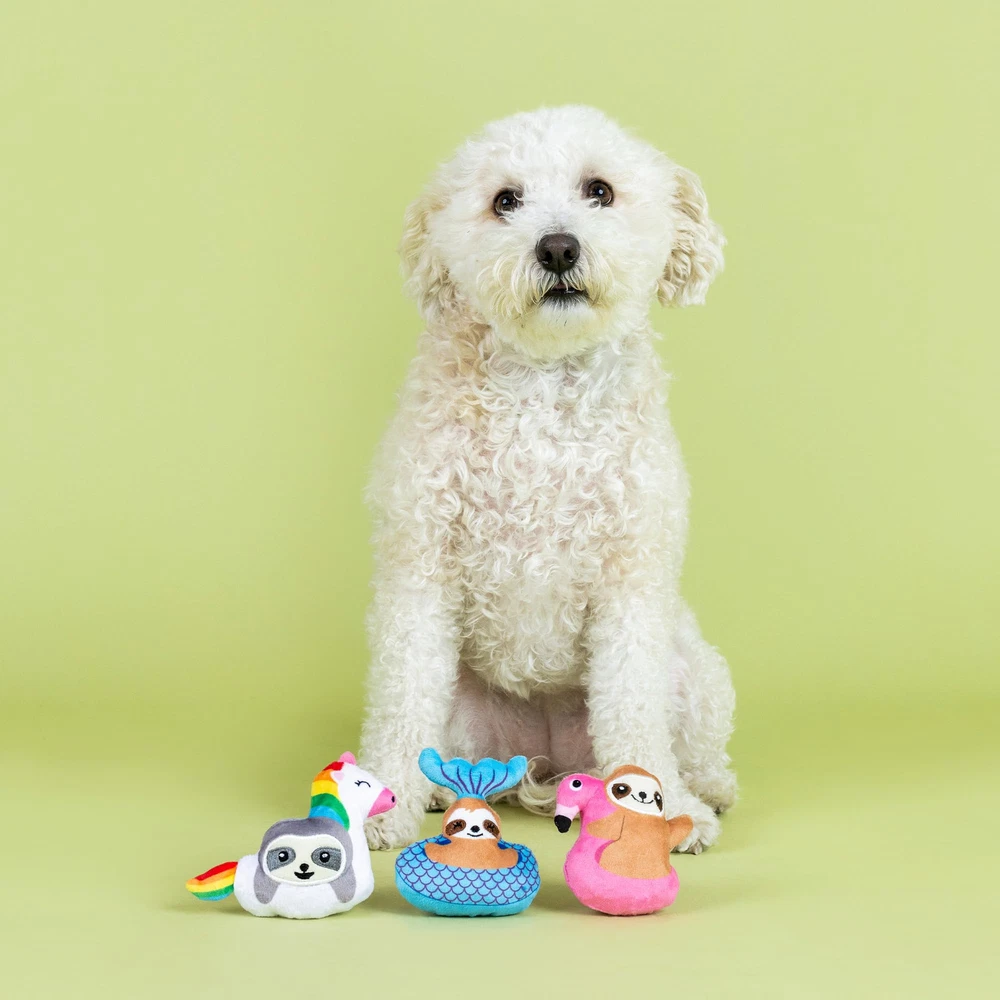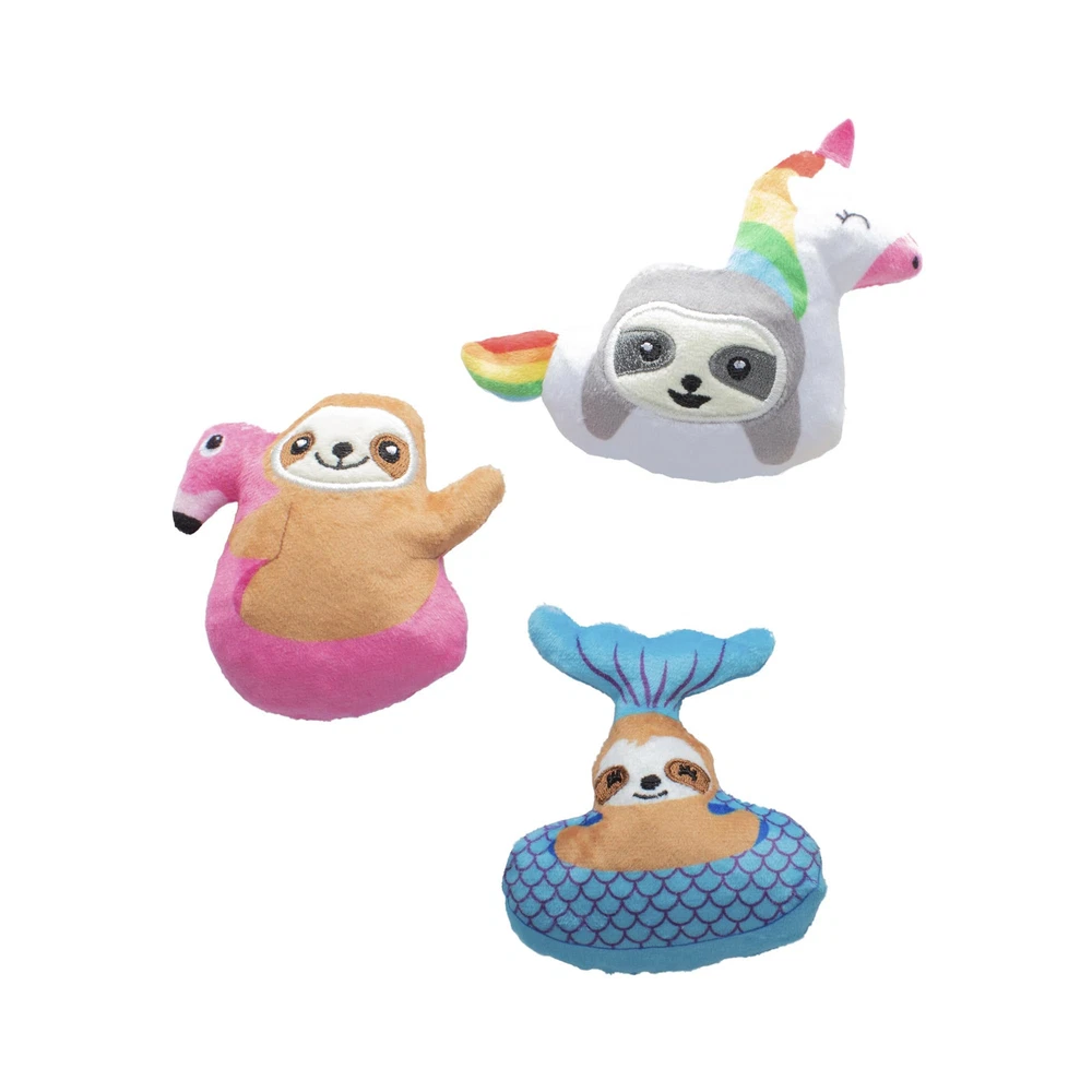 Slothin' up the sun! PetShop by Studio's “Just Keep Floating” 3 piece mini plush toy set is perfect for the pup that likes to play all day. Made with a loud squeaker and crazy crinkle paper in each toy, this trio is sure to bring the pool party to your pup. Great for small dogs and not intended for aggressive chewers. 3 toys for 3 times the fun Loud squeaker in each toy Crinkle paper in each toy Great for fetch & play Approximate sizes - Mermaid Sloth: 4" h x 3.5" w; Flamingo Sloth: 3.5" h x 3.5" w; Unicorn Sloth: 4" h x 5" w