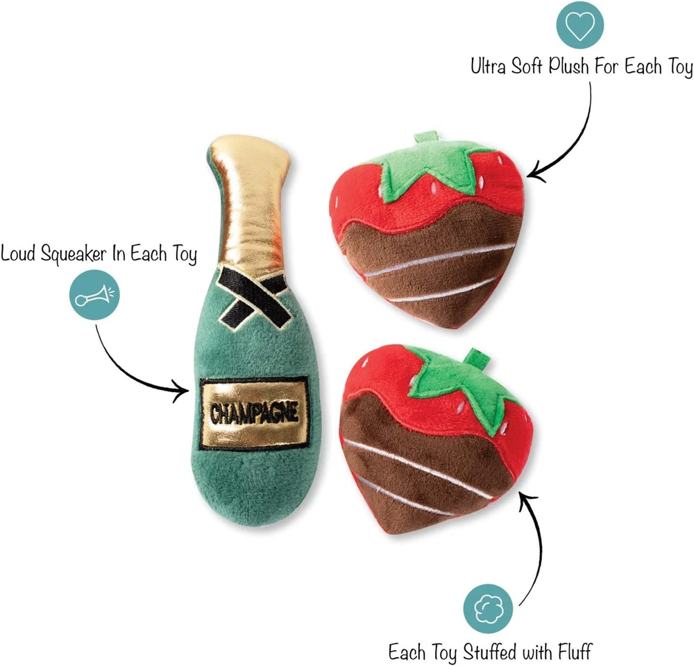 “Love Drools” Toy features a loud squeaker in each toy Perfect for small sized dogs Champagne 7” H X 2.5” W / Chocolate Strawberry 3.5” H X 3.5 ”W 9.06" x 7" x 2" with Headercard Super Squeaky Pet Toy! Even though this one-of-a-kind plush is undeniably adorable, it’s what’s on the inside that really counts. Your friend will love discovering the loud internal squeakerin each toy that’s sure to tempt her to play an exciting game of fetch or catch. This novelty toy makes the paw-fect pal for any sidekick who loves a good snuggle! For small sized dogs, but not recommended for aggressive chewers.