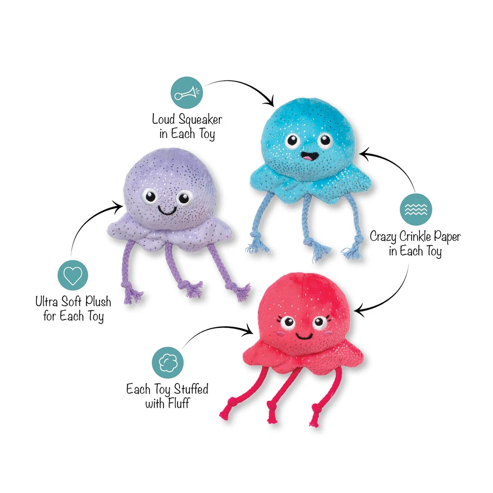 Feelin' octo-mistic! PetShop by Studio's “Too Tenta-Cool” 3 piece mini plush toy set is perfect for the pup that likes to play all day. Made with a loud squeaker and crazy crinkle paper in each toy, plus tuggable rope on each toy, this trio is sure to octo-py your pup. Great for small dogs and not intended for aggressive chewers. 3 toys for 3 times the fun Loud squeaker in each toy Crinkle paper in each toy Tuggable rope on each toy Approximate sizes - Blue Octopus: 5.5" h x 4.25" w; Pink Octopus: 5.5" h x 4.25" w; Lavender Octopus: 5.5" h x 4.25" w
