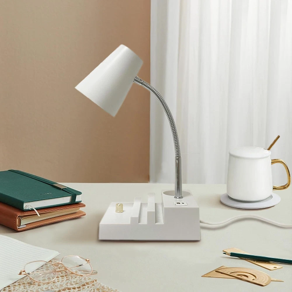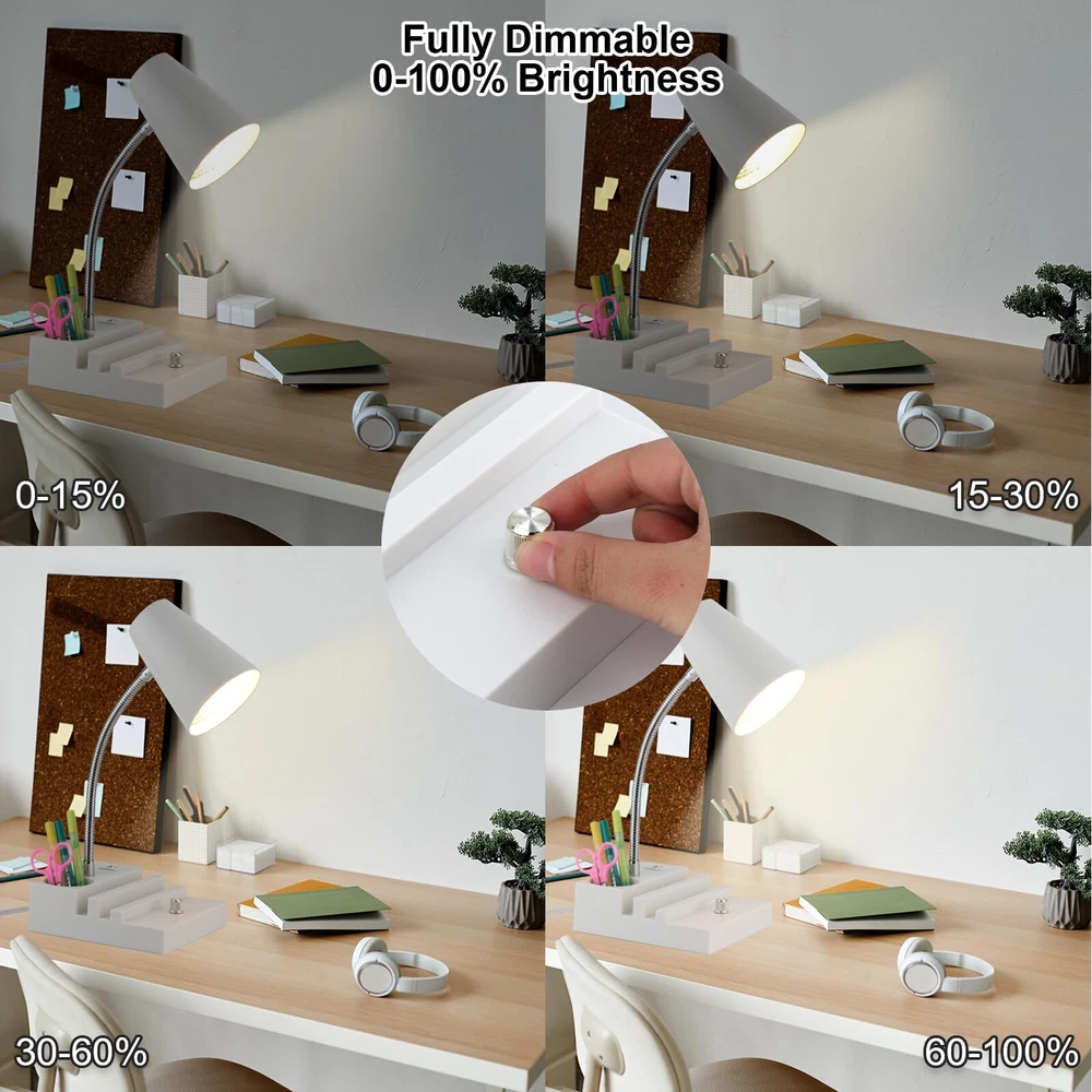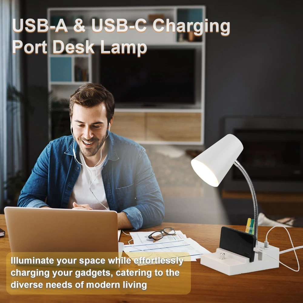 【Desk Lamp for Home Office】Streamline your workspace with this multifunctional desk lamp featuring a built-in pen holder and phone stand. Organize your essentials – phone, photos, pens, rulers, and more – effortlessly. Enhance your study or work environment, making your desktop tidier and saving valuable space. A must-have for home offices, kids' study spaces, reading nooks, or dorm rooms. 【Desk Lamp with USB and Type-C Charging】Our table lamp not only efficiently charges your devices through USB and Type-C ports but also adds a touch of style. With its built-in charging capabilities, this lamp goes beyond illumination, making it a thoughtful and fashionable addition to your workspace. Keep your devices powered up for productivity without the hassle of searching for outlets. 【Stepless Dimming LED Desk Lamp】Elevate your lighting experience with our innovative stepless dimming feature. Effortlessly customize your illumination by simply twisting the switch – no preset levels, just uninterrupted, fluid brightness control. Tailor the light to your mood, task, or time of day with this sleek and versatile desk lamp. 【360°Adjustable Angle Table Lamp】Crafted for optimal study and work conditions, our table lamp features an adjustable lamp head for effortlessly finding your ideal lighting angle. Its simple and lightweight design makes it perfect for any workspace, whether in the office, kids' room, or college dorm. Illuminate your tasks with ease and style. 【Eye-Caring Desk Lamp with Warm Glow】Experience soothing illumination for your study or work sessions with our desk lamp, designed to be gentle on the eyes. Included as a bonus, we offer a complimentary 7W light bulb to ensure you have everything you need for a warm and comfortable workspace.