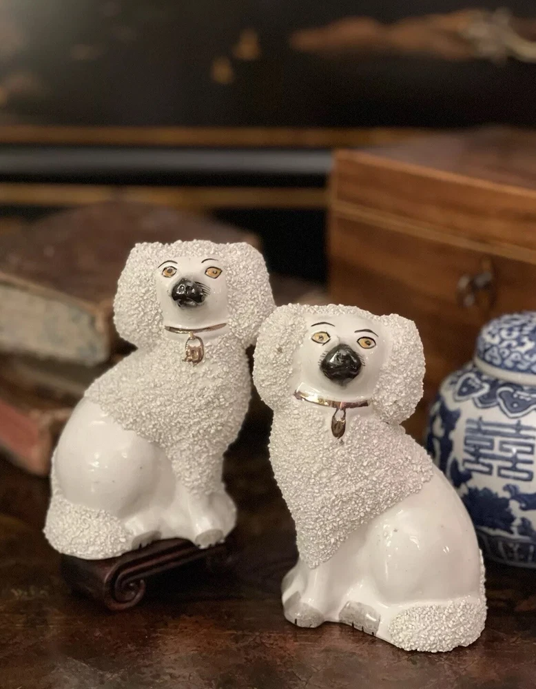 Stunning Rare Antique 19C English Porcelain Staffordshire Mantle Dogs β’ Classic Staffordshire β’ Marvelous Period Examples β’ Textural Coats β’ Height 4.5β Offered for you is your chance to own a stunning rare 19C pair of sought after period English Staffordshire textural glazed mantle dogs in classic form and lovely versatile scale. Highly desirable for their timeless style, this darling pair of right and left facing Staffordshire figures will bring a touch of the English countryside to any setting in which they are placed when displayed on their own or as part of a collection or arrangement. Stunning surviving examples. Minimal expected characteristic manufacturing anomalies and typical age related wear as is common to pieces of this antique status. Superb. Over 100 years old. No longer manufactured. Display ready. * Listing is for pair of spaniel mantle dogs only. Other objects are for display purposes. Height 4.5β
