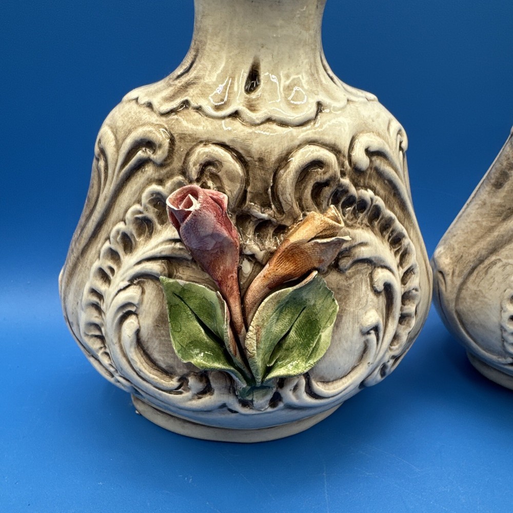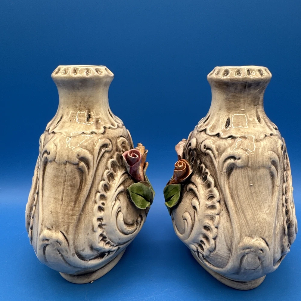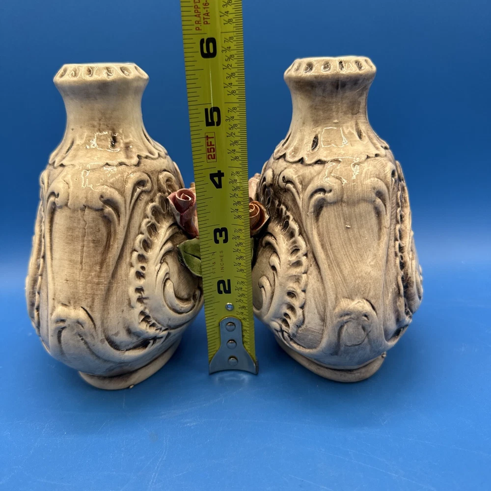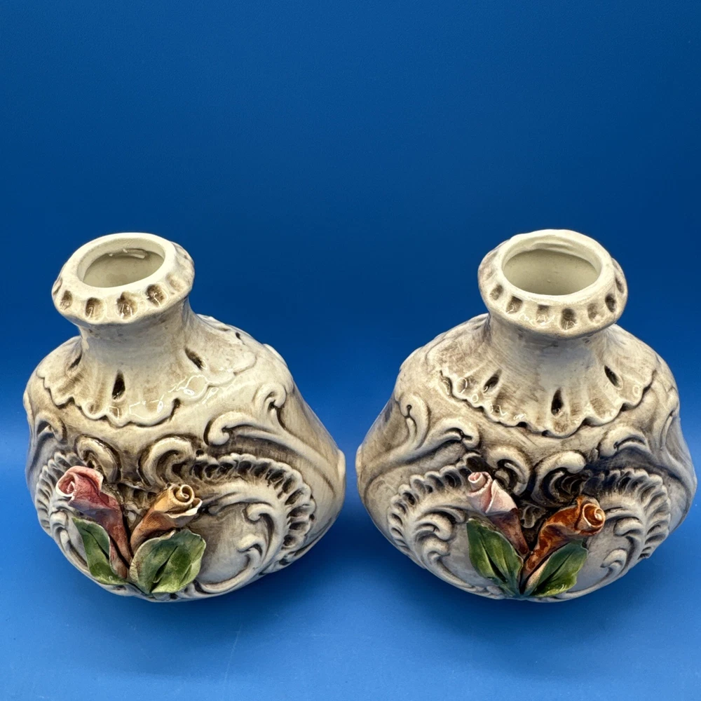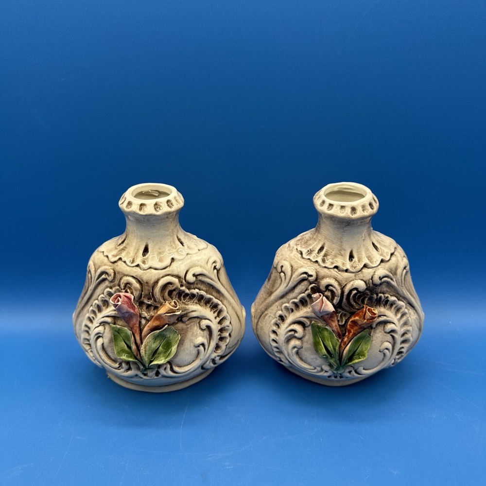 This is a set of two stunning vintage porcelain vases from Capodimonte, Italy. The vases feature a beautiful floral pattern and are crafted from porcelain. They would make a lovely addition to any home decor with their intricate design and Italian craftsmanship. Pre-owned condition. No original box. Vases are 6 inches tall. The flowers have some small chips. Please check the pictures carefully as part of the description. Feel free to ask questions if you need more information before you buy it. Thank you for your interest B-10
