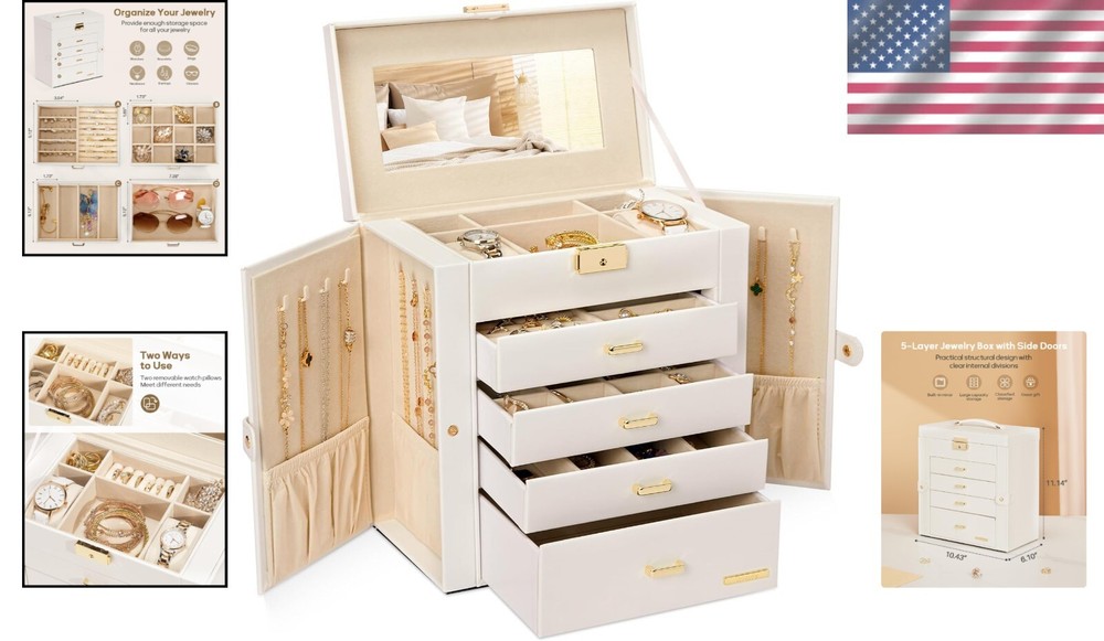 Stunning Lockable Jewelry Case with 4 Drawers - Ideal for Organizing Accessories ‹ › ‹ › ‹ › ‹ › ‹ › ‹ › ‹ › ‹ › ‹ › ‹ › ‹ › Stunning Lockable Jewelry Case Organize your precious jewelry and accessories in this elegant and functional jewelry case. Perfect for any collection! Key Features: Stunning black faux leather surface with a soft velvet lining, exuding sophistication. Dimensions: 10.43’’ (L) X 6.10’’ (W) X 11.14’’ (H), ample space to house watches, necklaces, earrings, bracelets, hairpins, brooches, and more. Four pull-out drawers: one deeper bottom drawer for larger jewelry and three equal-sized drawers. Drawer organization includes a combination of earring cards, ring rolls, and various compartments for your accessories. Each drawer features a delicate handle for easy access and a touch of elegance. Swing-out cabinets with 8 necklace hooks and 2 storage ledges to keep necklaces untangled and organized. Benefits: Elegantly designed to complement any room decor. Protective lock and key mechanism for peace of mind. Ribbon attached to the lid prevents it from falling back, enhancing usability. Built-in mirror for a convenient dressing experience. Thoughtful gift for special occasions, including Valentine's Day, Mother’s Day, birthdays, and weddings. Why Choose Our Lockable Jewelry Case? Let your treasured possessions shine while they remain beautifully organized and securely stored. This lockable jewelry case is not just a storage solution; it's a statement piece that enhances the beauty of your jewelry collection. With its elegant design, protective features, and thoughtful organization, it makes the perfect gift for any jewelry lover. Elevate your accessory storage and delight someone special by ordering this luxurious jewelry case today! Shipping Free & Fast Shipping - We offer free shipping to most of the USA with a normal delivery time of 3-10 businessdays. However, due to various situations, additional delivery time (up to 3 weeks) may be required for some items. Alternative Carriers - We may use alternative carriers (e.g. USPS, FedEx, UPS, etc.) to ensure your package arrives safely and on time. Due to the use of multiple carriers, we are unable to provide a tracking number automatically. Handling Time - Orders are processed and shipped within 1-5 business days of receiving cleared payment. Shipping Restrictions - Shipping to Alaska, Hawaii, Puerto Rico, Guam, and other US territories may incur shipping charges or delivery restrictions. Please contact us before ordering, or your order can be refunded/cancelled. State Restrictions - There may be restrictions based on your state of purchase. For example, certain items may not be shipped to California due to state regulations. Contact for Tracking Updates - If you require tracking updates or have any concerns about the delivery of your order, please feel free to contact us, and we will be happy to assist you. Return Please see our ebay return policy. We do not accept return on most products. This is to avoid customers mis-using ebay returns. All sales are final. Please be sure to check the return policy listed at the top of the listing. In rare cases, we may accept returns, if the buyer pays both ways shipping and 20% restocking fee. If you are un-sure of return policy of a particular item, please ask before buying. Payment We accept all major credit cards, PayPal, and Apple Pay for your convenience. Your payment information is secure and encrypted to ensure a safe and seamless transaction. Please complete your payment within 3 days of purchase to avoid any delays in shipping. Feedback Your feedback is extremely important to us. We strive to provide the best products and customer service possible. If you are satisfied with your purchase, please take a moment to leave us a positive review. If you have any concerns or issues with your order, please contact us before leaving negative feedback. We are committed to resolving any problems and ensuring your satisfaction. Contact Us If you have any questions or concerns, please feel free to reach out to our customer support team. You can contact us through the eBay messaging system. We are available Monday to Friday, 9:00 am to 5:00 pm EST, and we will do our best to respond to your inquiry within 24 hours. Buy it now and enjoy a pleasant shopping experience! UPC: Not Set Unit Quantity: 6.84 Items Included: Jewelry Box,Removable Pillows,Drawer Organizers Suitable For: Bracelet,Earring,Necklace,Ring,Watch,Bangle Material: Faux Leather,Leather,Velvet Theme: Not Set Features: Mirror,Lockable,Pull Out Drawers,Swing Out Cabinets Brand: Unbranded Type: Jewelry Box Color: White Lining Material: Leather Shape: Rectangle Country/Region of Manufacture: Not Set Department: Women Capacity: More Than 25 Pieces Item Length: Not Set Item Depth: 6.10 in Item Width: Not Set MPN: Not Set Unit Type: lb Vintage: Not Set Handmade: Not Set Personalize: Not Set Customized: Not Set