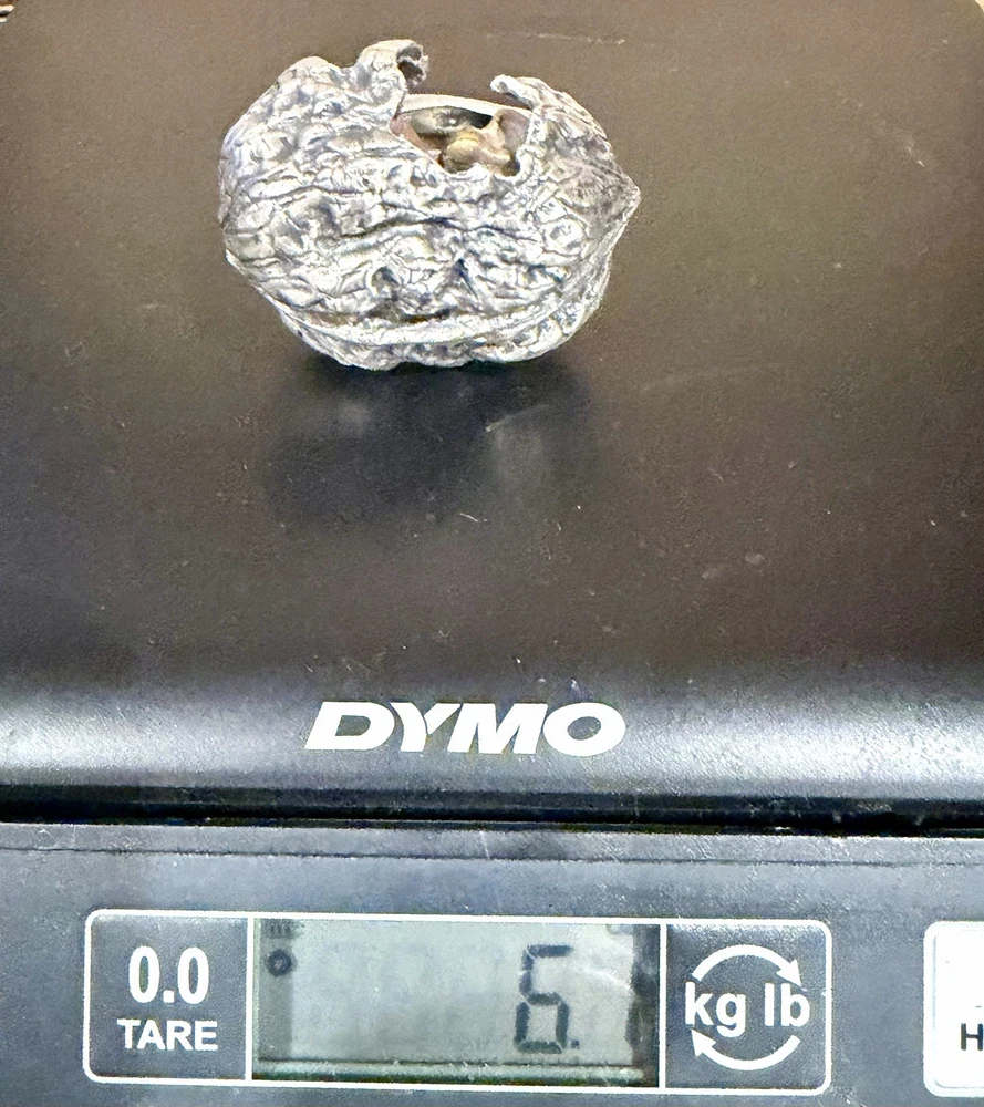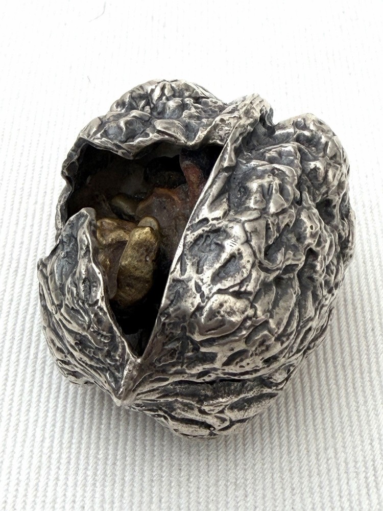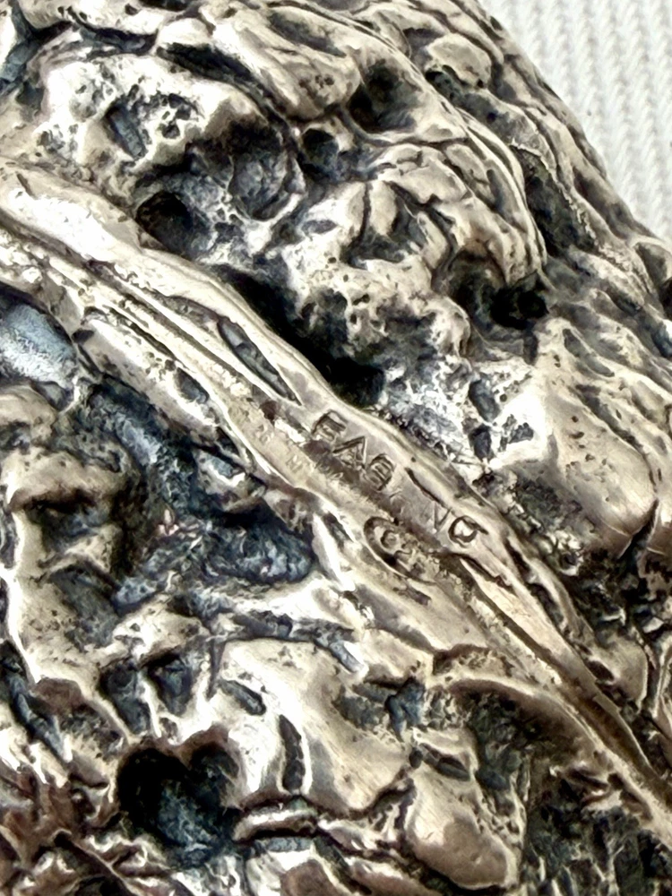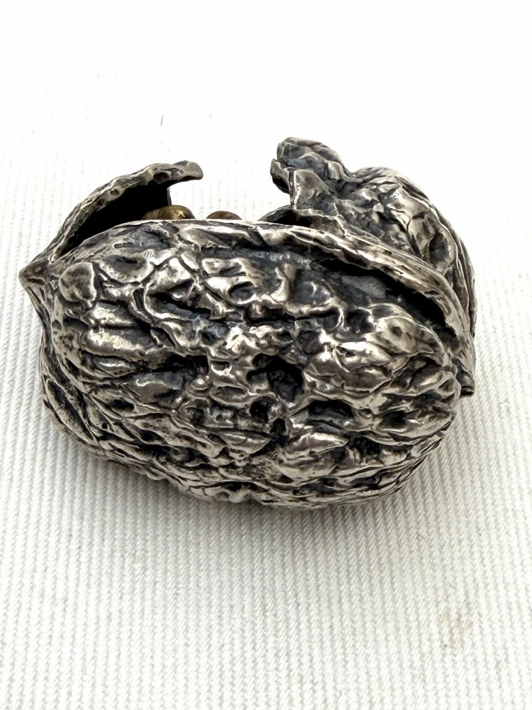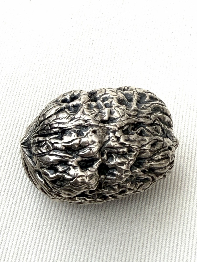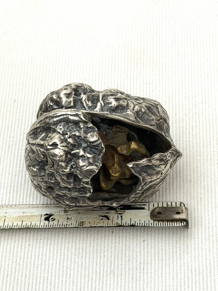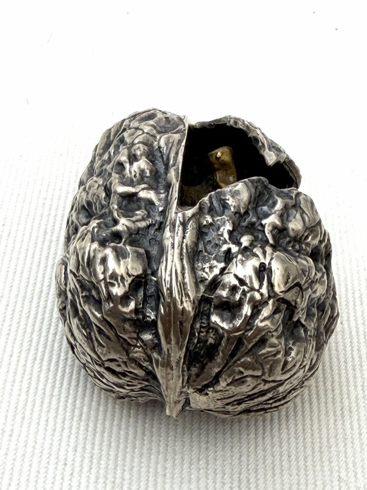 Stunning Sterling Silver 925 “Fabano” Figural Walnut Nut with Bronze Interior – 6.1 oz – Rare This unique and beautifully crafted piece is made of solid sterling silver 925 and is marked accordingly, along with a maker’s mark that appears to read “Fabano.” Designed in the form of a cracked walnut, it features an impressively realistic textured exterior and a contrasting bronze-colored interior representing the nut inside. A high-quality collectible with excellent attention to detail, weighty in hand at 6.1 oz, and ideal for collectors of figural silver, nature-inspired decorative objects, or fine artisan metalwork. Condition: Pre-owned and in excellent condition with light age-appropriate wear. No dents or damage noted. Beautiful patina preserved. Features: • Solid Sterling Silver 925 • Marked 925 and Fabano • Figural walnut with bronze-tone nut interior • Weight: 6.1 oz (aprox.) • Highly detailed and finely crafted • Great addition to silver collections or decorative display A rare and striking piece—hard to find in this quality and weight.