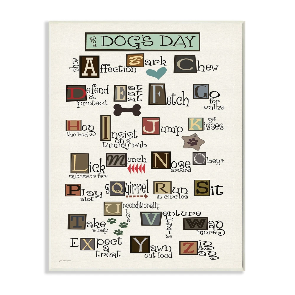 Hang this wrapped piece of wall art near your dog's food bowl or favorite place to sit. This stretched canvas wall art comes to you ready to hang.Canvas art is unframed and ready to hangAnimal-themed medium-sized wall art features a dog's ABCsUnframed rectangular wall art pairs well with contemporary decorMeasures 20 inches high x 16 inches wide x 1 1/2 inches deepMade in the USA Free Shipping Over $49.99* Details Stupell 'All in a Dog's Day ABC' Stretched Canvas Print Wall Art Product Description: Hang this wrapped piece of wall art near your dog's food bowl or favorite place to sit. This stretched canvas wall art comes to you ready to hang. Canvas art is unframed and ready to hang Animal-themed medium-sized wall art features a dog's ABCs Unframed rectangular wall art pairs well with contemporary decor Measures 20 inches high x 16 inches wide x 1 1/2 inches deep Made in the USA