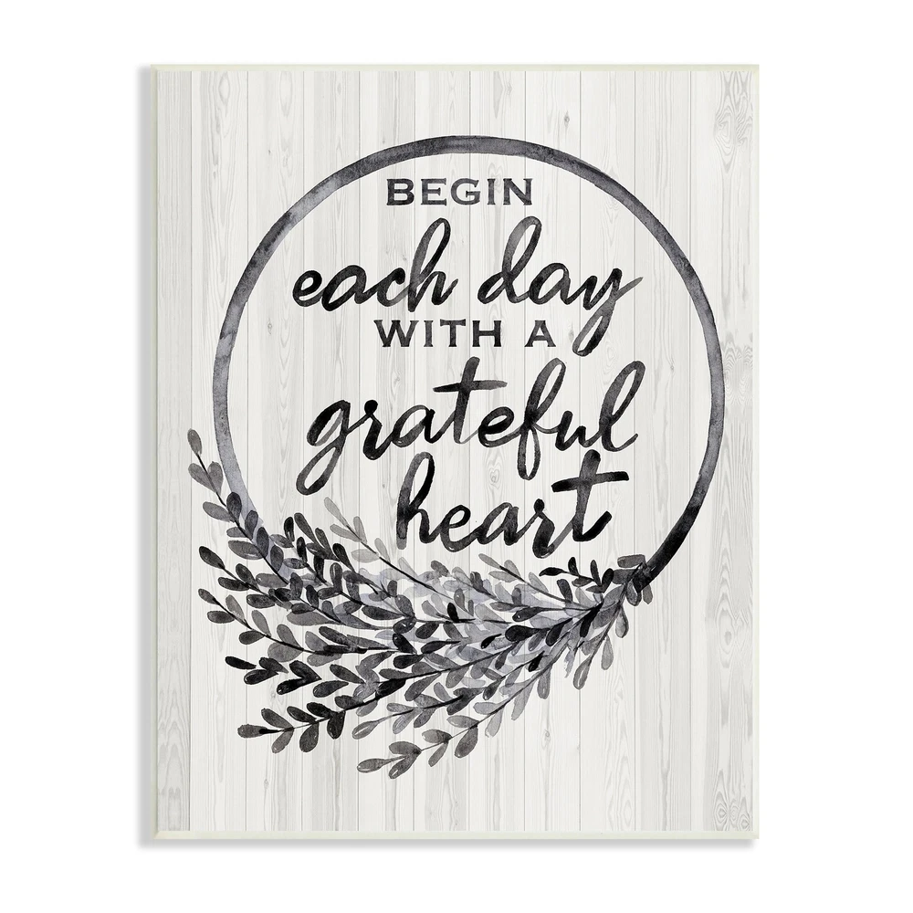 Proudly made in the USA, all of All of our wall plaques start off as high quality lithograph prints that are then mounted on durable 0.5 inch thick MDF wood. Each piece is hand finished and comes with a fresh layer of foil on the sides to give it a crisp clean look. It arrives ready to hang with no installation required, and comes with sturdy clear corners to keep it from damaging in transit.Features:Wall Art is Ready to Hang - No Installation or Hardware Needed. For Easy Set Up Lean or Layer Artwork on Shelf or Against Wall.All of our wall plaques start off as high quality lithograph prints that are then mounted on durable 0.5 inch thick MDF wood. Each piece is hand finished and comes with a fresh layer of foil on the sides to give it a crisp clean look. Made In USA.Artwork Ideal for any Free Shipping Over $49.99* Details Stupell Begin Each Day Grateful Heart Vintage Country Wreath Wood Wall Art - Product Description: Proudly made in the USA, all of All of our wall plaques start off as high quality lithograph prints that are then mounted on durable 0.5 inch thick MDF wood. Each piece is hand finished and comes with a fresh layer of foil on the sides to give it a crisp clean look. It arrives ready to hang with no installation required, and comes with sturdy clear corners to keep it from damaging in transit. Features: Wall Art is Ready to Hang - No Installation or Hardware Needed. For Easy Set Up Lean or Layer Artwork on Shelf or Against Wall. All of our wall plaques start off as high quality lithograph prints that are then mounted on durable 0.5 inch thick MDF wood. Each piece is hand finished and comes with a fresh layer of foil on the sides to give it a crisp clean look. Made In USA. Artwork Ideal for any Living Room, Den, Entryway, Bedroom, Office, Kitchen or Bathroom. Design by Arrolynn Weiderhold